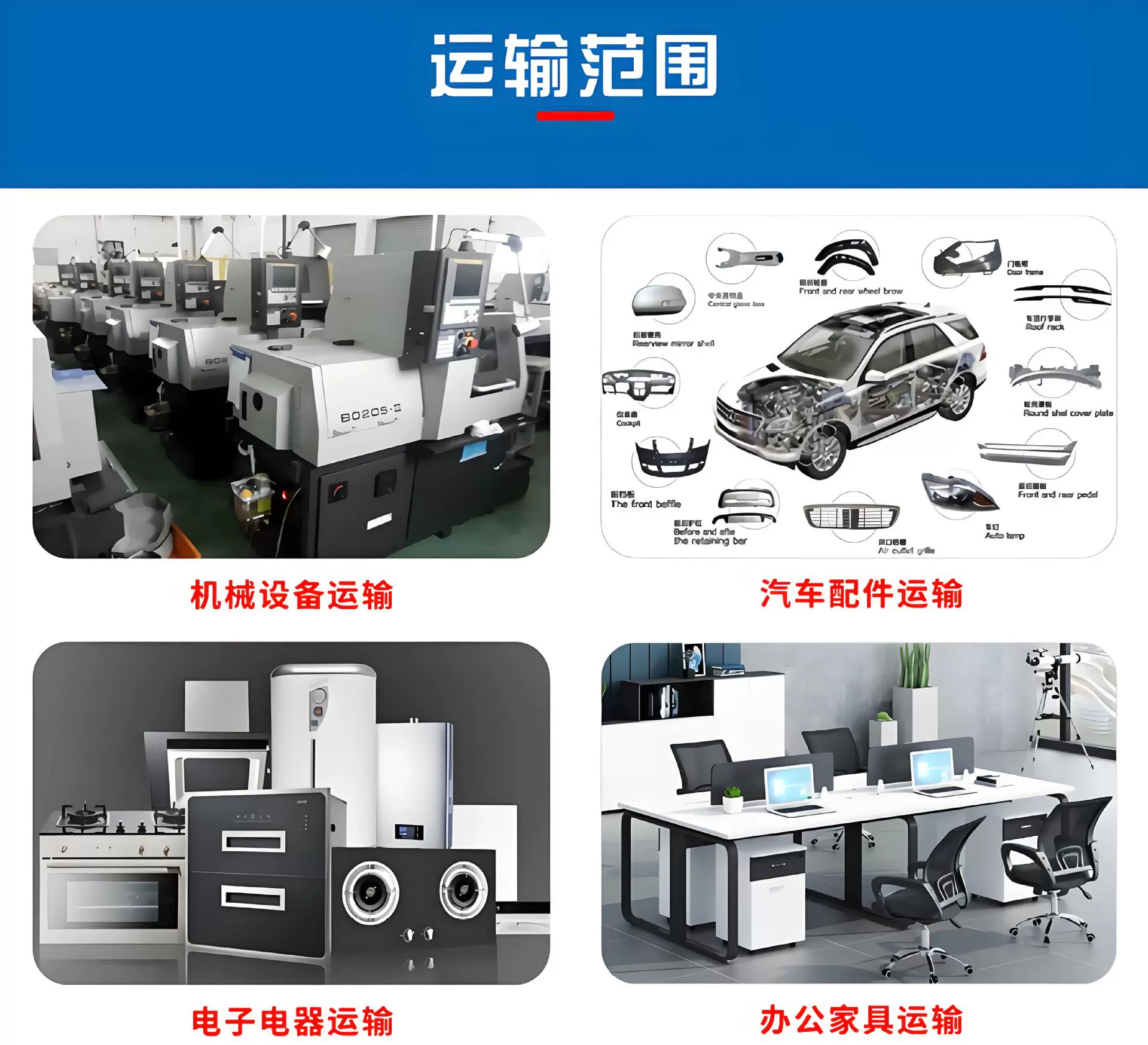 我公司主营国内普通货物运输、干线运输,工业产品物流及配送、大件及特种物流、汽车零部件物流,机械设备物流,工程设备物流、展会物流、电力、电气设备运输数控机床物流,工业设备起重吊装,设备安装,设备搬运盘路、移位,工业产品包装,包装箱制作,空运代理,服务。