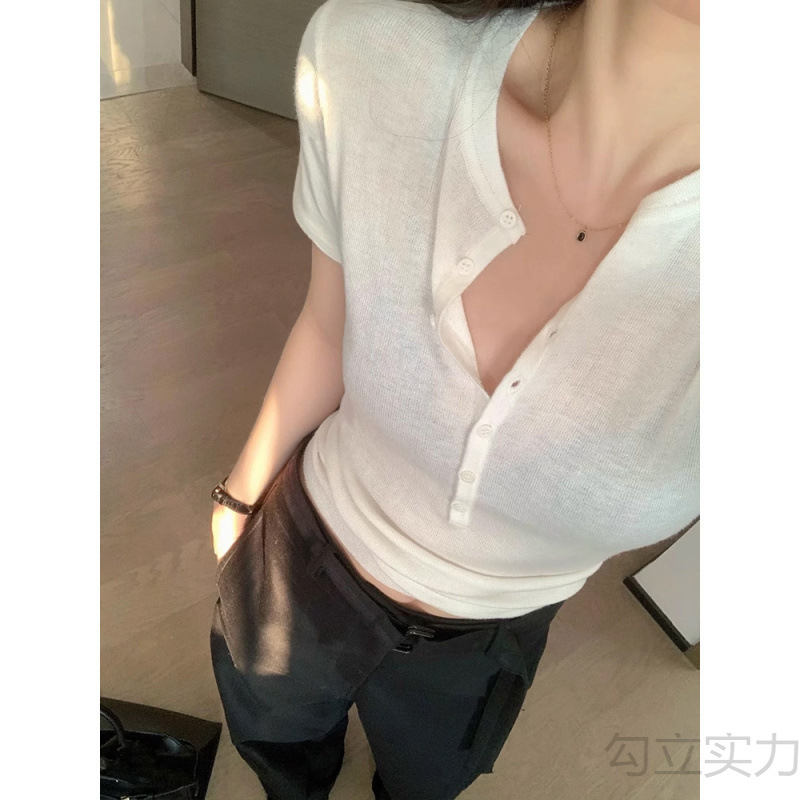 Универсальный вязаный топ с короткими рукавами в стиле Old Money для женщин, приталенный крой, обычные плечи, летняя футболка цвета хаки с v-образным вырезом 2025 года и внутренним слоем из ледяного шелка.