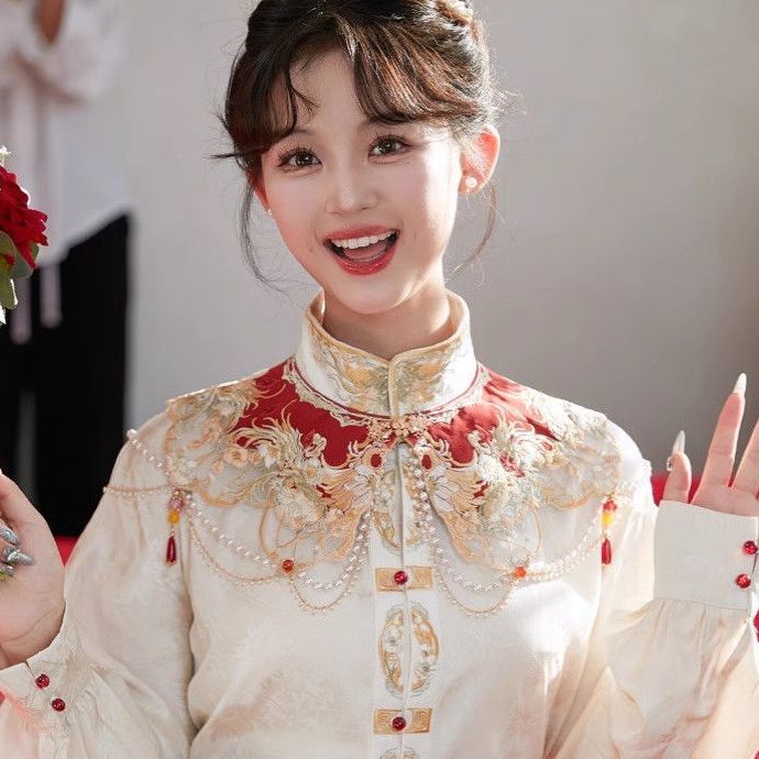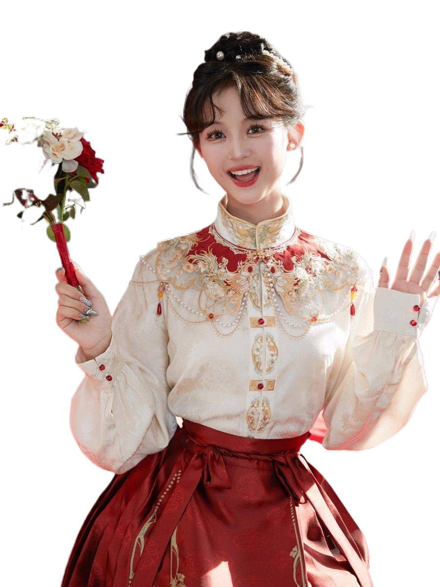 Топ с жаккардовой вышивкой; Облака высокой четкости с кисточками на плечах; Красная юбка с завязками на талии; Белый топ + лошадиная морда; Комплект из четырех предметов [юбка-лошадь + топ + облачные плечи + бесплатная заколка]