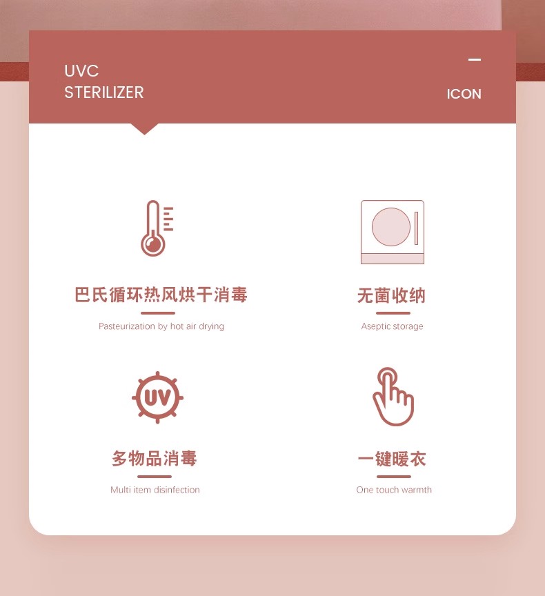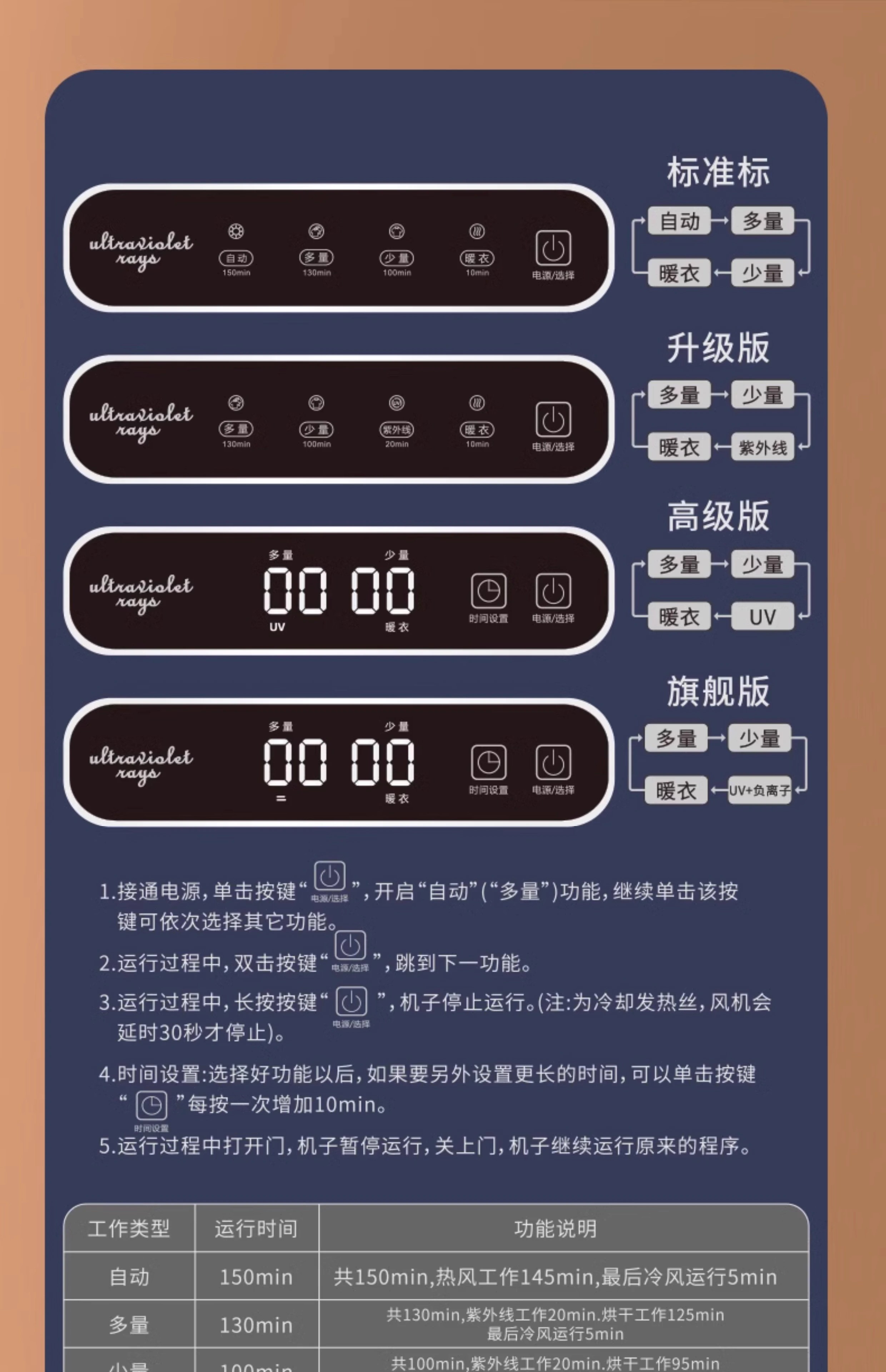 Новый порошок + базовая модель + циркуляционная сушка и стерилизация горячим воздухом; Новый порошок + модернизированная модель + циркуляция горячего воздуха + ультрафиолет; Новый порошок + высокая конфигурация + горячий воздух + УФ + цифровой дисплей; Новый порошок + флагманская модель + горячий воздух + УФ + цифровой дисплей + отрицательные ионы; Базовая модель + циркуляционная сушка и стерилизация горячим воздухом; Модернизированная модель + циркуляция горячего воздуха + ультрафиолетовый свет; Высокая конфигурация + горячий воздух + УФ + цифровой дисплей; Флагманская модель + горячий воздух + УФ + цифровой дисплей + отрицательные ионы