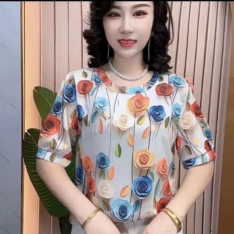 2025 новая летняя рубашка с принтом для мамы, модная и стильная футболка с короткими рукавами для женщин среднего и пожилого возраста, уменьшающая возраст