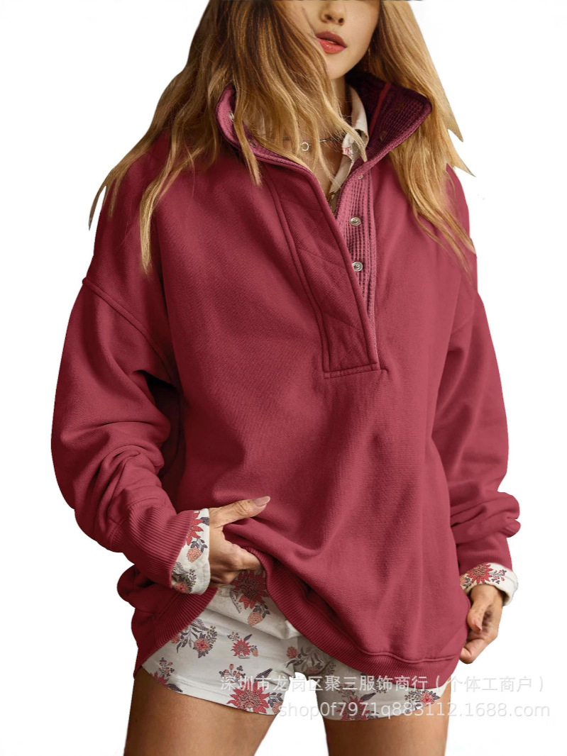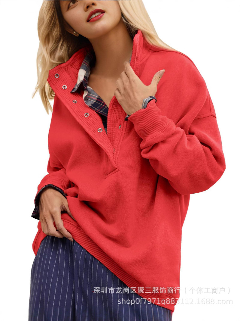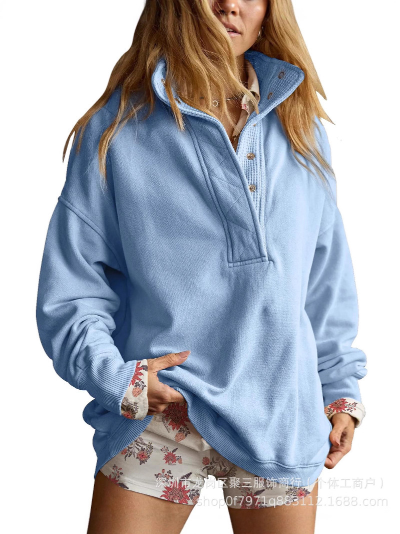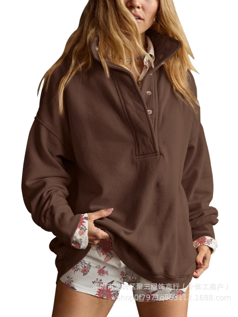 2025速卖通秋冬新款女士圆领纯色纽扣宽松卫衣长袖上衣女