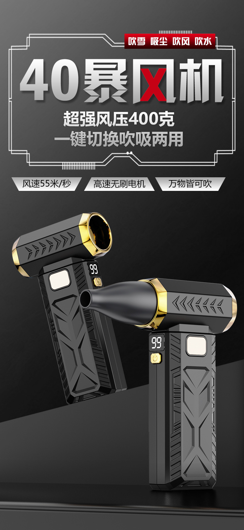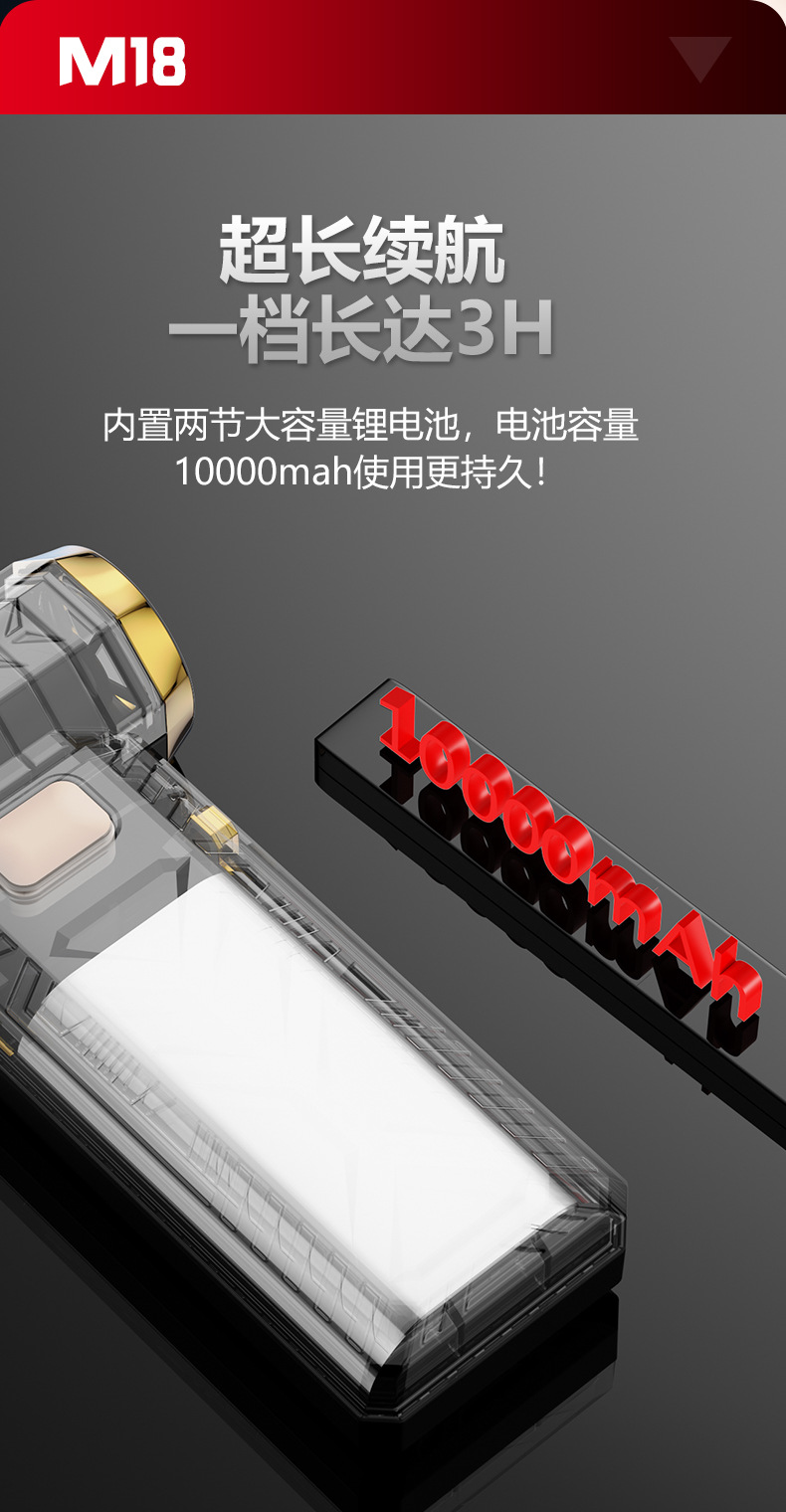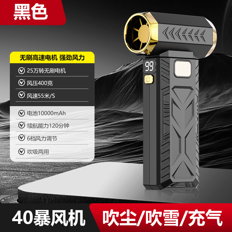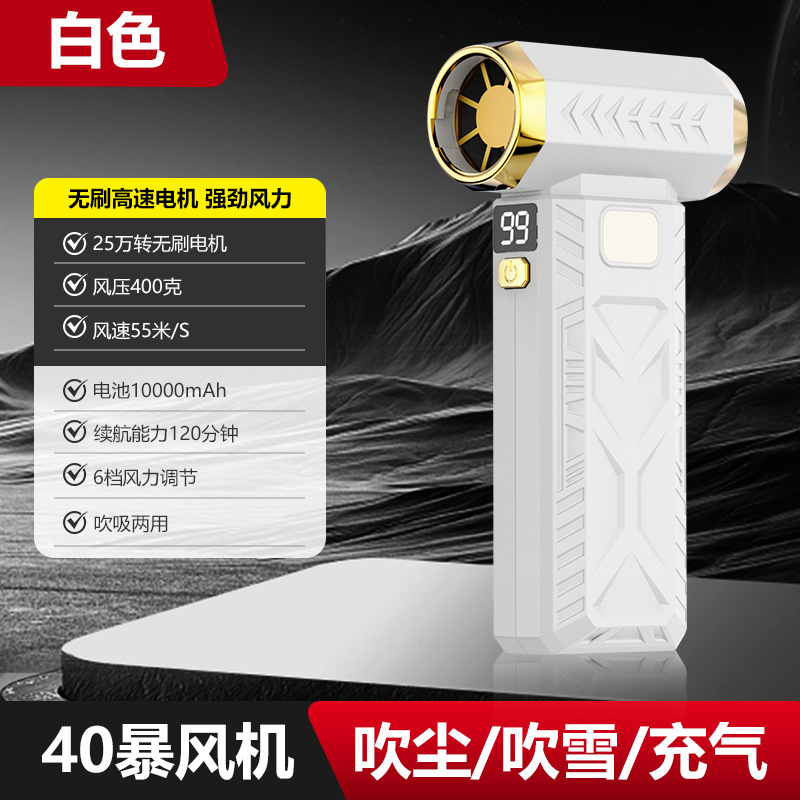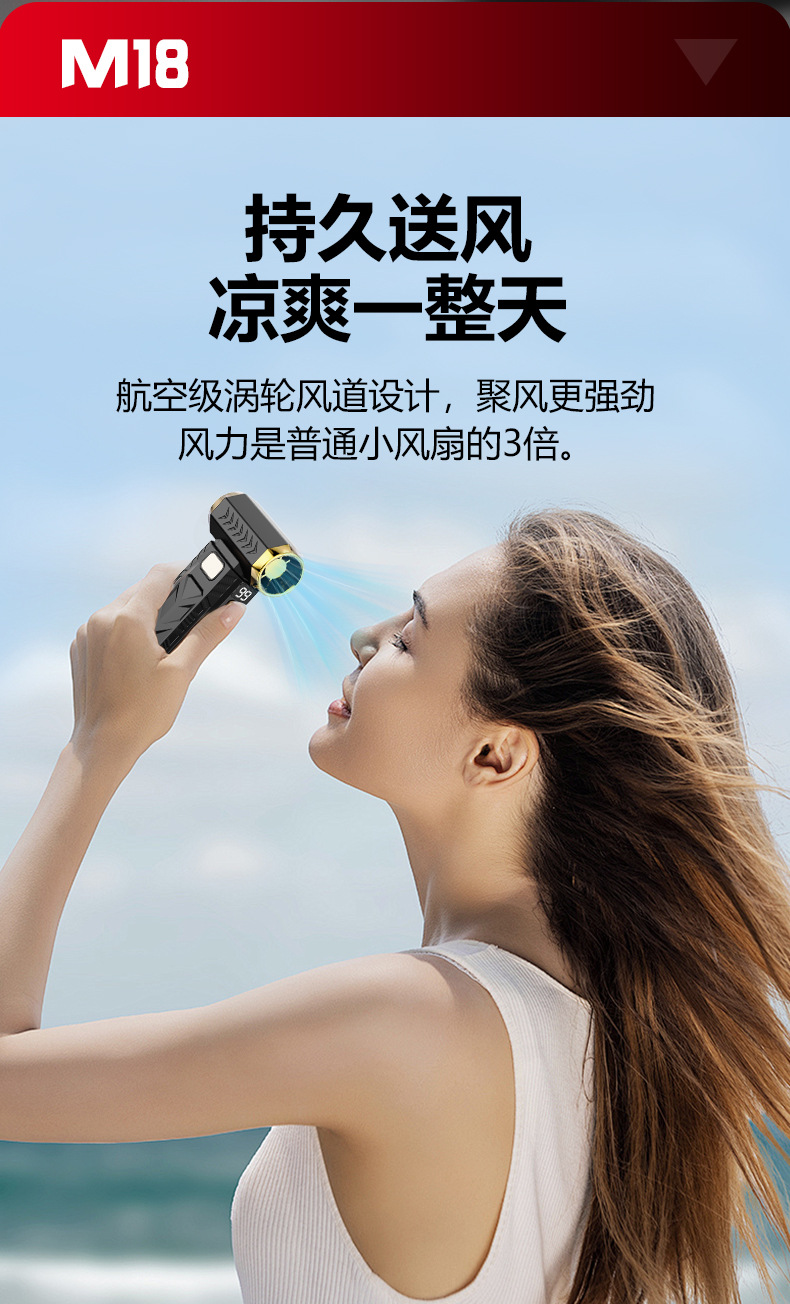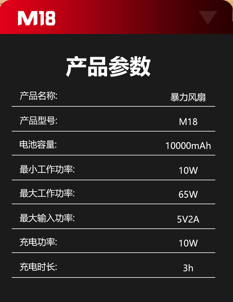 Multifunctional Violent Fan (Set) Model: M18 Motor: Violent Motor Battery Capacity: 6000MAH (Full Capacity) Battery Model: 21700 Speed: 1st gear: 3W RPM/2nd gear: 3.5W RPM/3rd gear: 4W RPM/4th gear: 4.5W RPM/5th gear: 5.5W RPM/6th gear (Violent): 8W RPM Wind Speed: 100000RPM Continuation Time: 1st gear: 3 and a half hours/2nd gear: 3 hours/3rd gear: 2 hours/4th gear: 105 minutes/5th gear: 75 minutes/6th gear (Violent): 30 minutes Charging Time: 3-4 hours Operating Voltage: 7.4V Input Voltage: 5V Current: 2A Product Size: 7.7 * 14.2 * 3.6 cm Net weight: 237.2g Gross weight: 382g Box size: 56 * 36.5 * 33.5cm Packing quantity: 40 Pcs Whole box weight: 16.1 kg(Set)