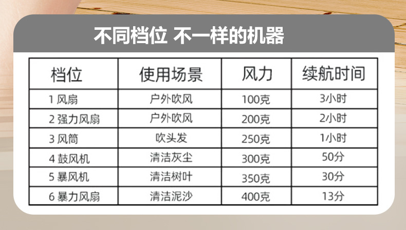 续航时间:1档 :3个半小时/ 2档:3个小时/ 3档:2个小时/ 4档:105分钟/ 5档 :75分钟/6档(暴力):30分钟