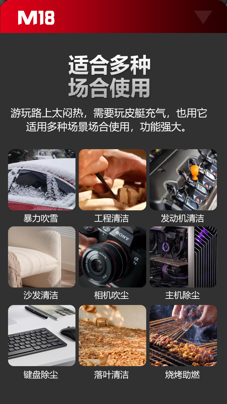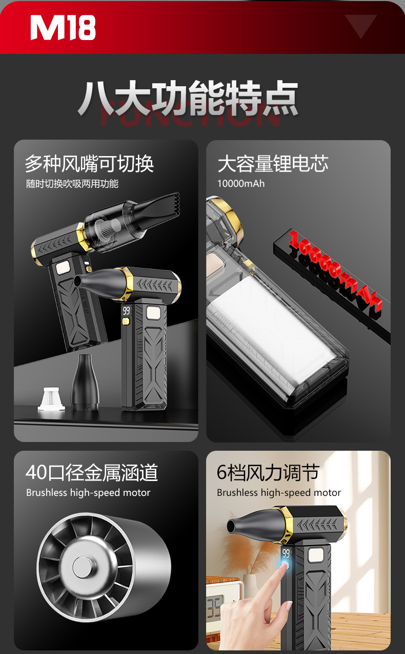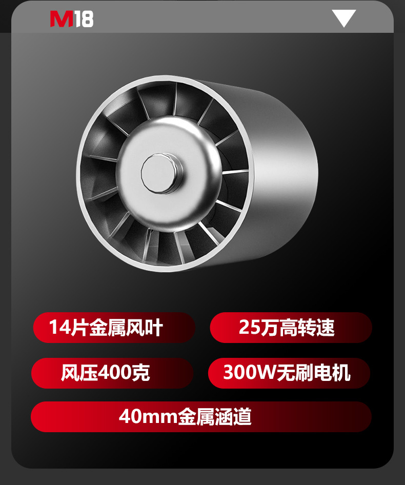 M18【单吹风机+6档调速】; M18【带吸尘器+6档调速】