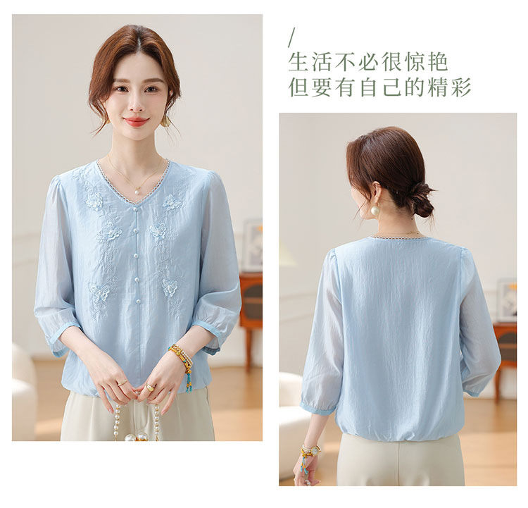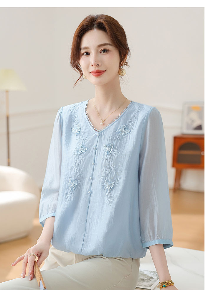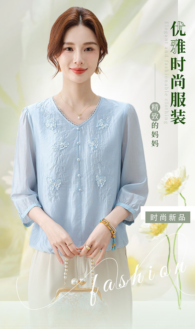 Рубашка с рукавом три четверти, женские летние новые топы с v-образным вырезом для женщин среднего и пожилого возраста, свободные повседневные рубашки для мам с вышивкой