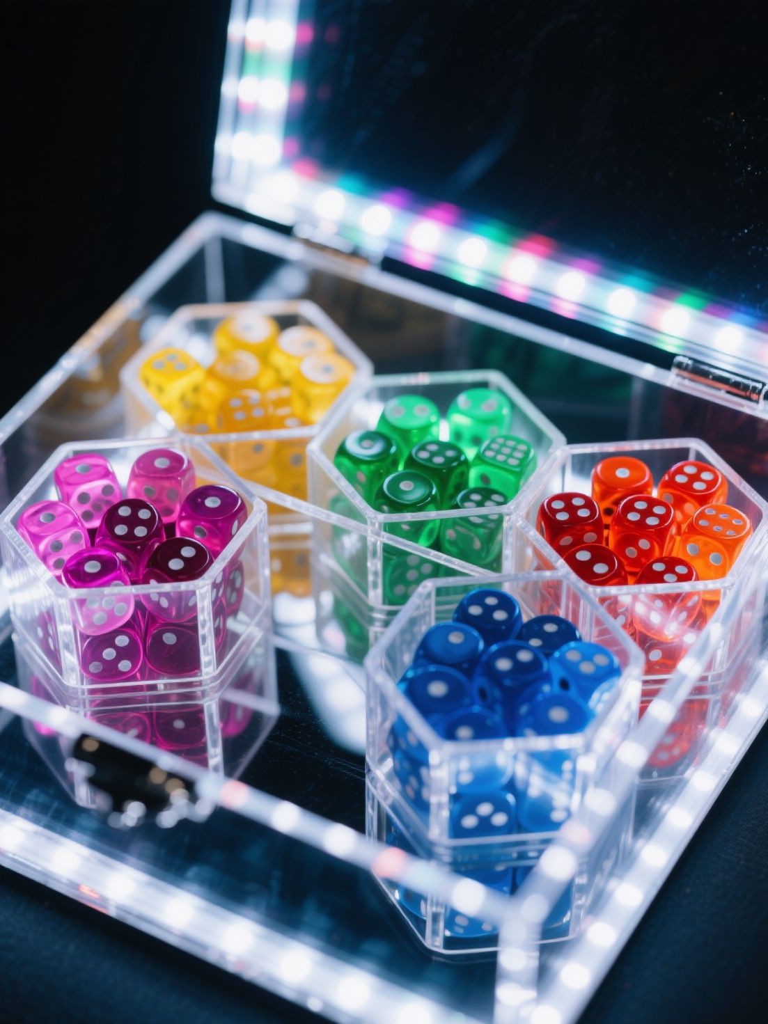 晶莹剔透的外观 骰子采用优质亚克力材质打造,呈现出令人赞叹的高透明度,仿佛将绚丽色彩封印于晶莹晶体之中。每一颗骰子都散发着迷人光泽,不同颜色相互交织,在光线折射下熠熠生辉,为游戏增添了独特的视觉魅力。无论是在明亮的桌游吧,还是温馨的家庭聚会中,它都能成为众人瞩目的焦点。
