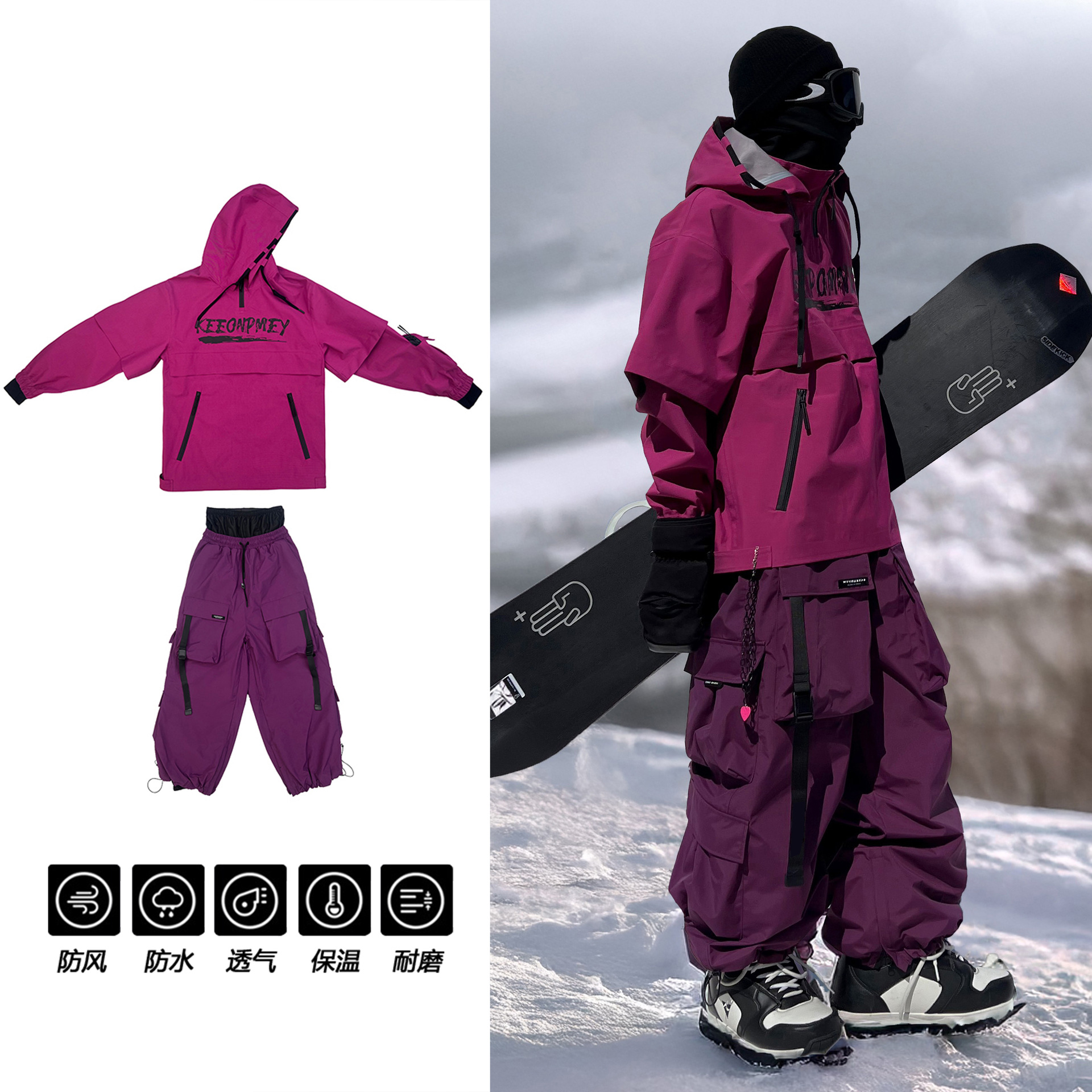 2025新款美式户外滑雪服套装运动连帽宽松防水滑雪套装裤子+外套