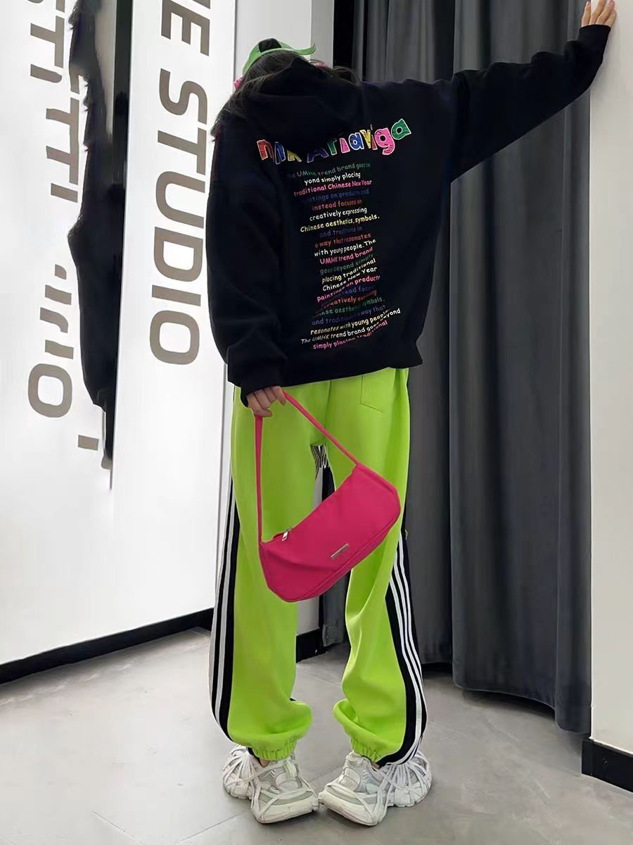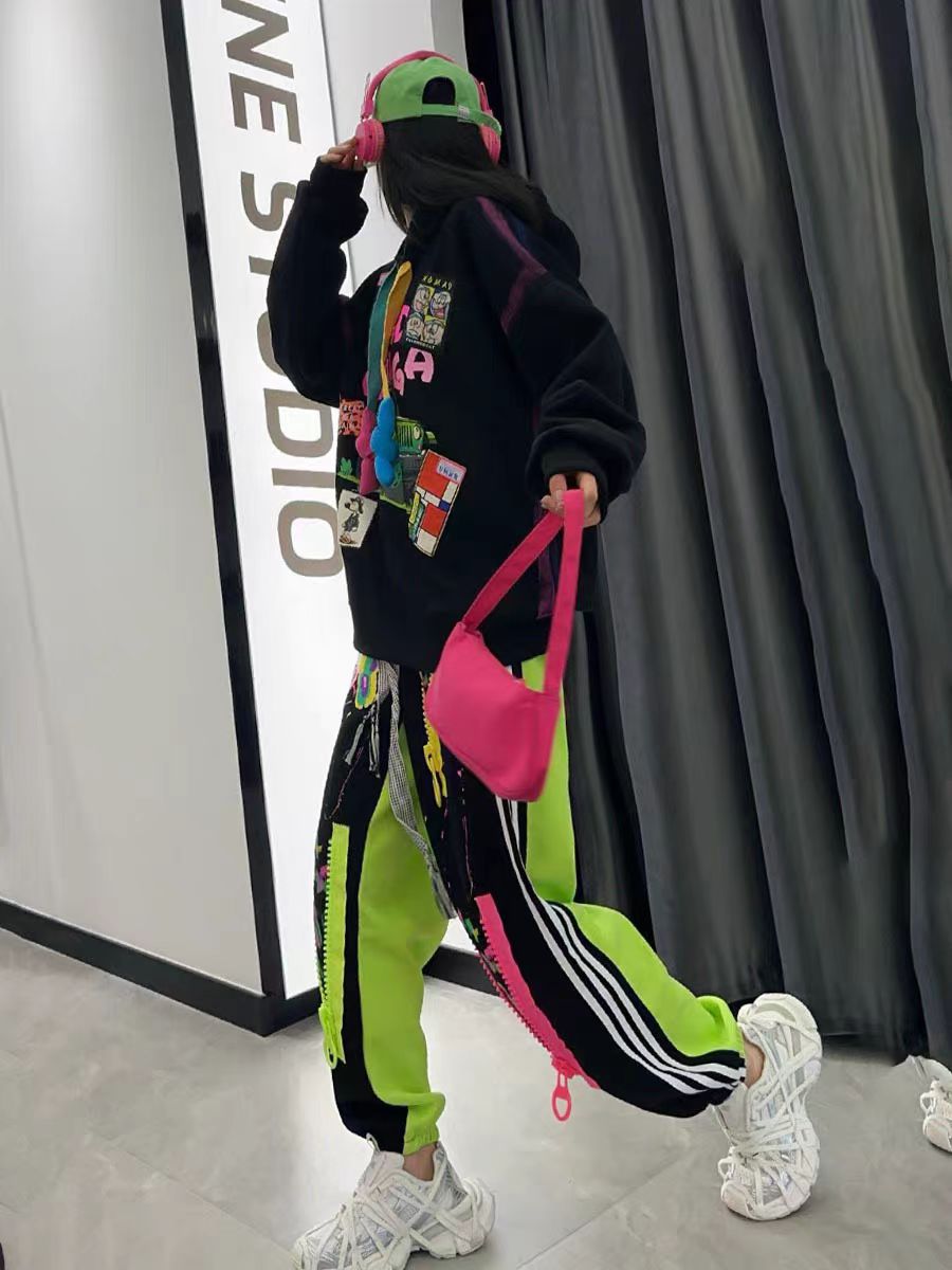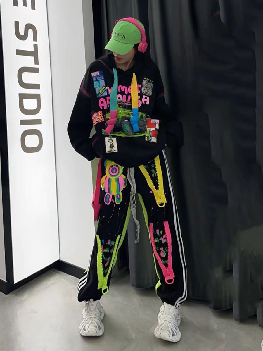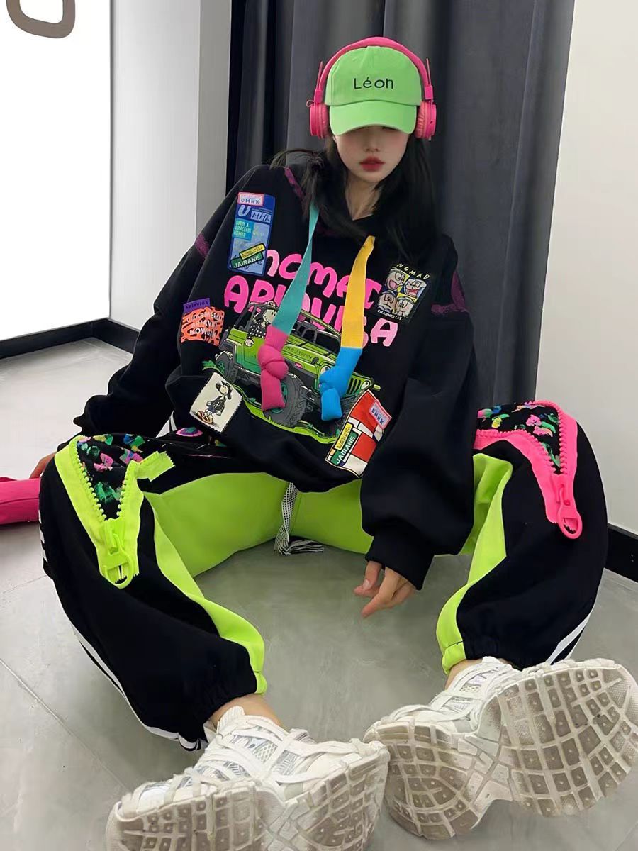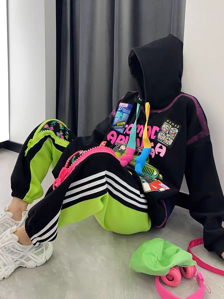 潮牌街头嘻哈风宽松时髦chic拼色连帽卫衣卫裤两件套休闲运动套装