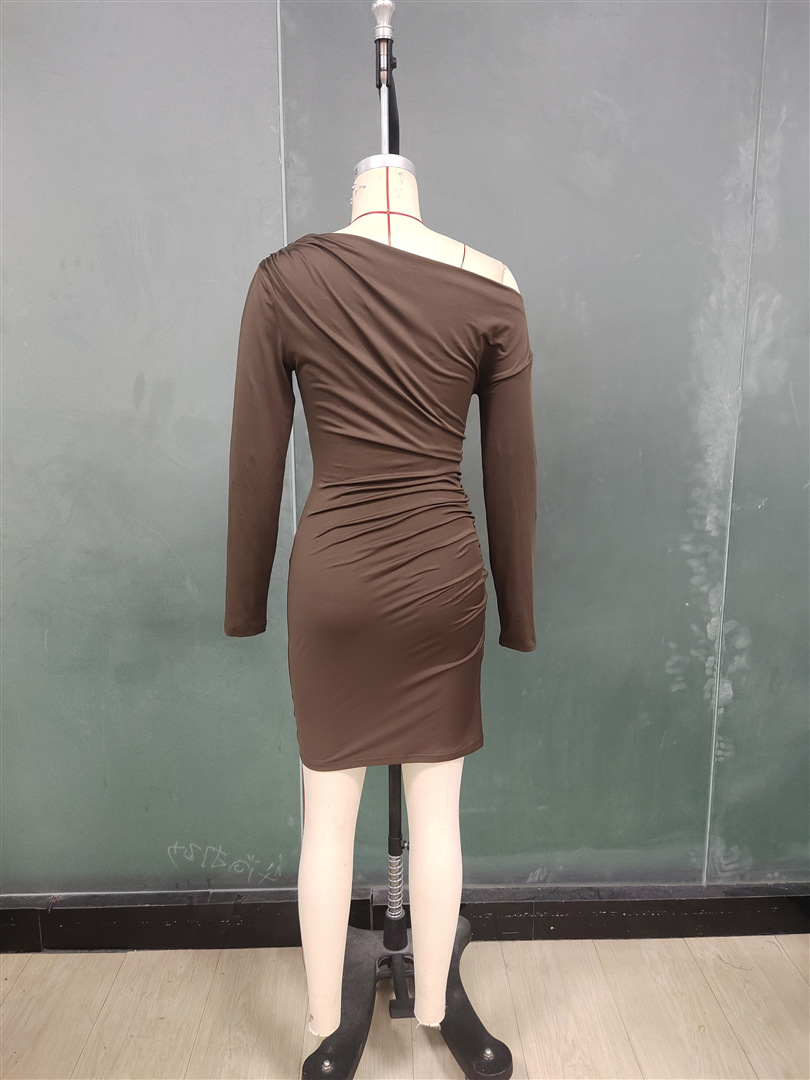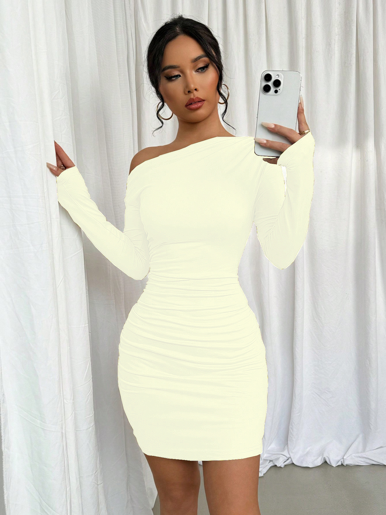 Трансграничный экспорт в Европу и Америку, однотонное тонкое платье, осень 2025, новая юбка с косыми плечами и длинными рукавами, женская одежда