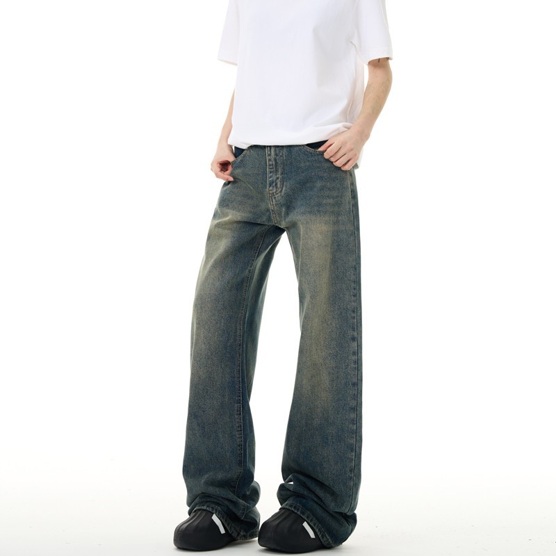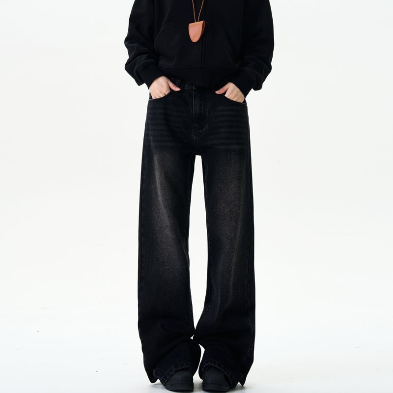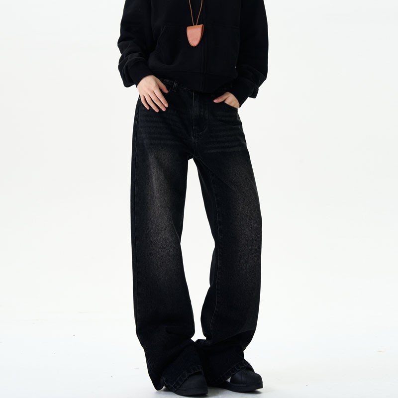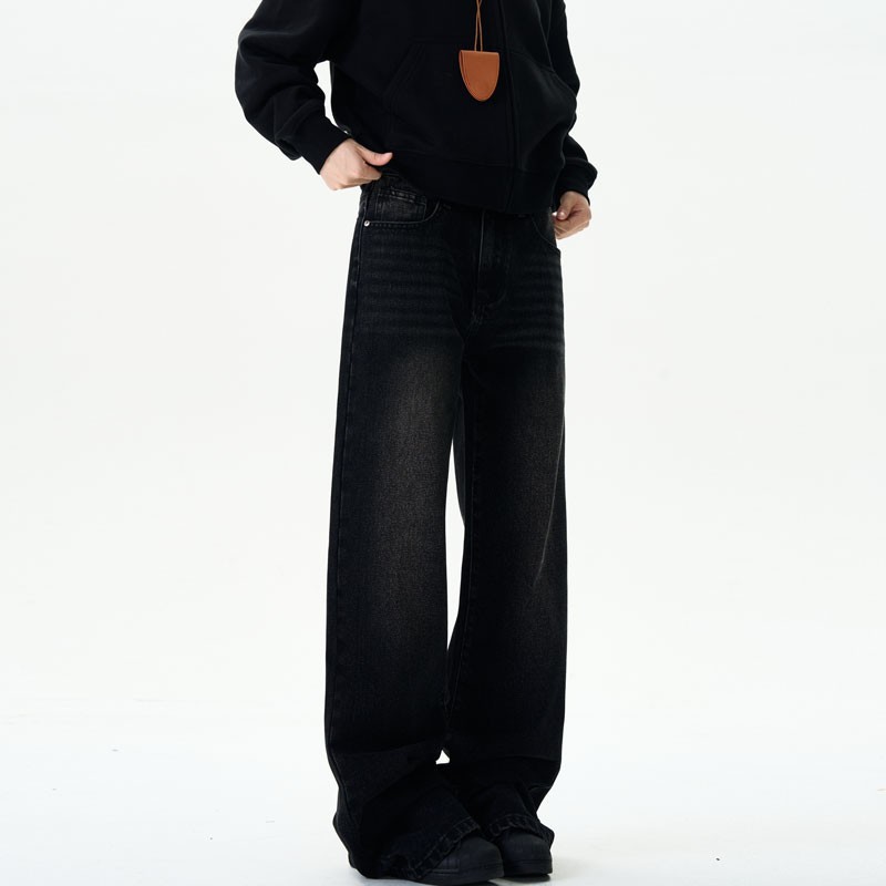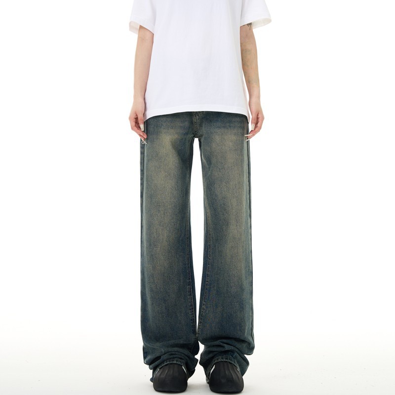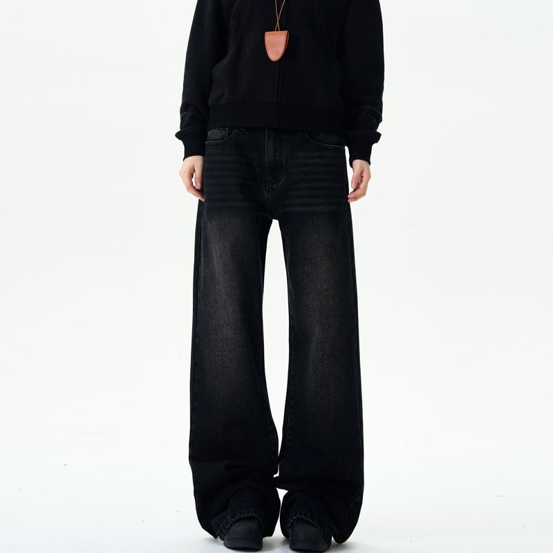 美式复古牛仔裤男女新款深色高街水洗做旧高腰阔腿宽松直筒裤子潮