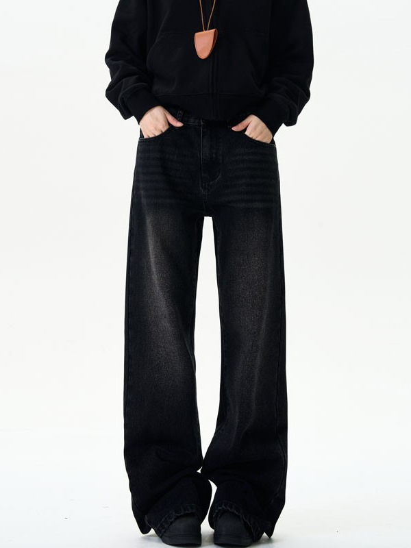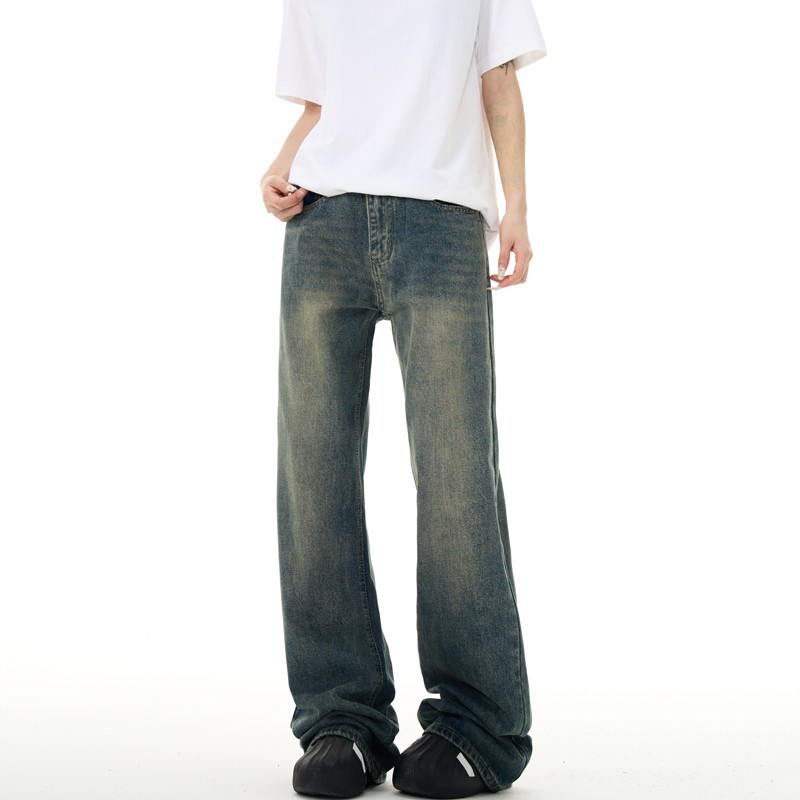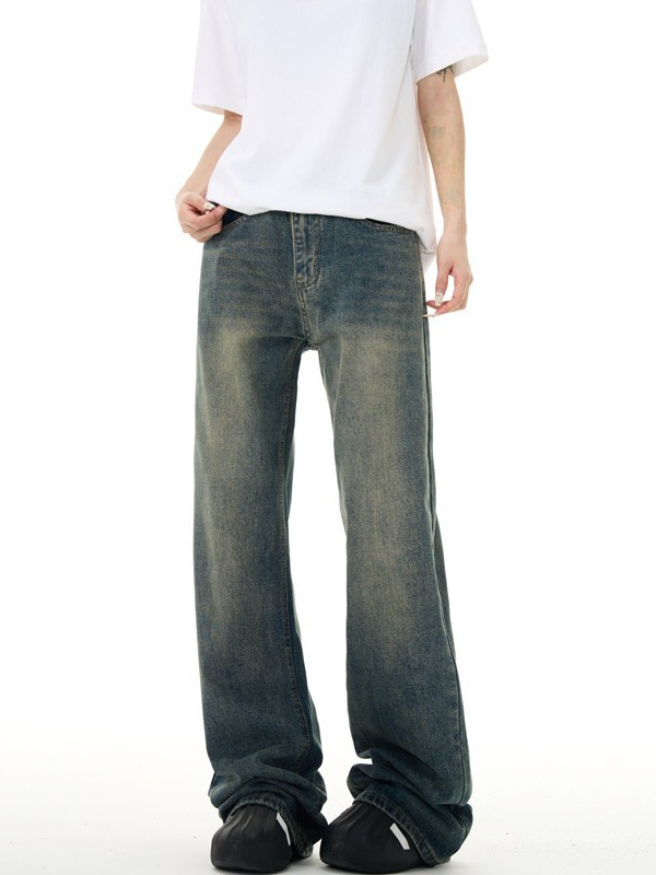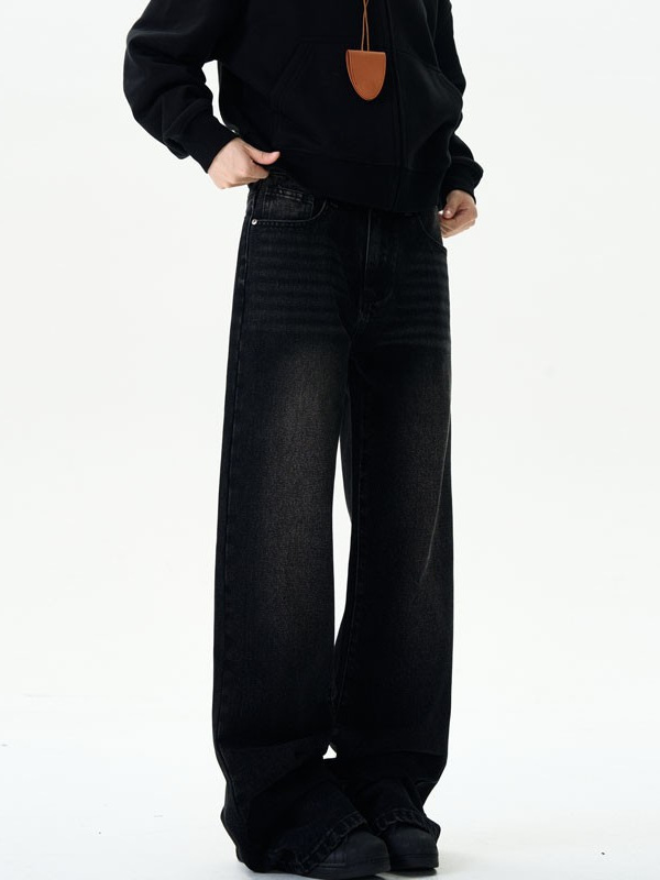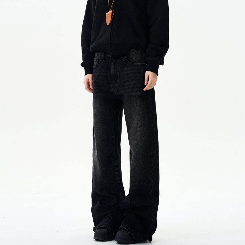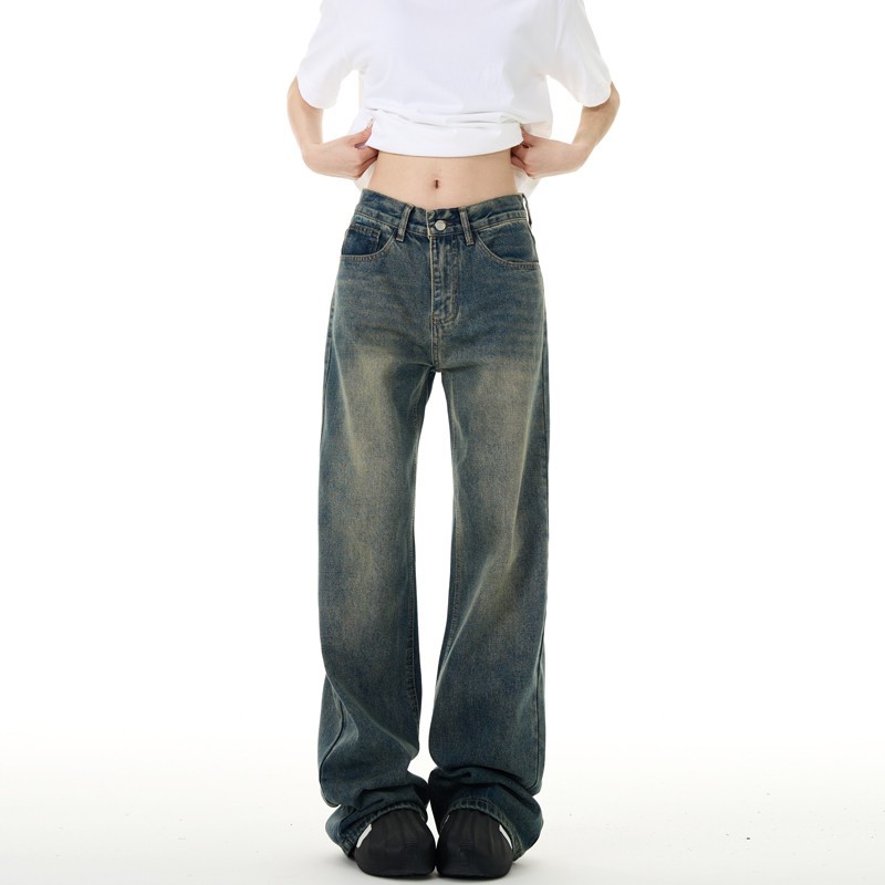 美式复古牛仔裤男女新款深色高街水洗做旧高腰阔腿宽松直筒裤子潮