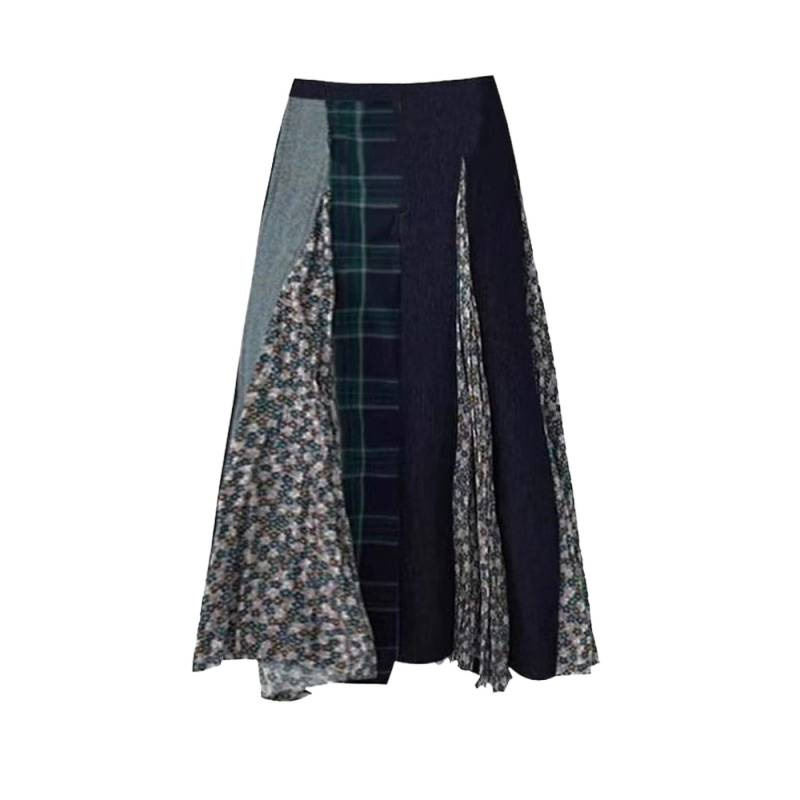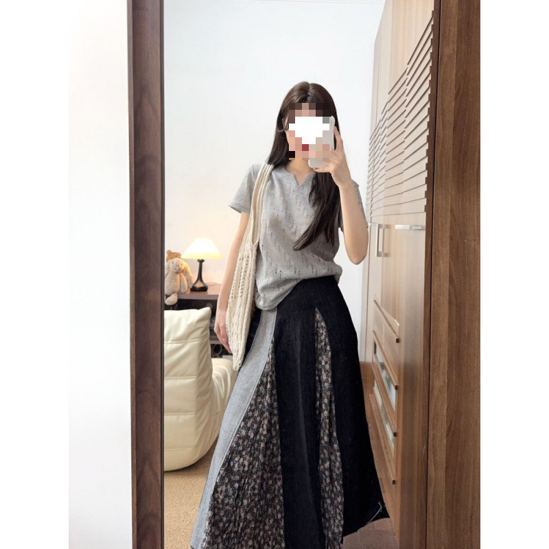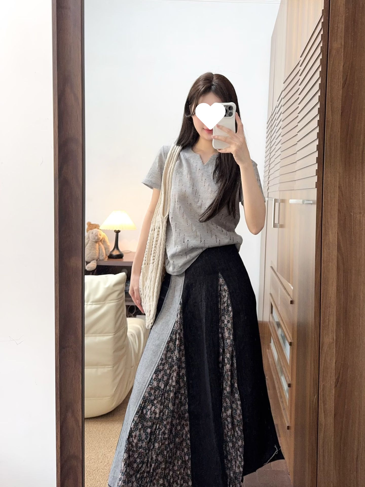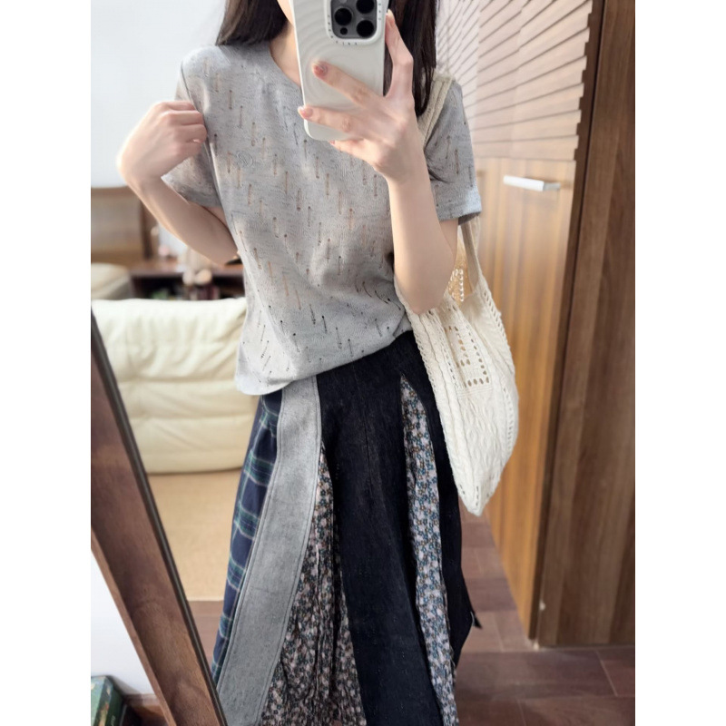 灰色镂空上衣; 拼接牛仔半身裙; 上衣+半身裙