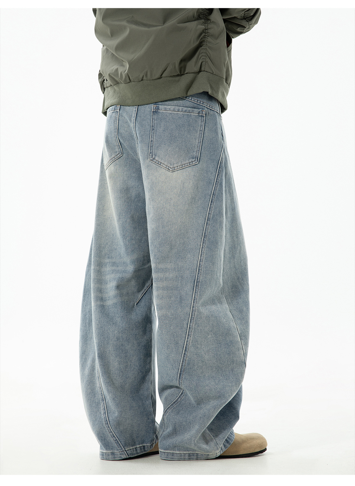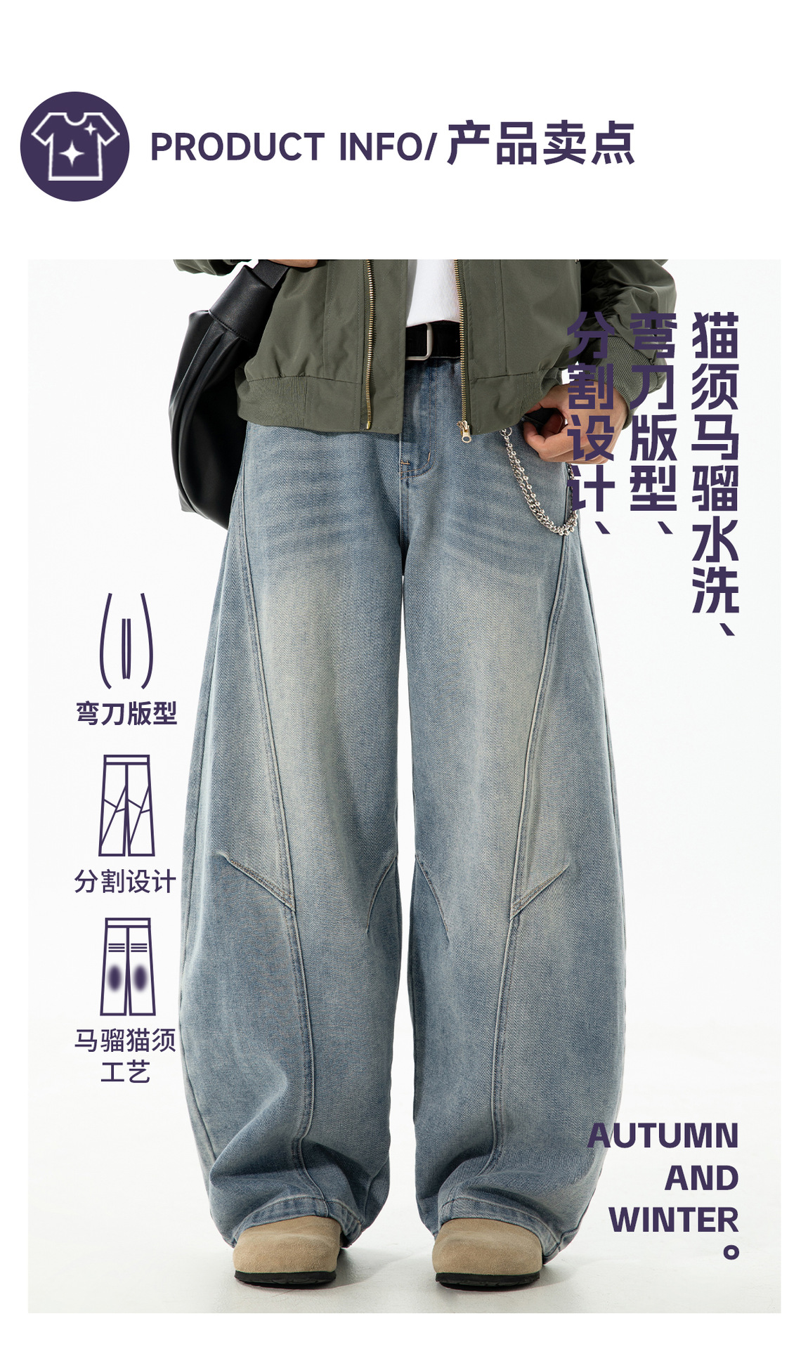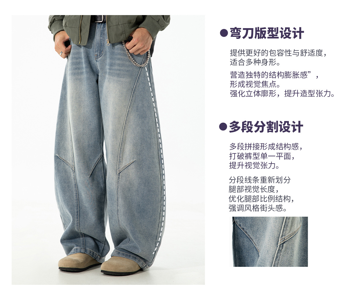 结构分割水洗做旧弯刀牛仔裤男秋季款廓形宽松潮牌复古直筒长裤子