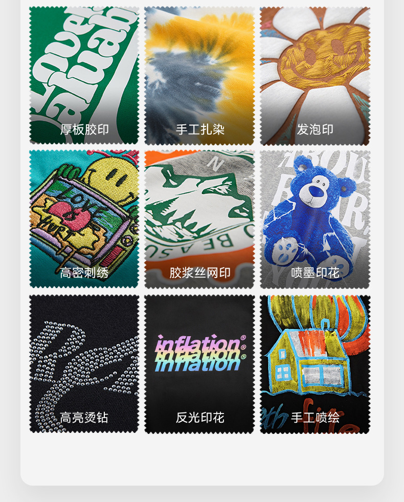 钉珠; 刺绣; 水洗; 做旧; 褶皱; 提花; 拼接; 梭织; 抽褶; 压褶; 手工磨破