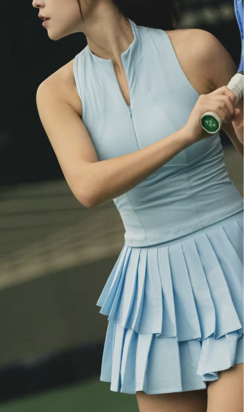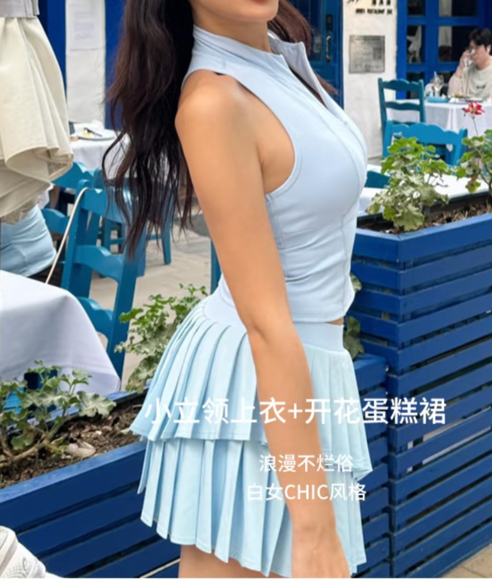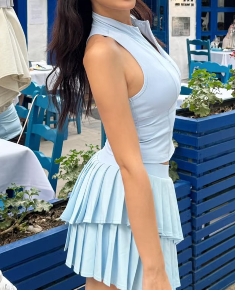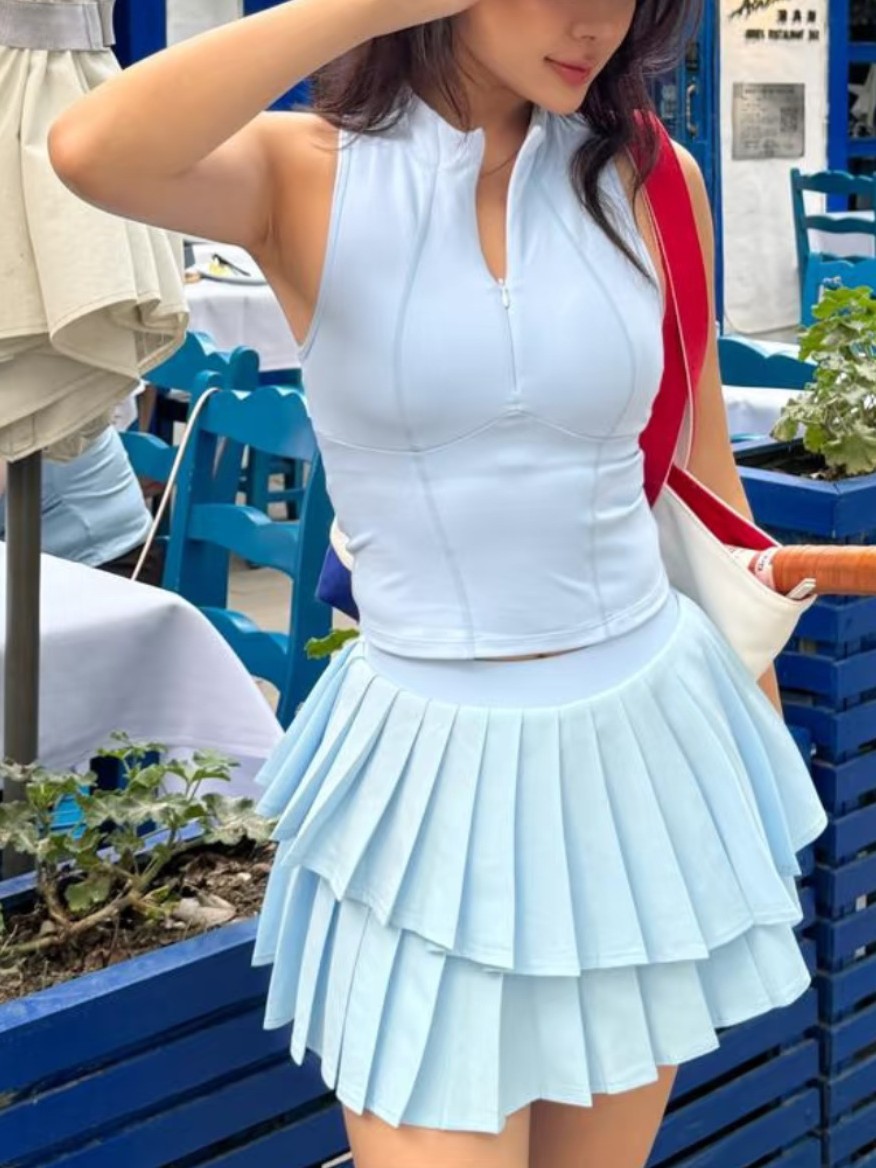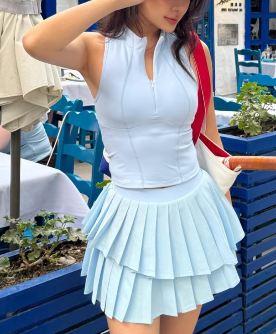 Кремово-желтый топ; небесно-голубой верх; Кремовая плиссированная юбка; небесно-голубая плиссированная юбка