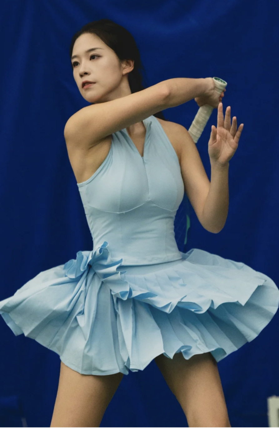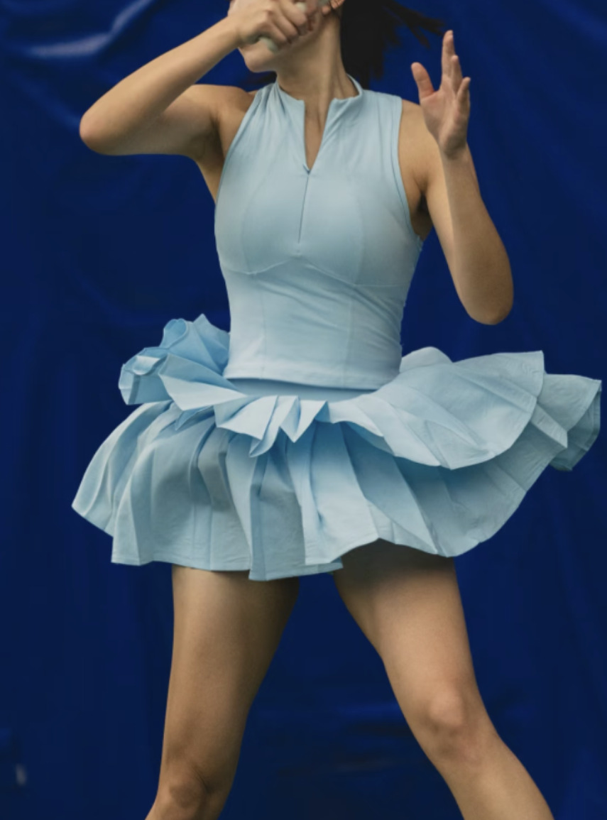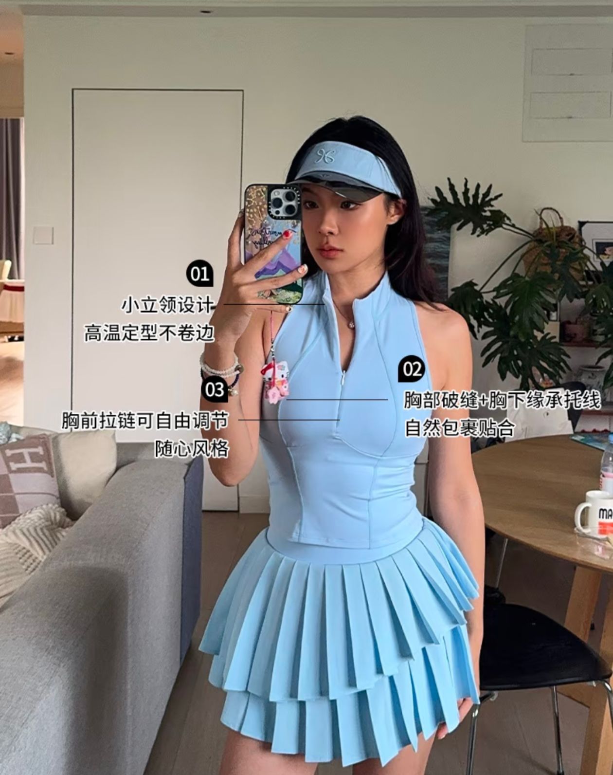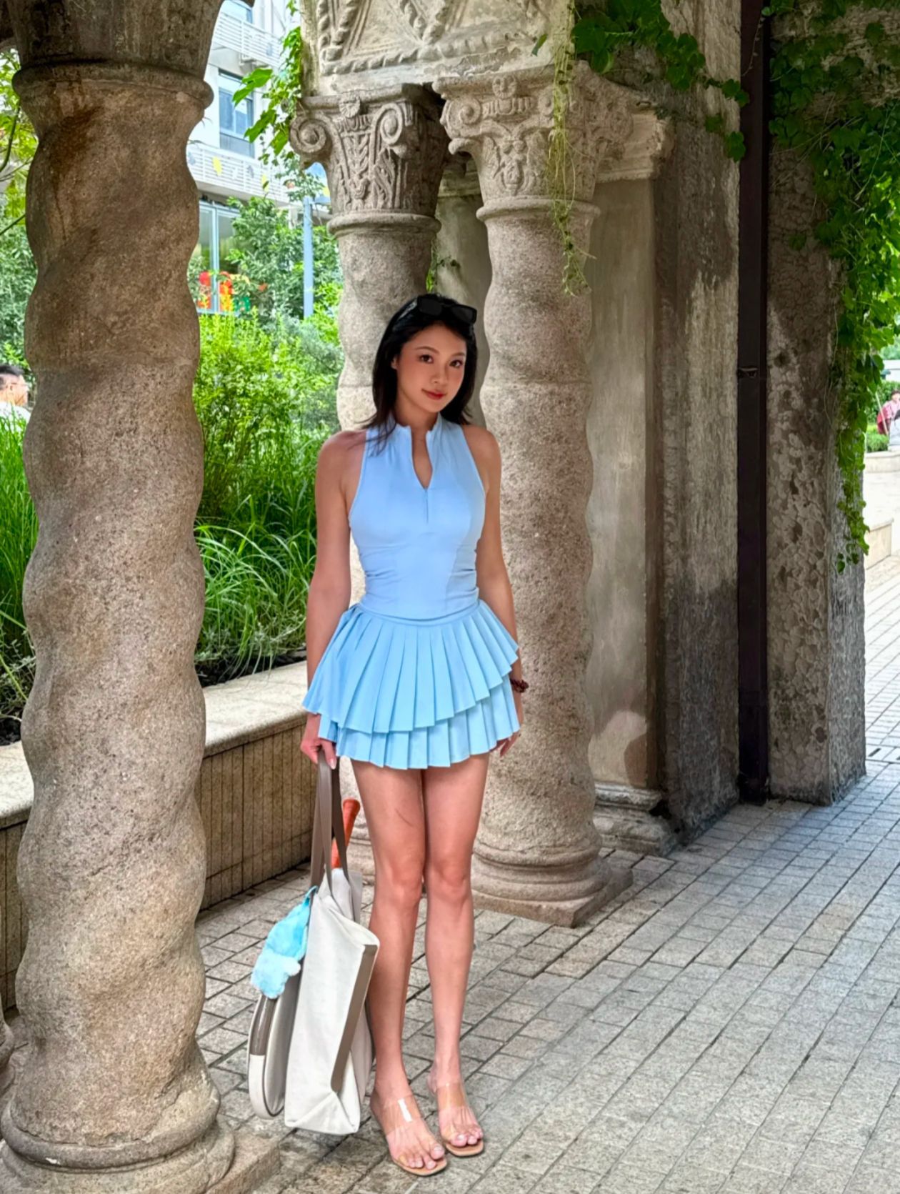 Кремово-желтый топ; небесно-голубой верх; Кремовая плиссированная юбка; небесно-голубая плиссированная юбка