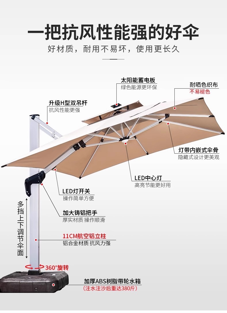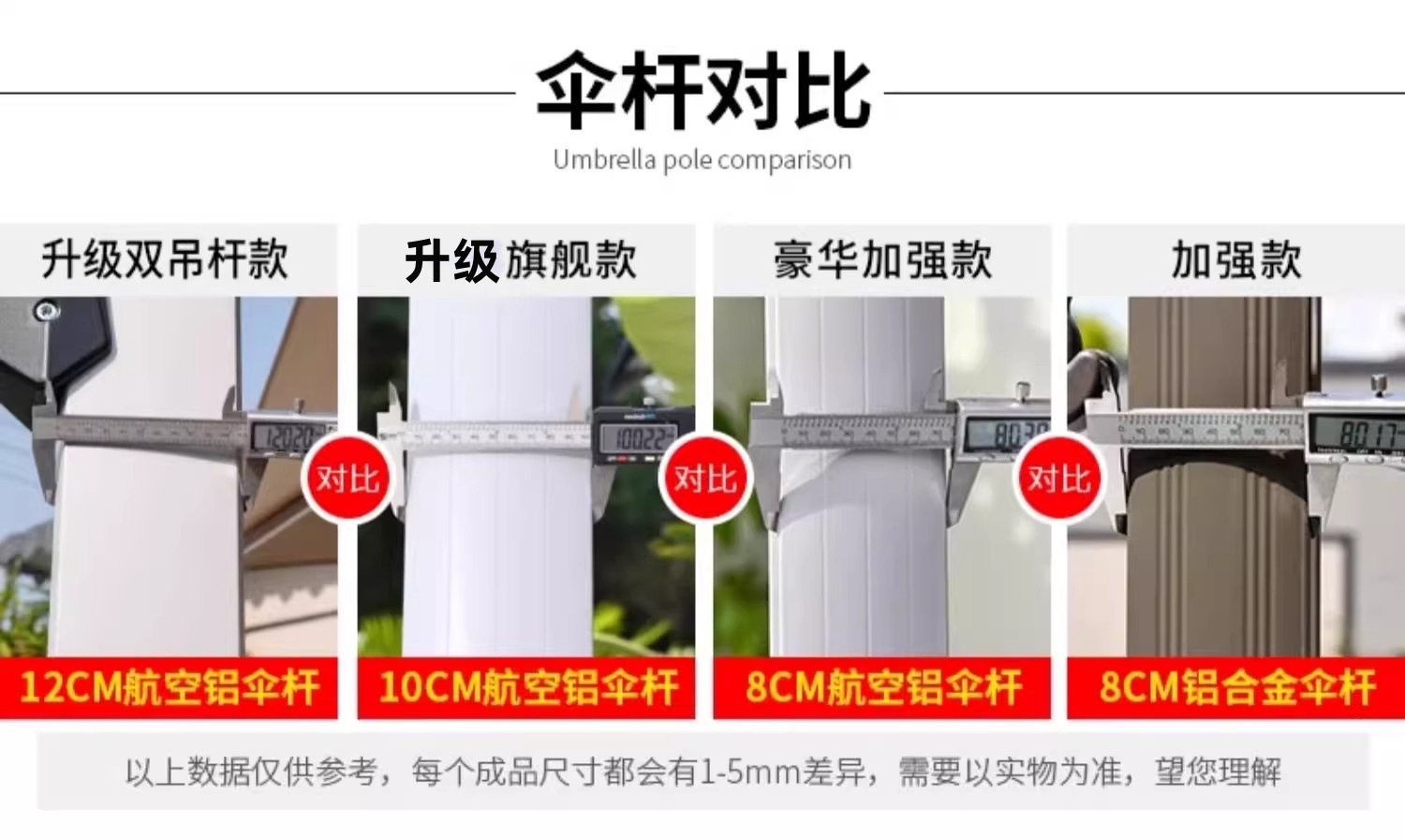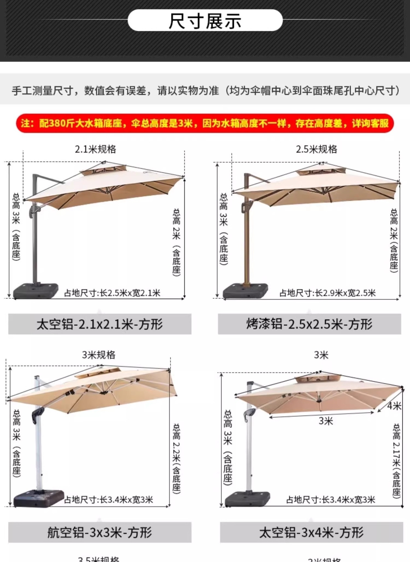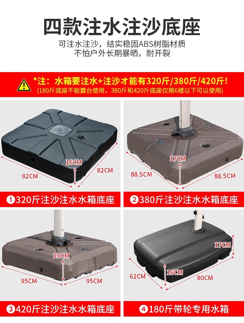 特价基础款/2.2米不含底座/不带灯; 特价基础款/2.2米+160斤水箱底座/无灯; 特价基础款/2.5米+160斤水箱底座/无灯; 特价基础款/3米圆形+160斤水箱底座/无灯; 特价基础款/3米方形+160斤水箱底座/无灯; 升级金典款/2.5米+300斤水箱底座/无灯; 升级金典款/2.5米+380斤水箱底座/无灯; 升级金典款/3米+300斤水箱底座/无灯; 升级金典款/3米+380斤水箱底座/无灯; 质保5年/8CM航空铝双杆豪华款/2.5米+300斤底座/无灯; 质保5年/8CM航空铝双杆豪华款/2.5米+380斤底座/无灯; 质保5年/8CM航空铝双杆豪华款/3米+300斤底座/无灯; 质保5年/8CM航空铝双杆豪华款/3米+380斤底座/无灯; 质保5年/10CM航空铝双杆旗舰款/2.5米+420斤底座/无灯; 质保5年/10CM航空铝双杆旗舰款/3米+420斤底坐/无灯; 质保5年/10CM航空铝双杆旗舰款/3.5米+420斤底坐/无灯; 质保5年/10CM航空铝双杆旗舰款/3*4米+420斤底坐/无灯; 质保5年/8CM航空铝双杆豪华款/2.5米+300斤底座(伞骨全亮LED太阳能); 质保5年/8CM航空铝双杆豪华款/2.5米+380斤底座(伞骨全亮LED太阳能); 质保5年/8CM航空铝双杆豪华款/3米+300斤底座(伞骨全亮LED太阳能); 质保5年/8CM航空铝双杆豪华款3米+380斤底座(伞骨全亮LED太阳能); 质保5年/10CM航空铝双杆旗舰款/2.5米+380斤底座(伞骨全亮LED太阳能); 质保5年/10CM航空铝双杆旗舰款/3米+420斤底座(伞骨全亮LED太阳能); 质保5年/10CM航空铝双杆旗舰款/3.5米+420斤底座(伞骨全亮LED太阳能); 质保5年/10CM航空铝双杆旗舰款/3*4米+420斤底座(伞骨全亮LED太阳能); 质保5年/12CM航空铝双杆至尊款/3米+420斤底座(伞骨全亮LED太阳能); 质保5年/12CM航空铝双杆至尊款/3.5米+420斤底座(伞骨全亮LED太阳能); 质保5年/双杆至尊款/12CM航空铝3*4米+420斤底座伞骨全亮LED太阳能); 质保5年/12CM航空铝双杆至尊款/3米+420斤底座/无灯; 质保5年/12CM航空铝双杆至尊款/3.5米+420斤底座/无灯; 质保5年/12CM航空铝双杆至尊款/3*4米+420斤底座/无灯