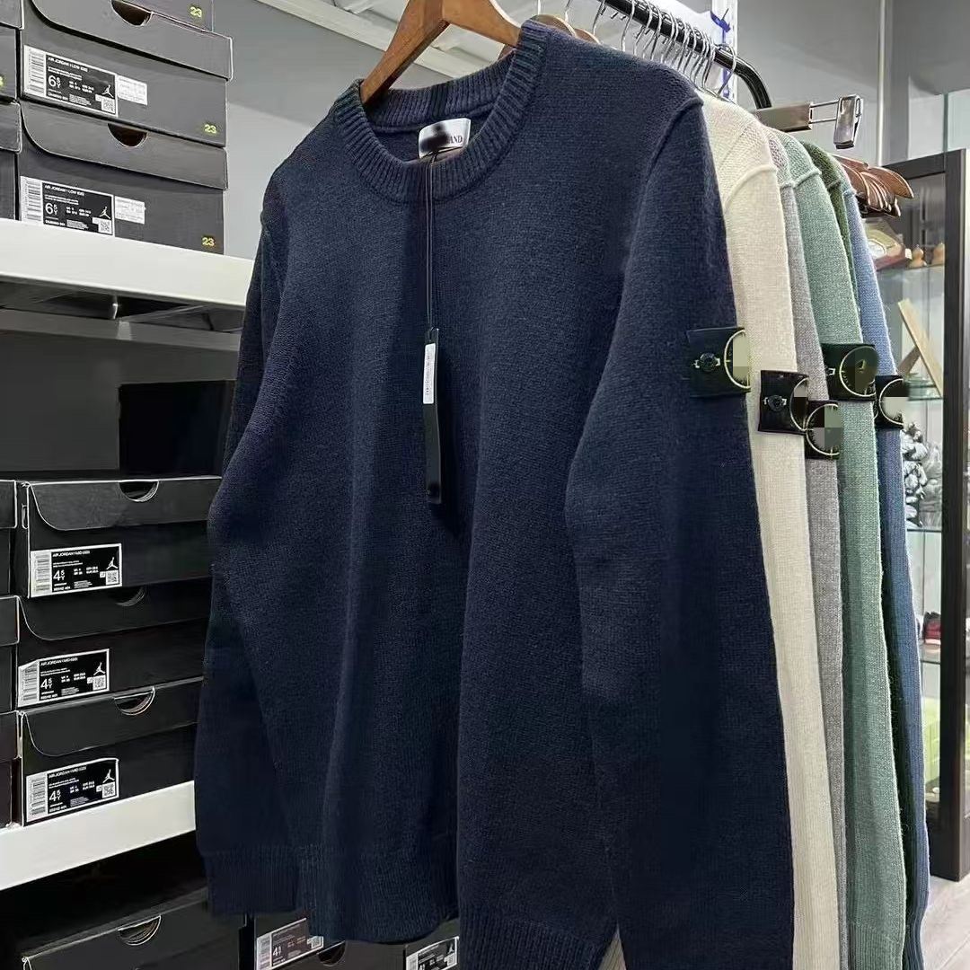跨境欧美潮流圆领Stone石头侧标袖标毛衣秋冬保暖情侣套头长毛衣