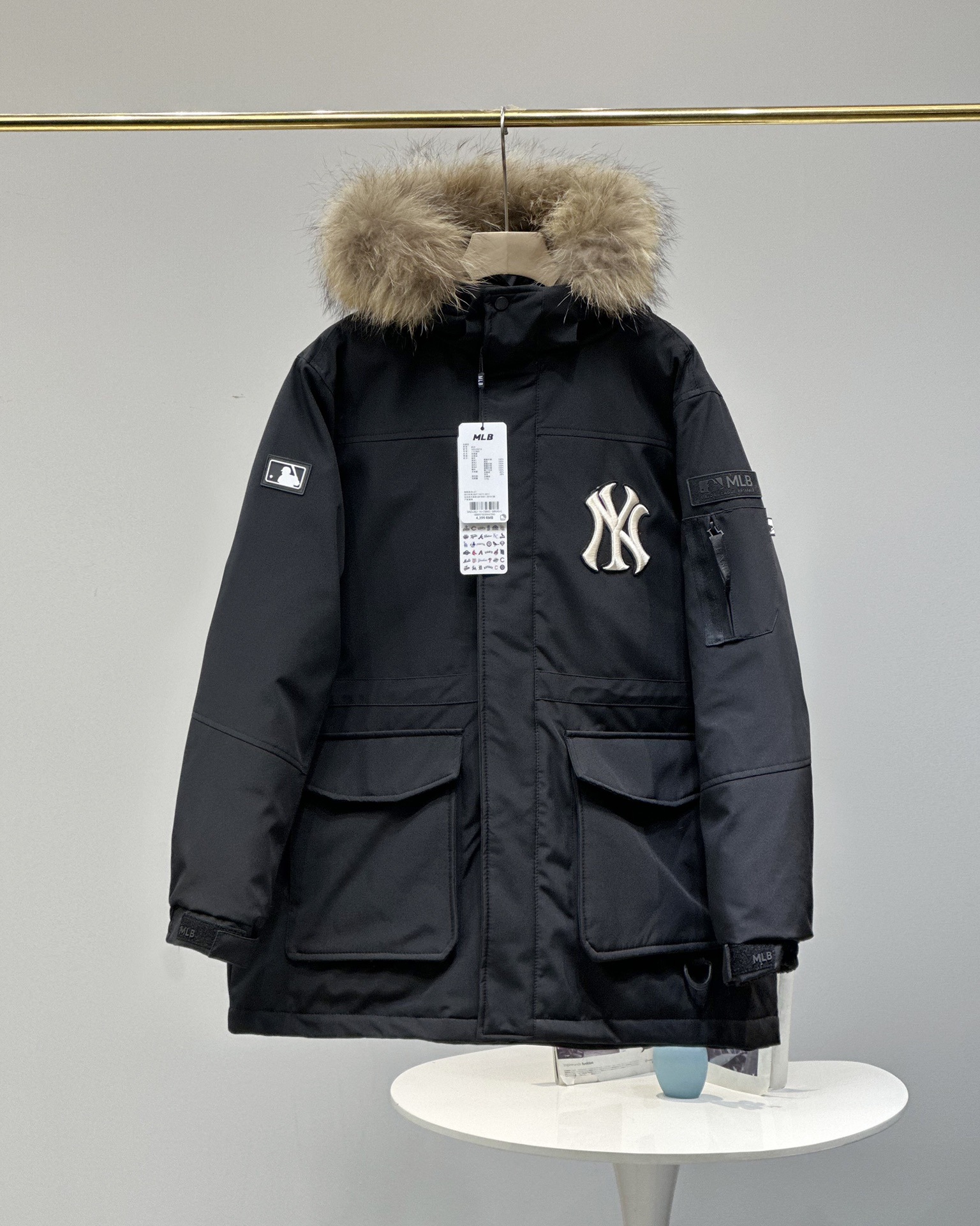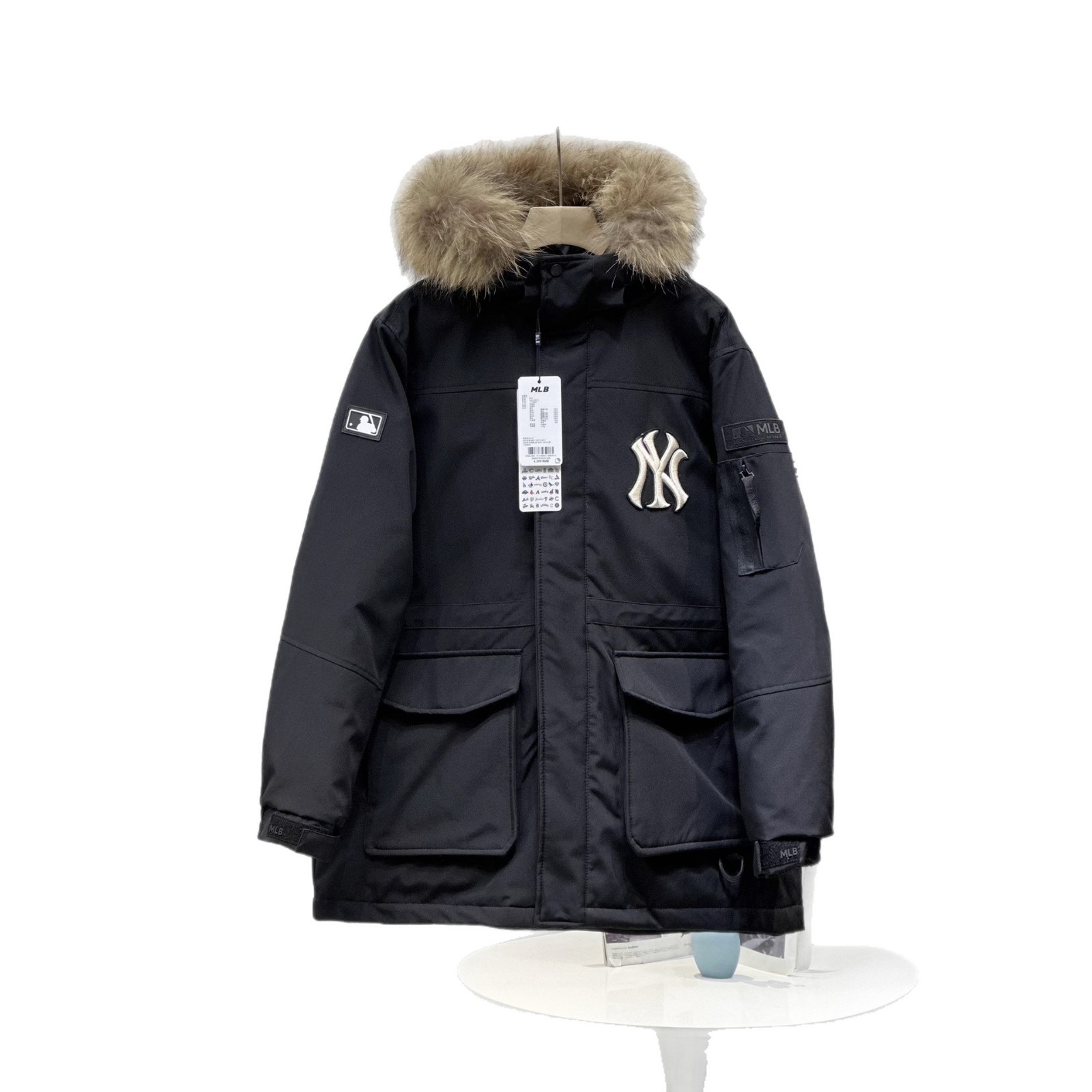 高版本MLB男女百搭连帽羽绒服大毛领 情侣中长款加厚防水工装外套