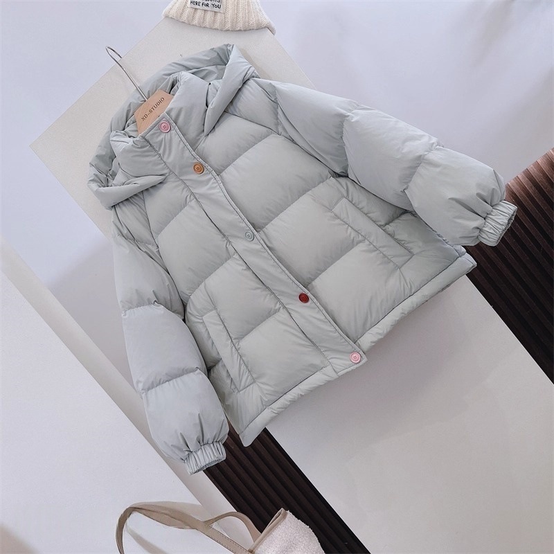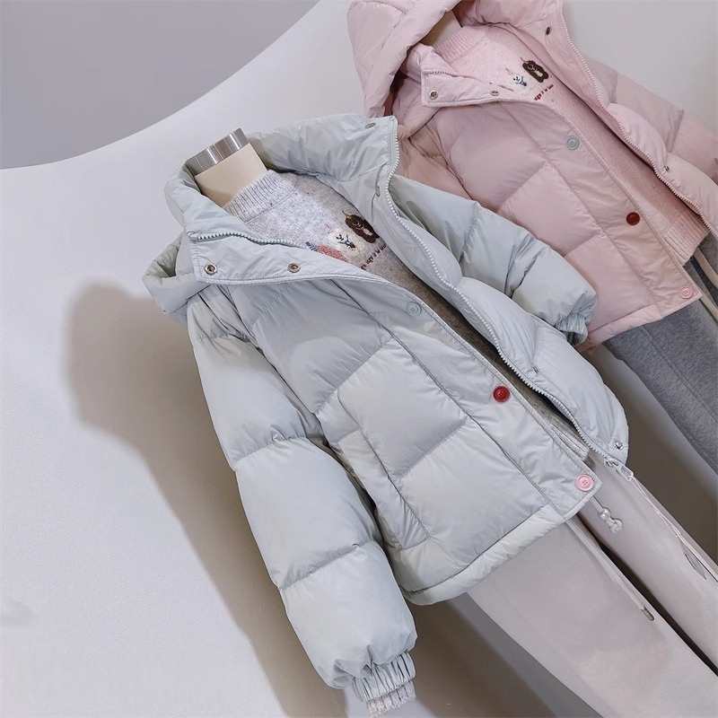 Новые осенние и зимние товары для девочек, детей среднего и старшего возраста, модная свободная теплая пуховая куртка с капюшоном и цветными пуговицами в корейском стиле 2025 года.