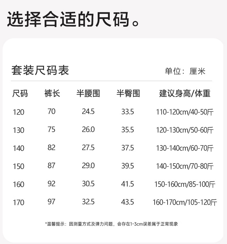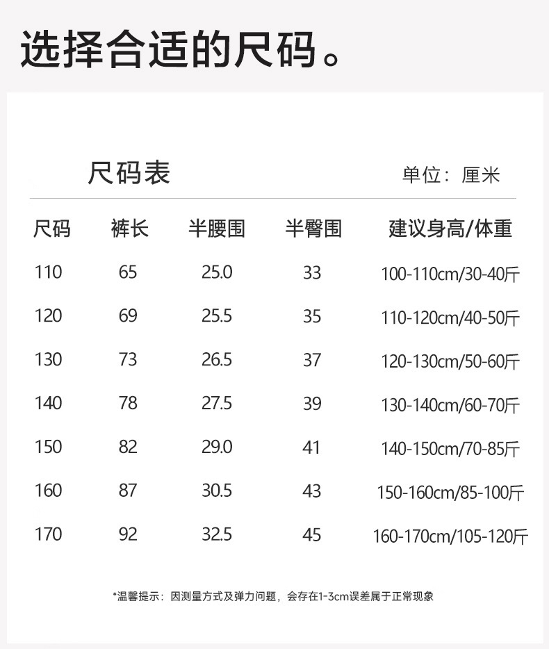 110号(建议100-110cm/30-40斤); 120号(建议110-120cm/40-50斤); 130号 (建议120-130cm/50-60斤); 140号(建议130-140cm/60-70斤); 150号(建议140-150cm/70-85斤); 160号 (建议150-160cm/85-100斤); 170号 (建议160-170cm/100-120斤)