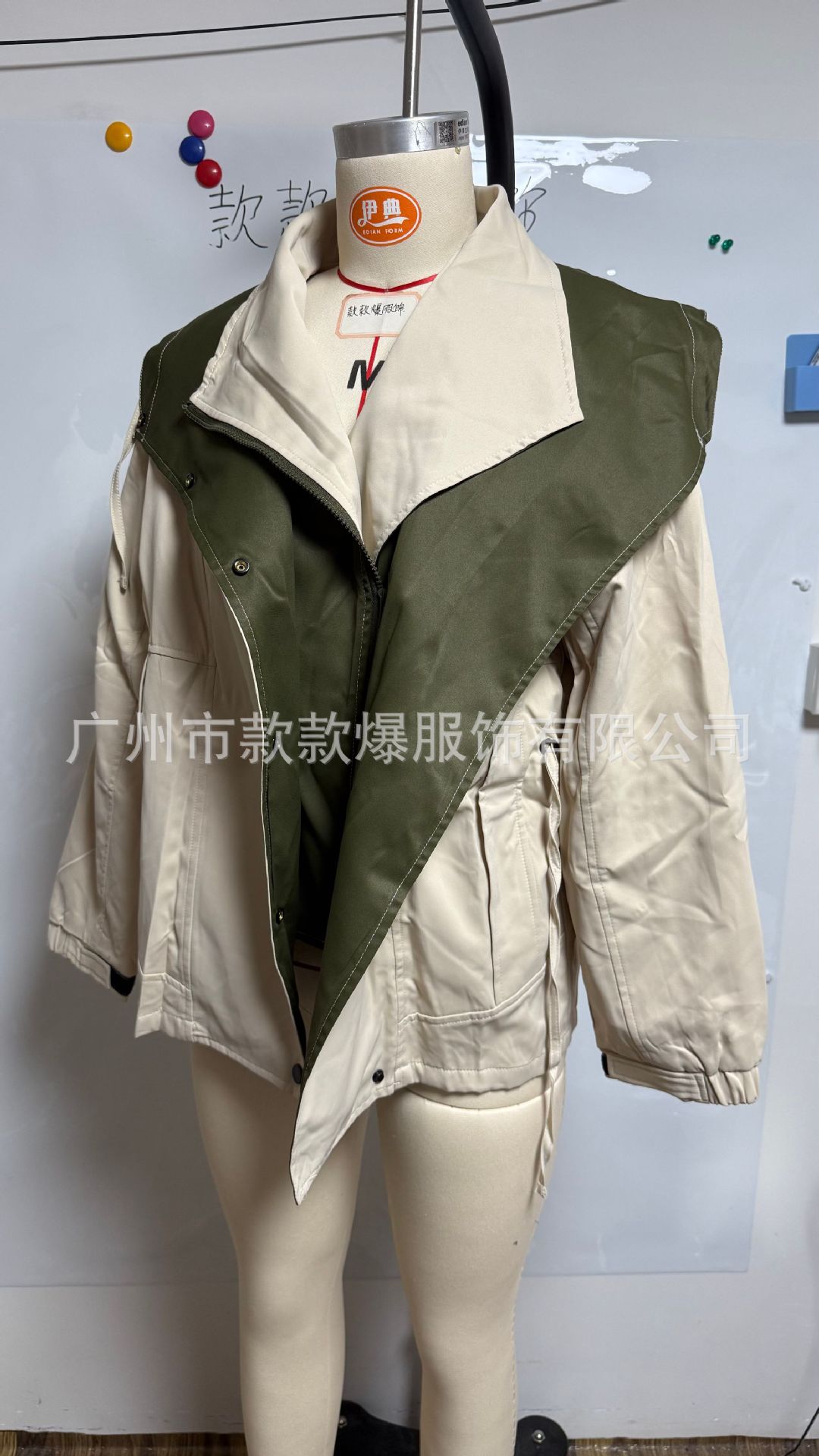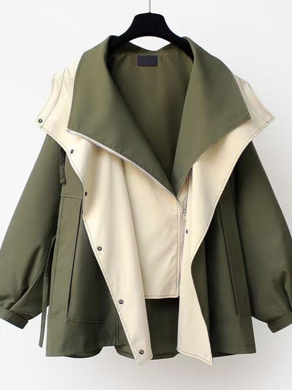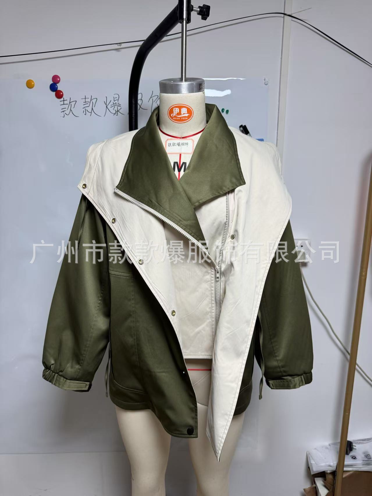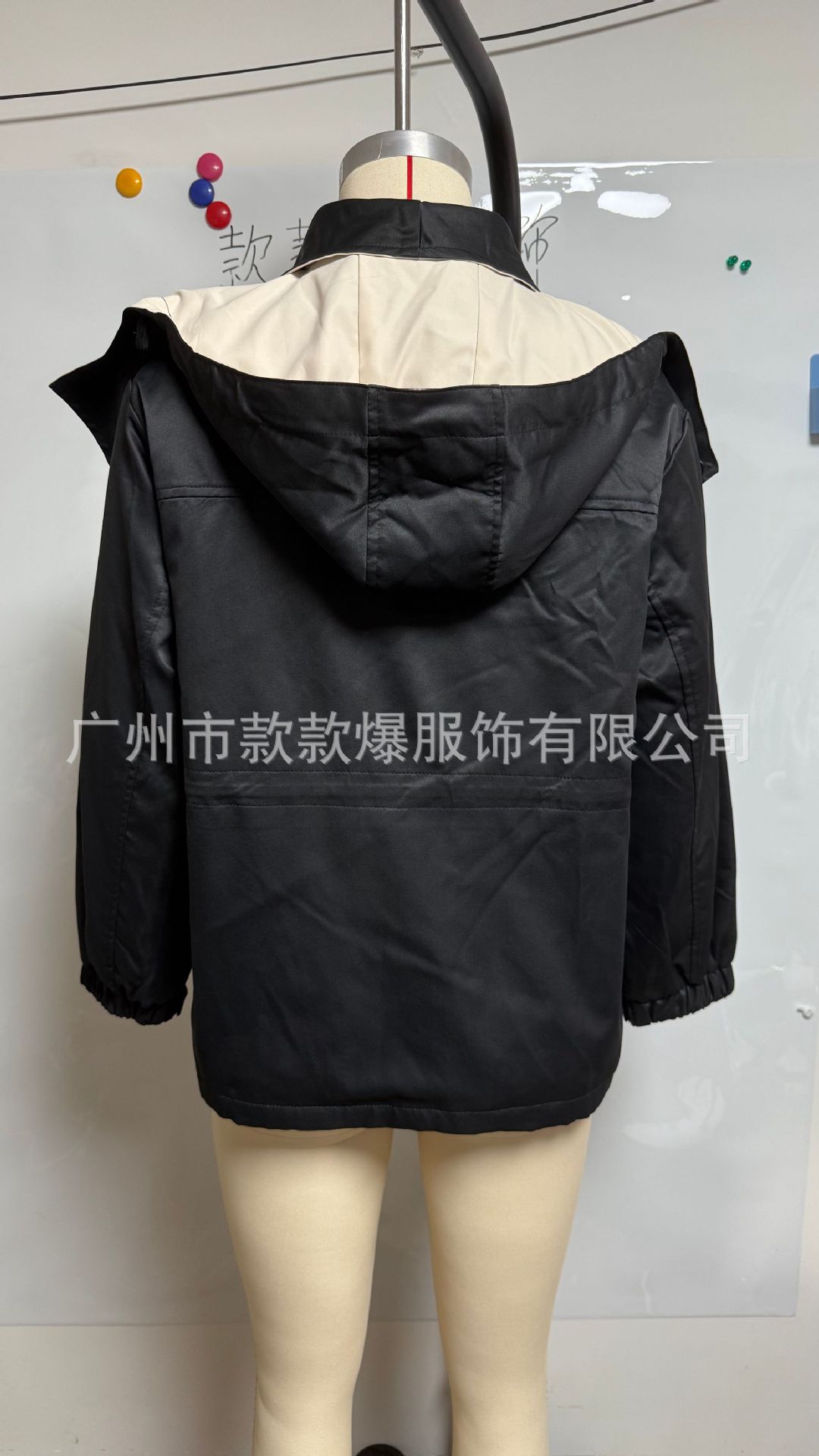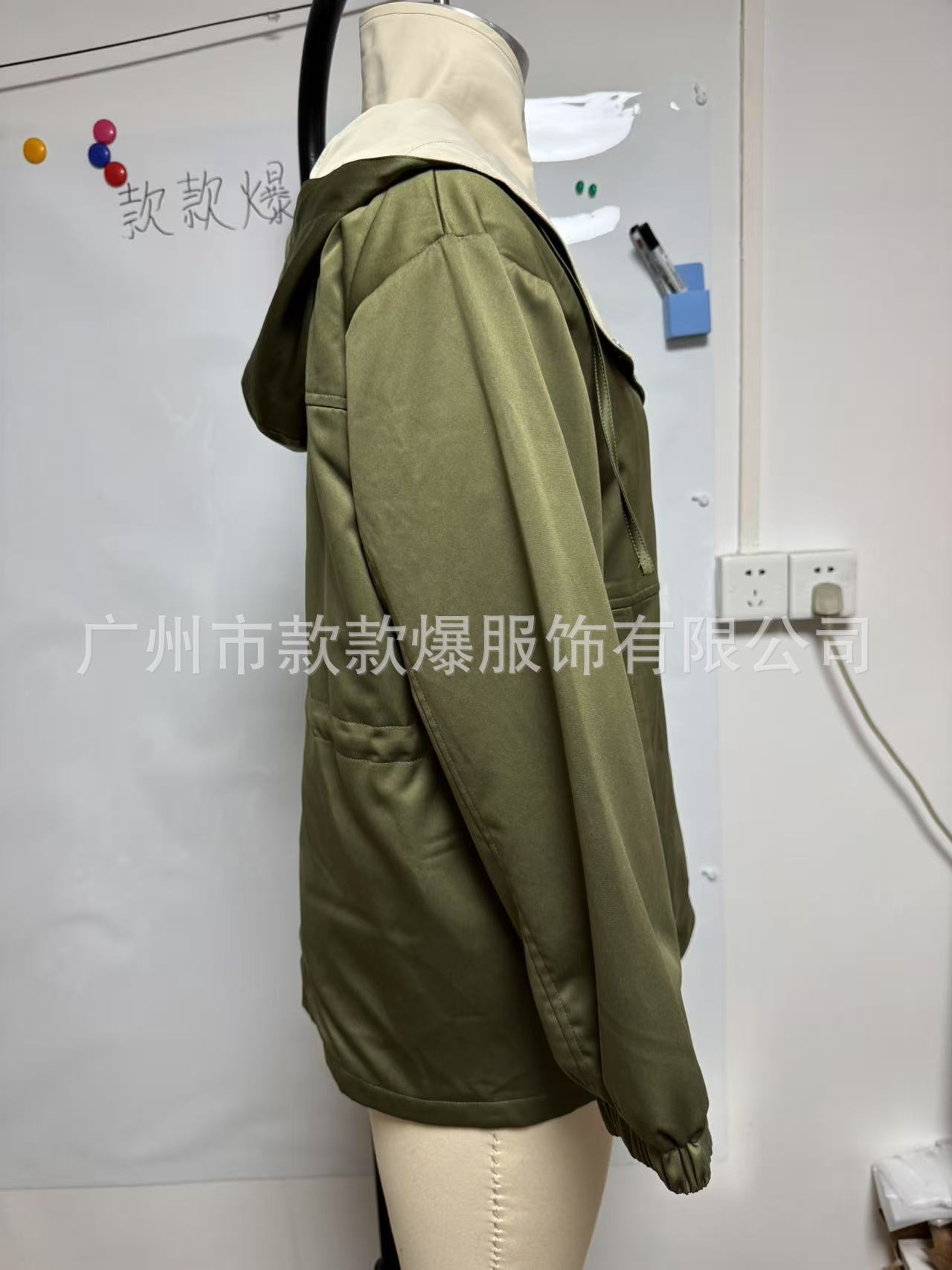欧美女装2025秋季新款亚马逊跨境宽松翻领连帽拉链拼接风衣外套