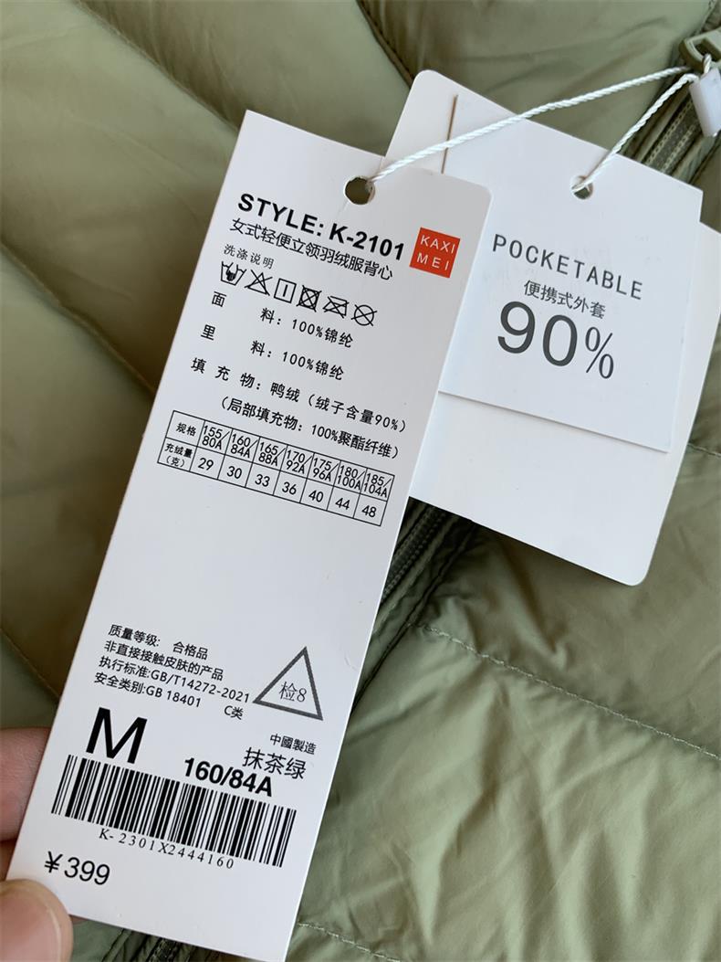 PS:(大家买羽绒服一定要去看水洗标,上面写的绒子含量90%的才是最新的90国标白鸭绒,写了含绒量:90%白鸭绒是老国标或者根本不是90白鸭绒)