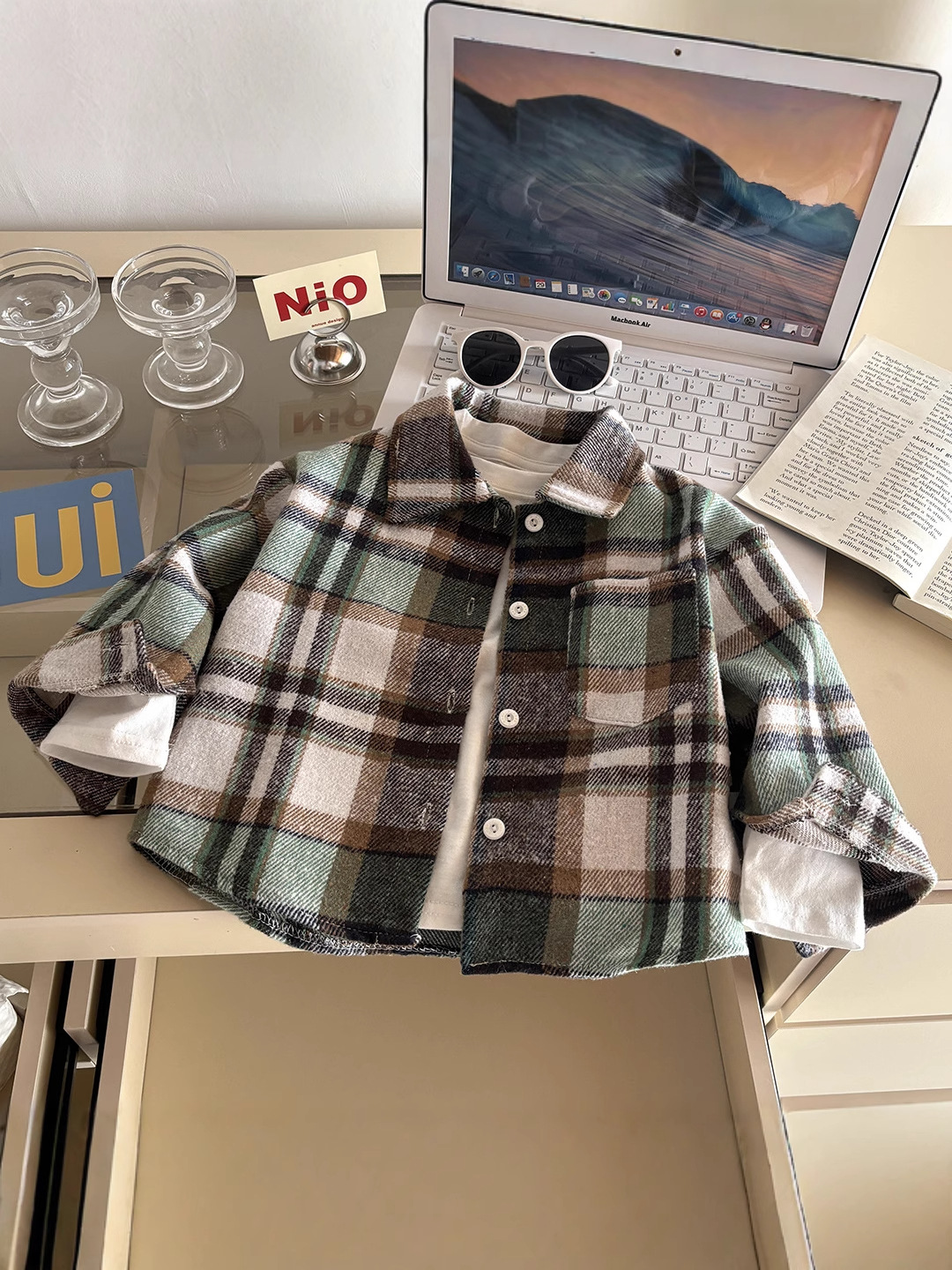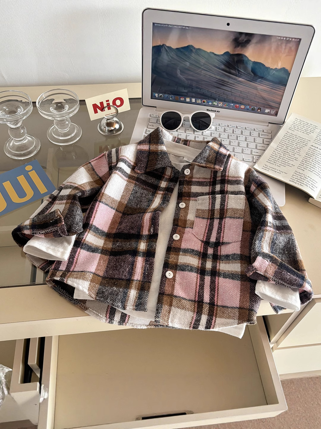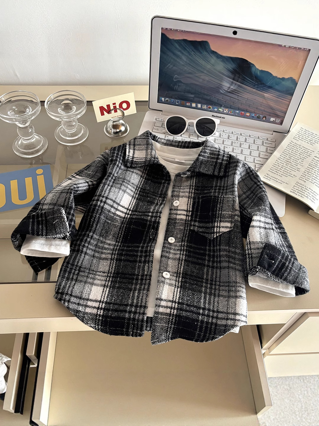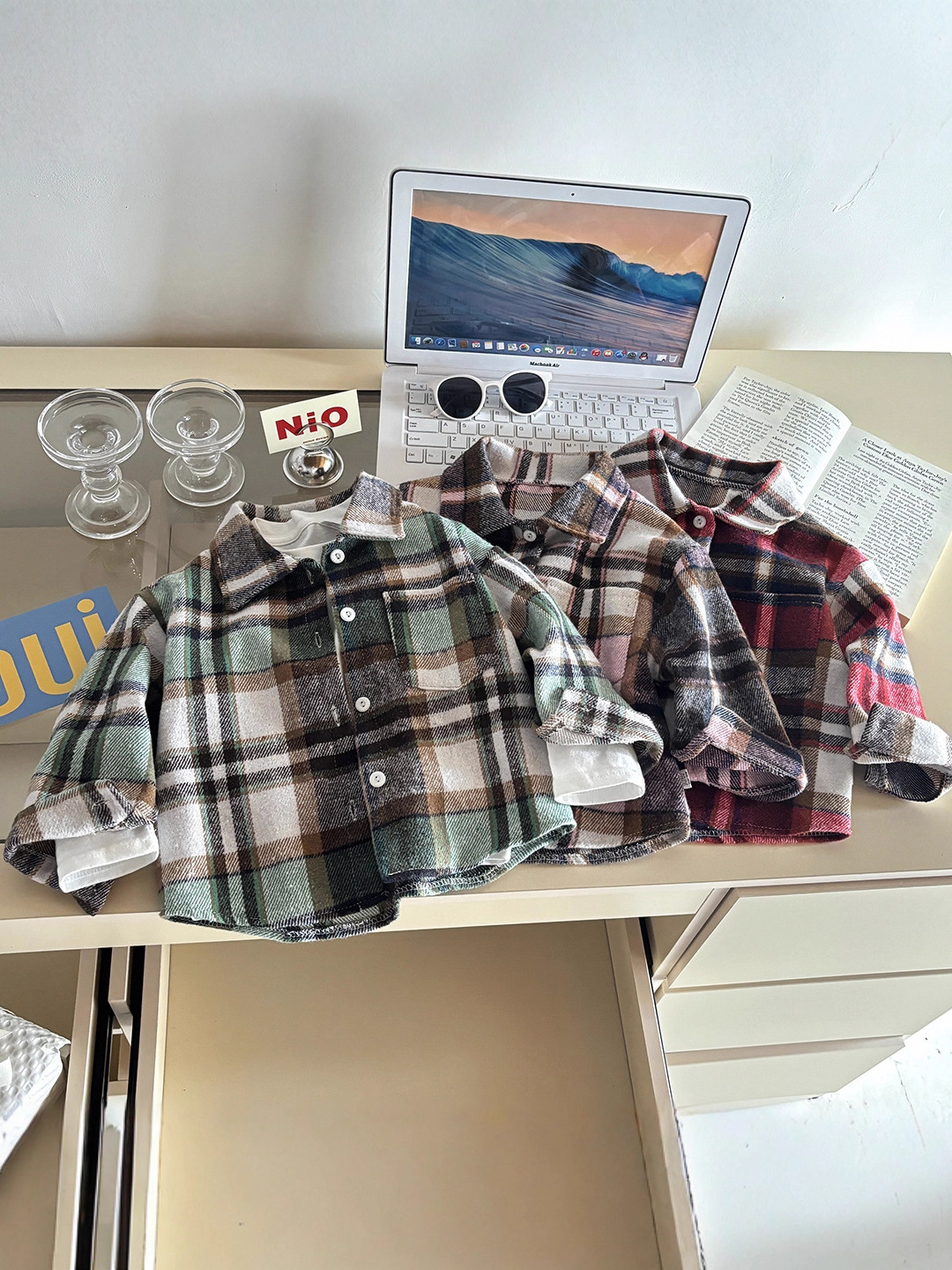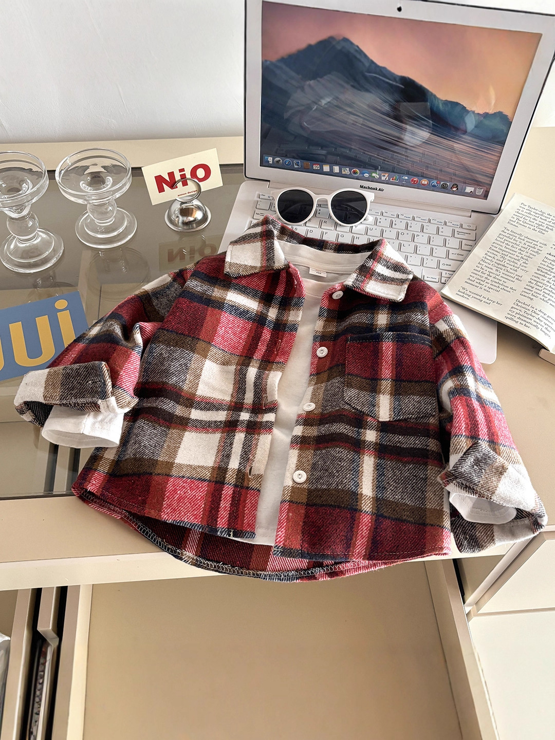 儿童衬衣长袖秋款格子衬衫男童复古拼色新款开衫翻领上衣女童外套