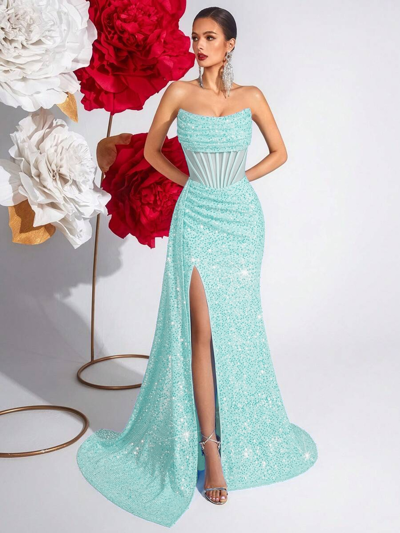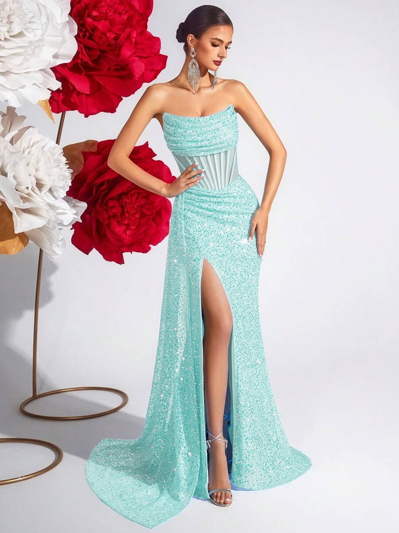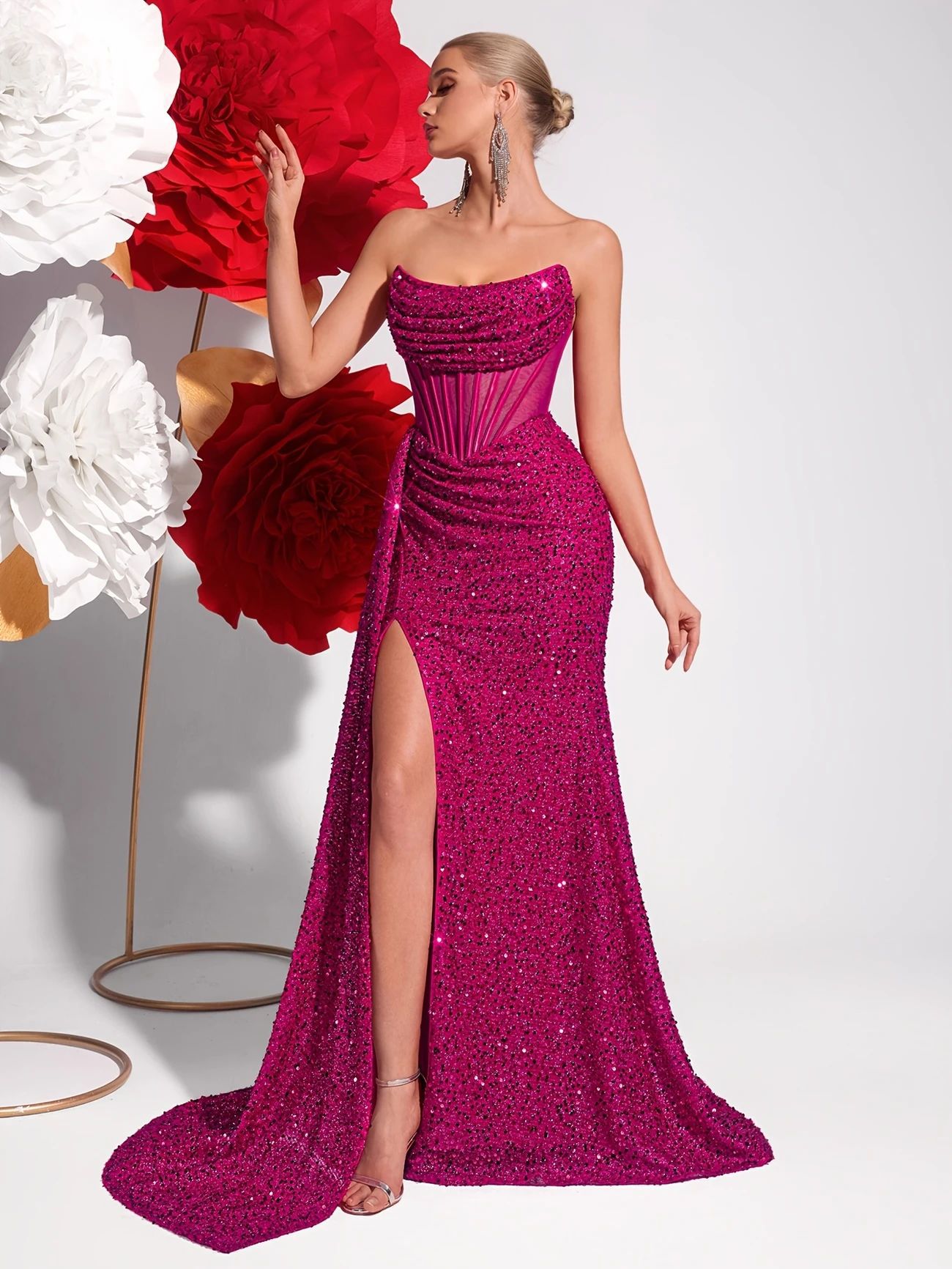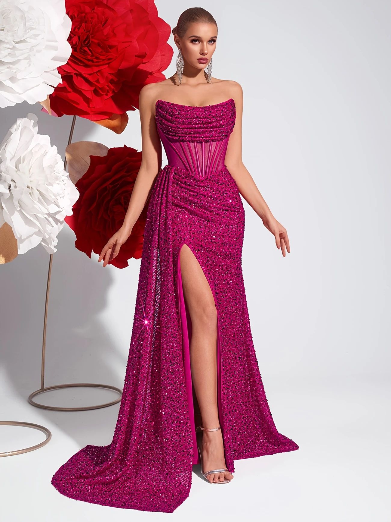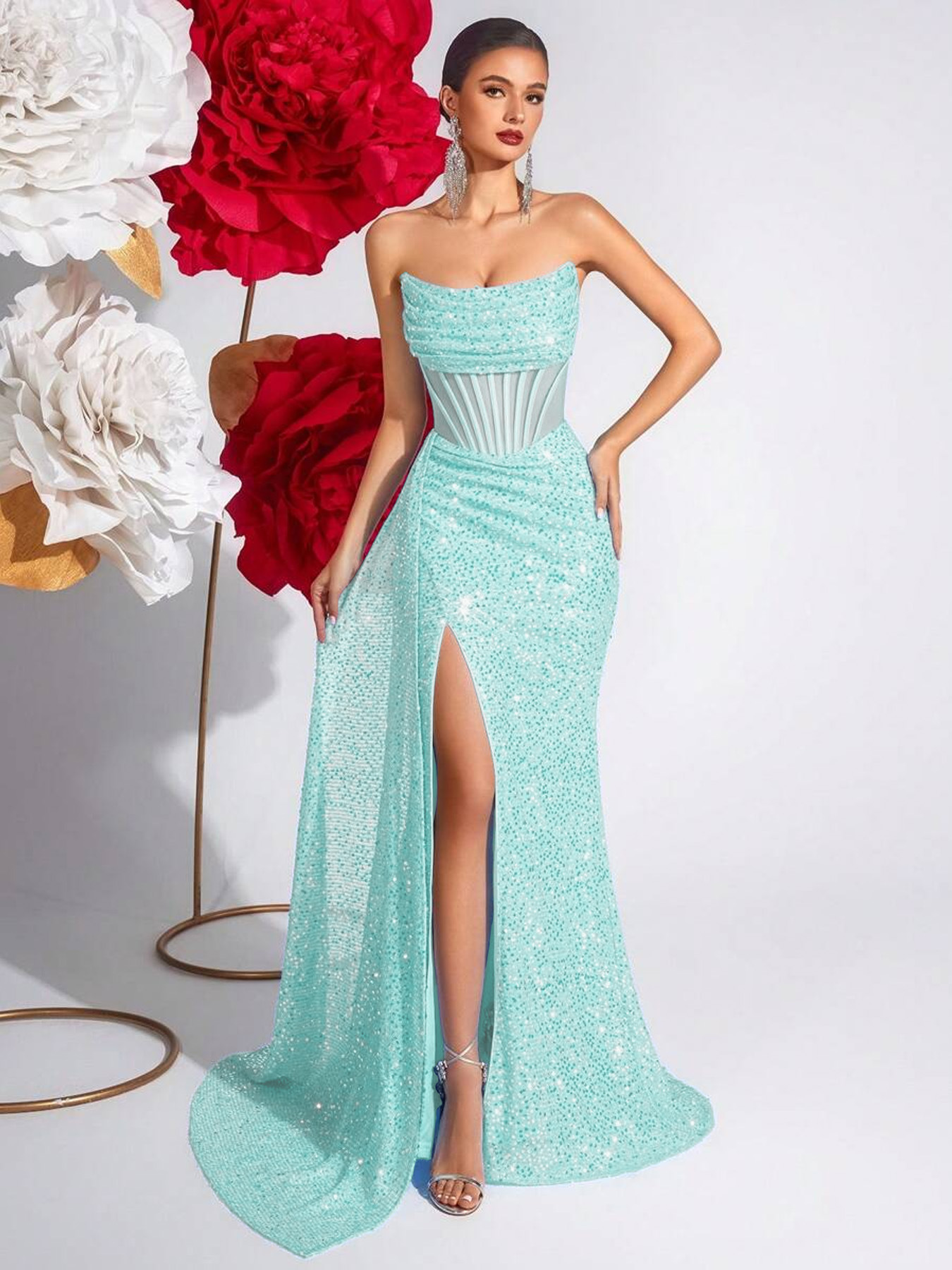Европейское и американское трансграничное модное вечернее платье, вечернее платье с блестками, сексуальное модное длинное платье с боковым разрезом и небольшим хвостом