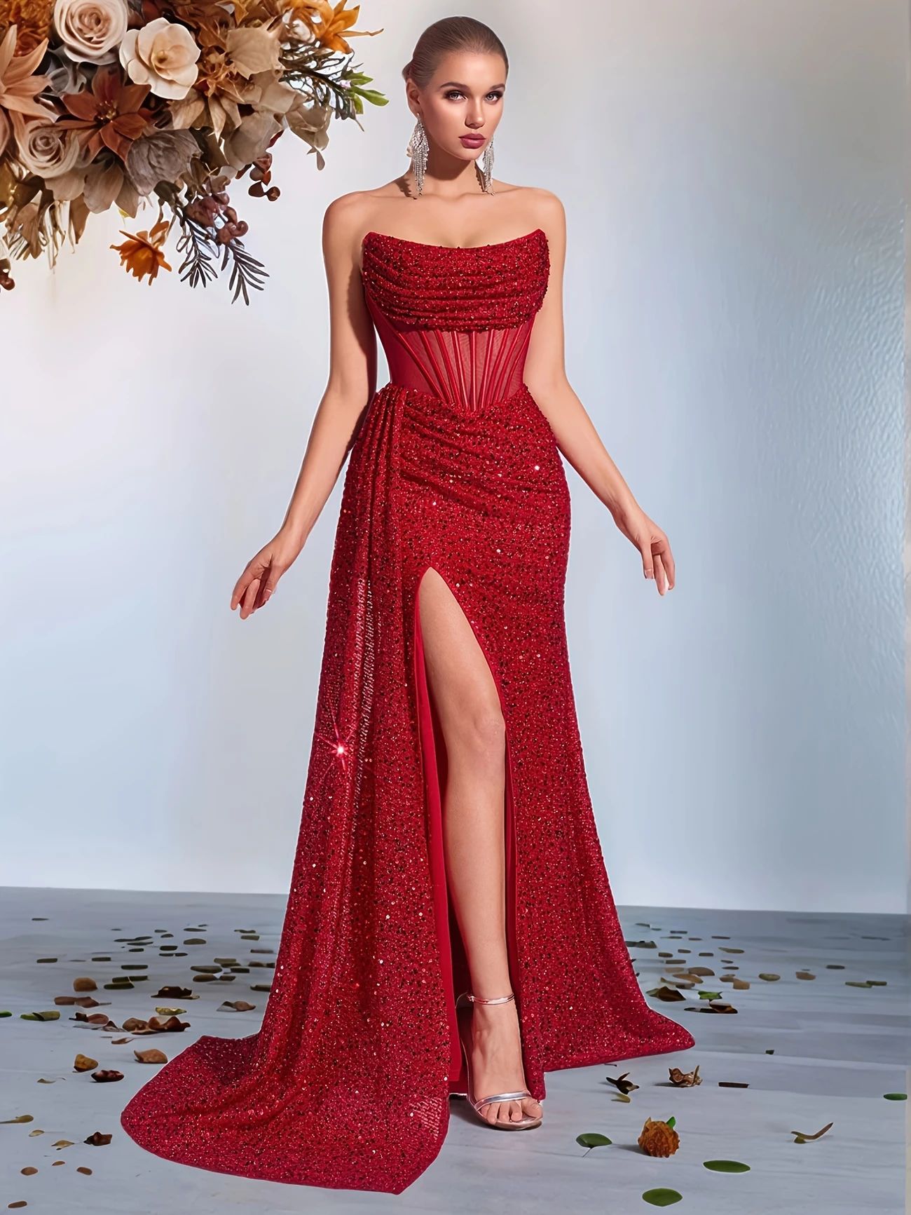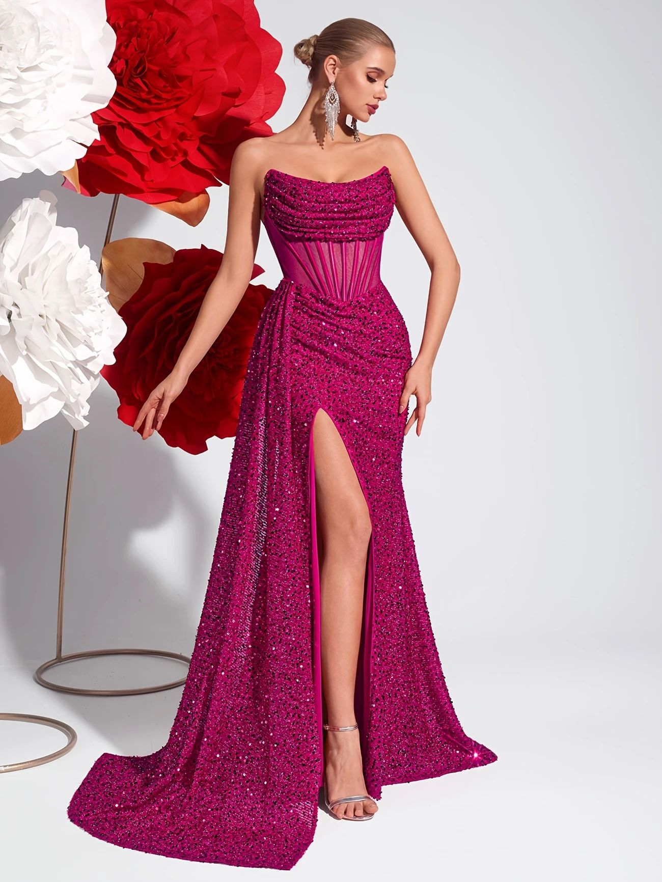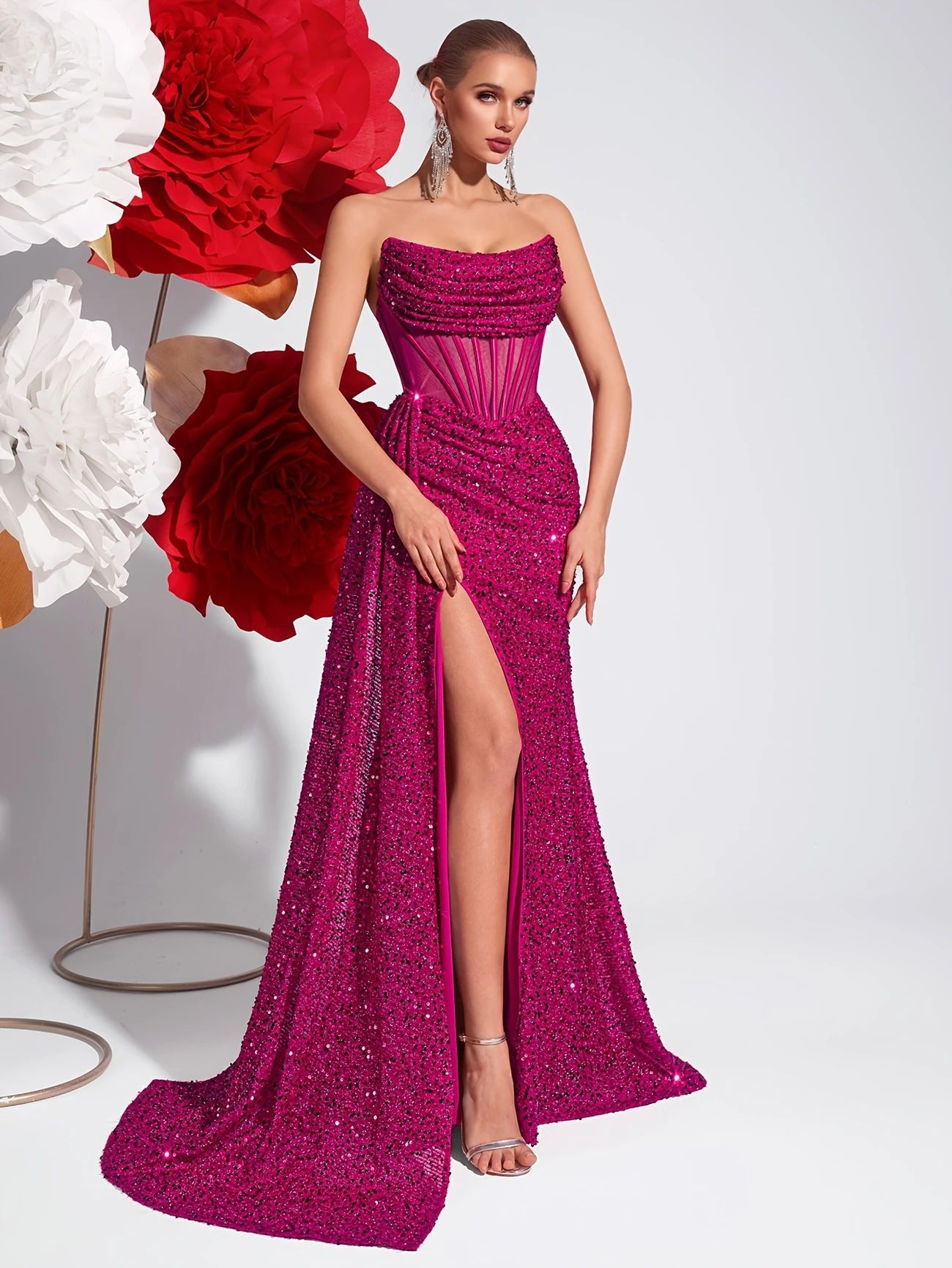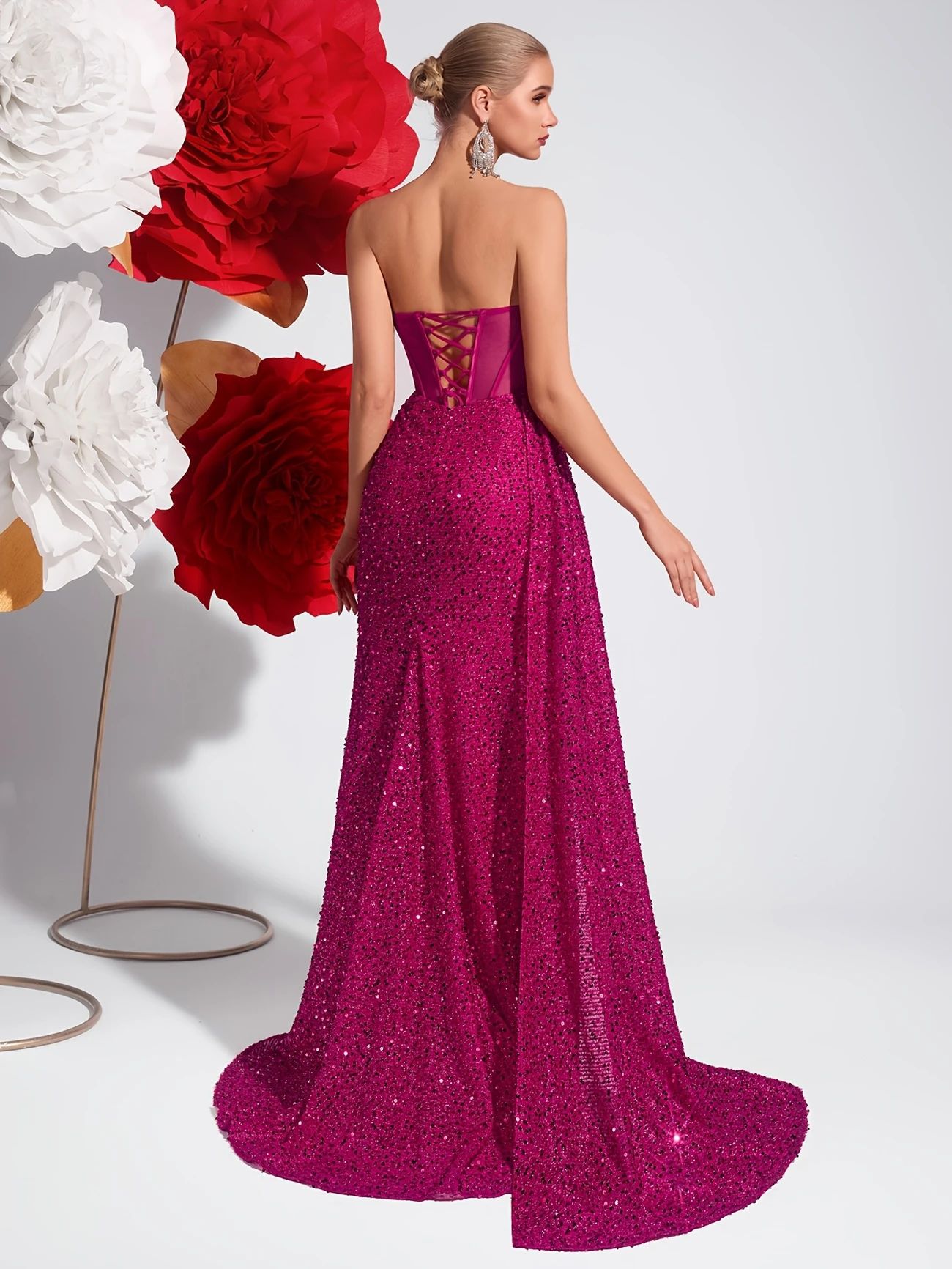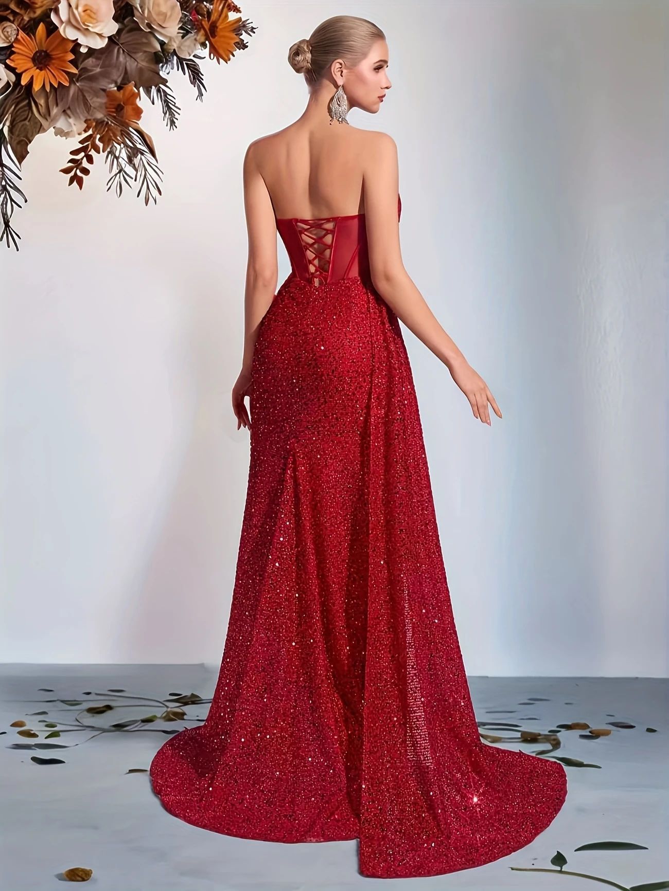 Европейское и американское трансграничное модное вечернее платье, вечернее платье с блестками, сексуальное модное длинное платье с боковым разрезом и небольшим хвостом