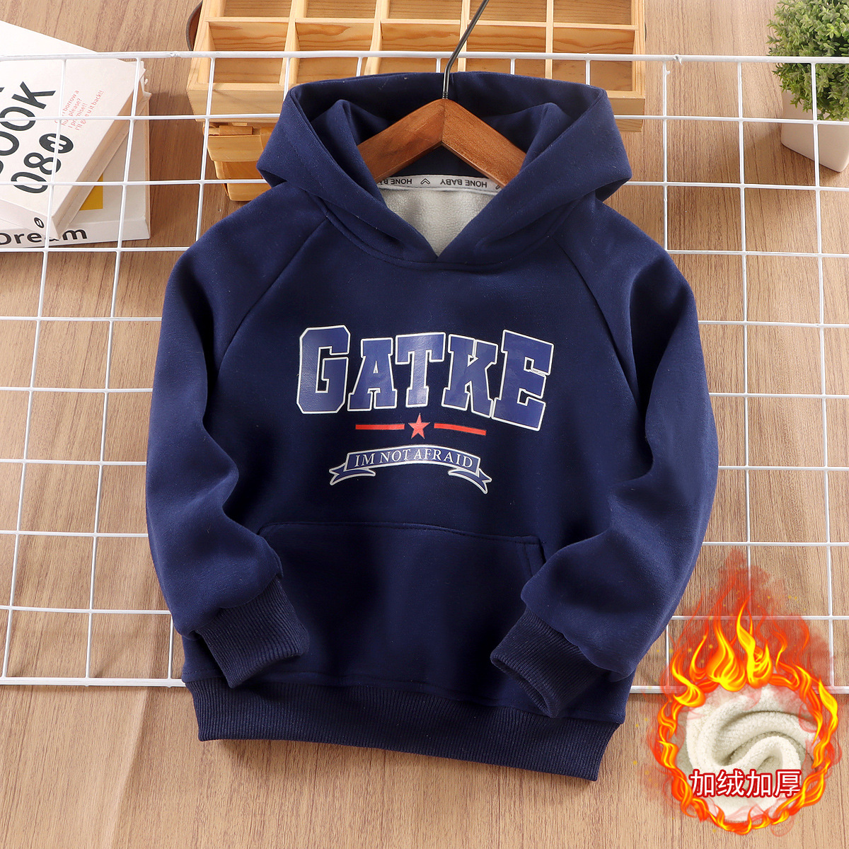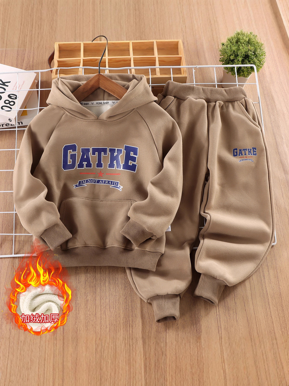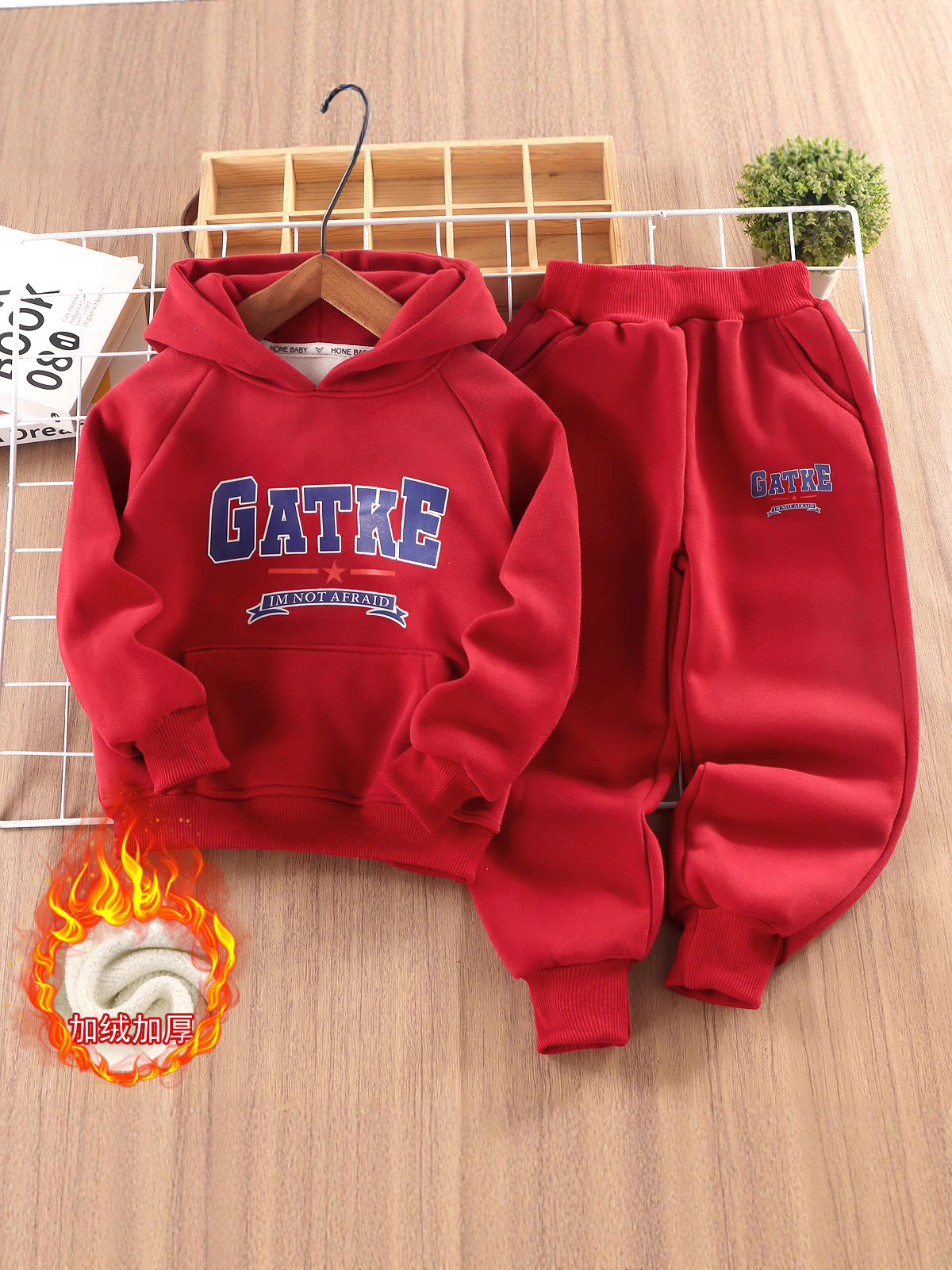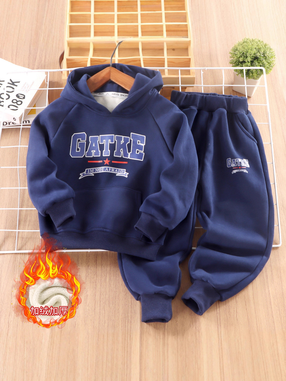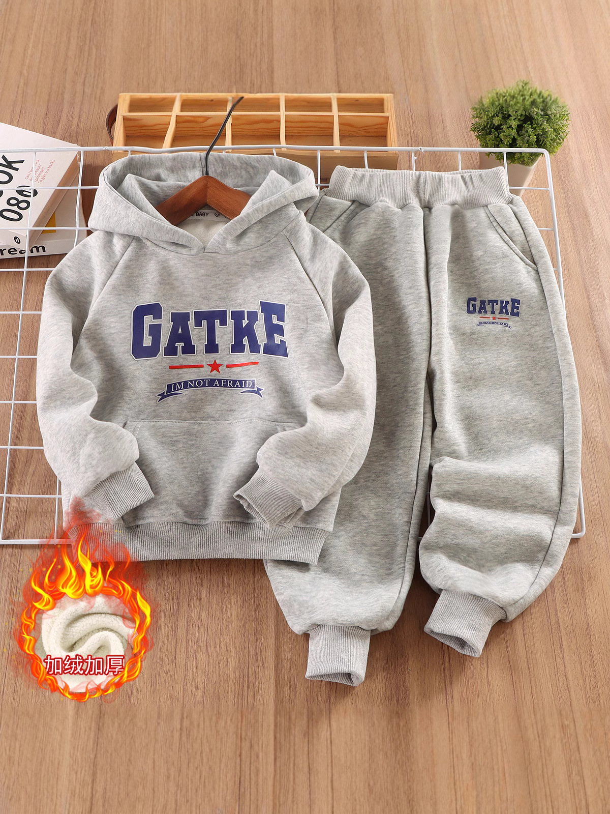 Детский бархатный утолщенный модный брендовый костюм с капюшоном, осенне-зимний новый повседневный свитшот с буквенным принтом для мальчиков, комплект из двух предметов
