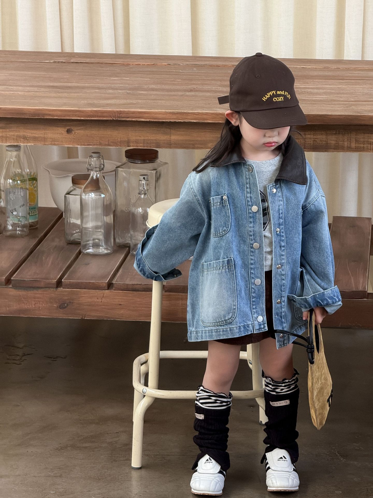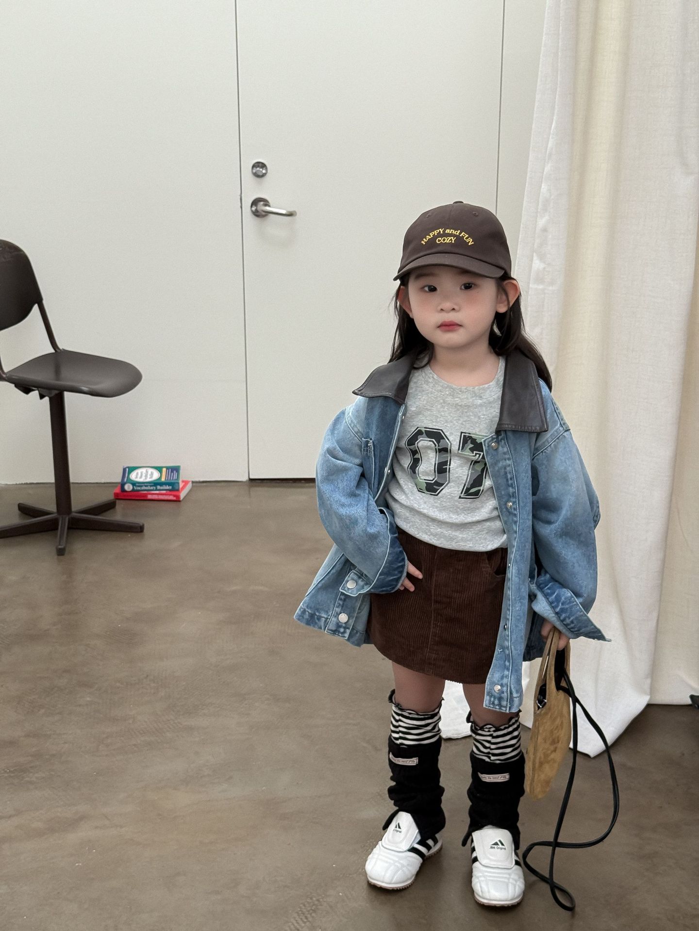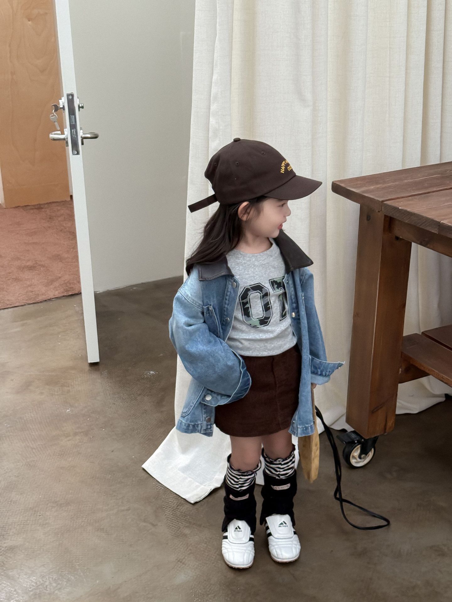 Джинсовая куртка ZH707; Серая футболка ZH707; Вельветовая юбка ZH707