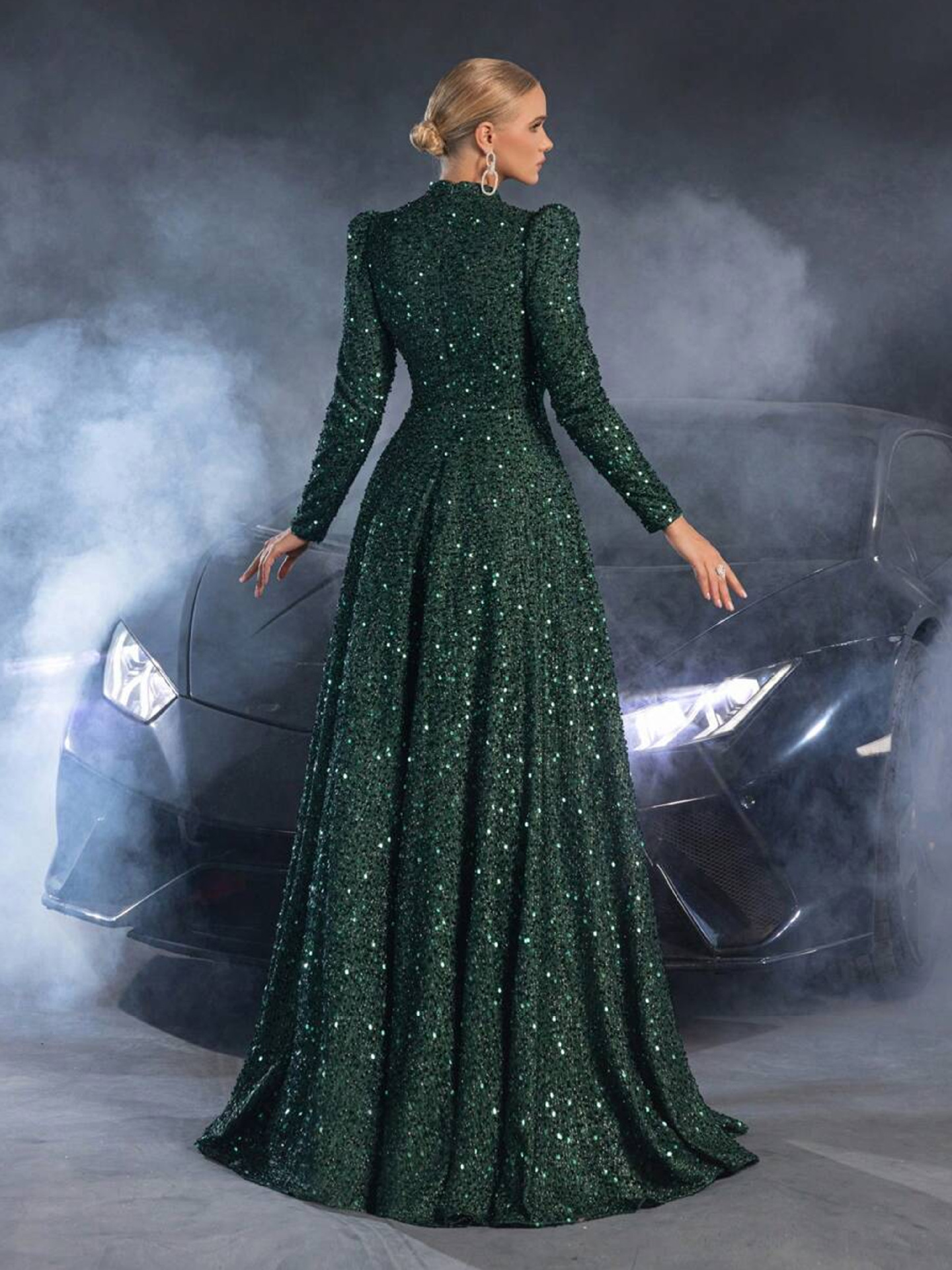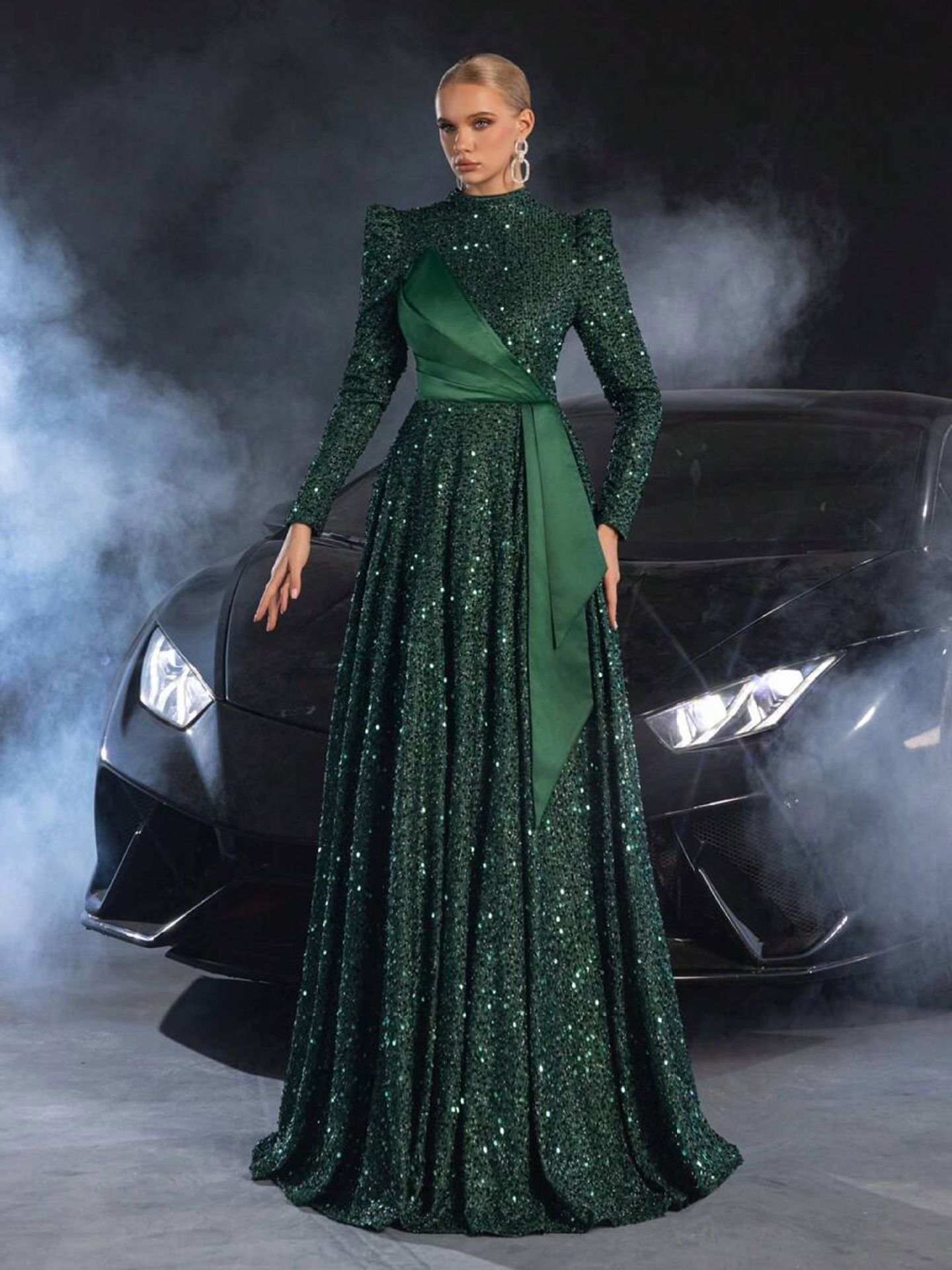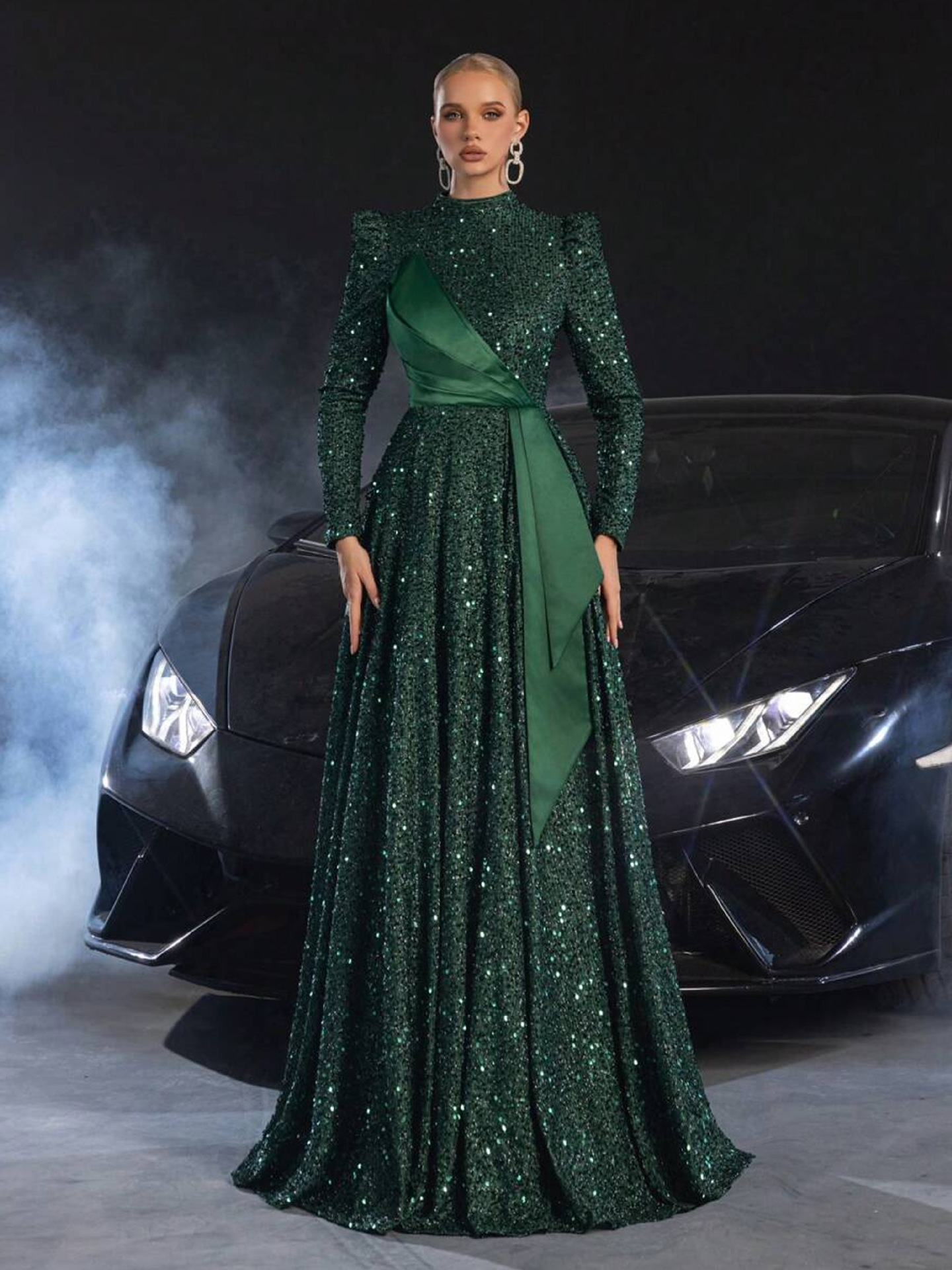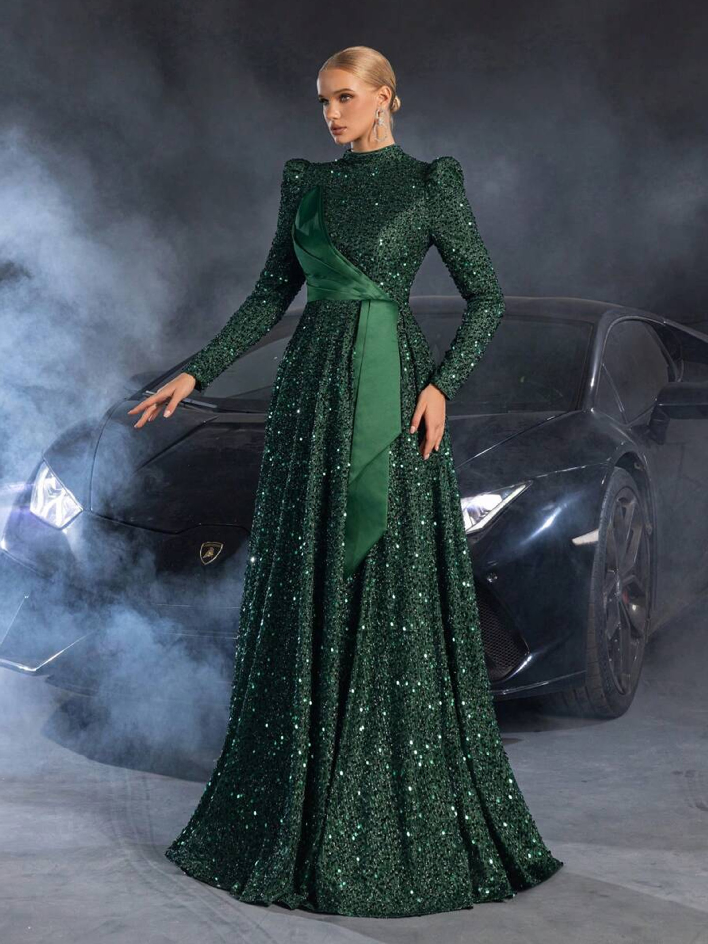 欧美跨境时尚晚礼服宴会创意亮片拼缎面派对毕业礼服舞会礼服长裙