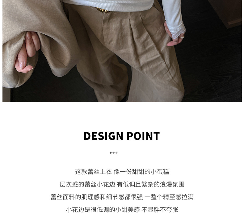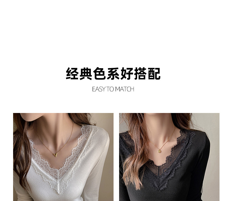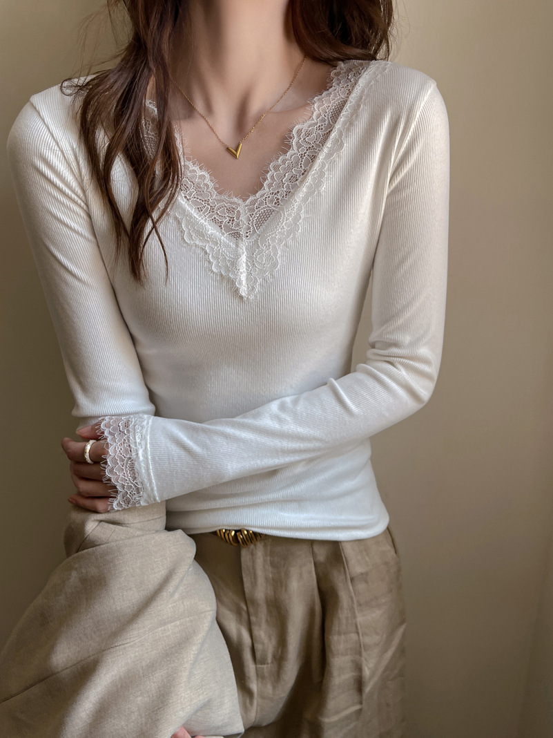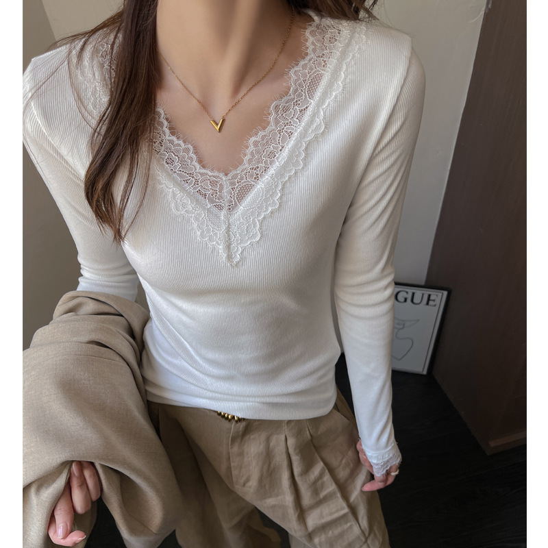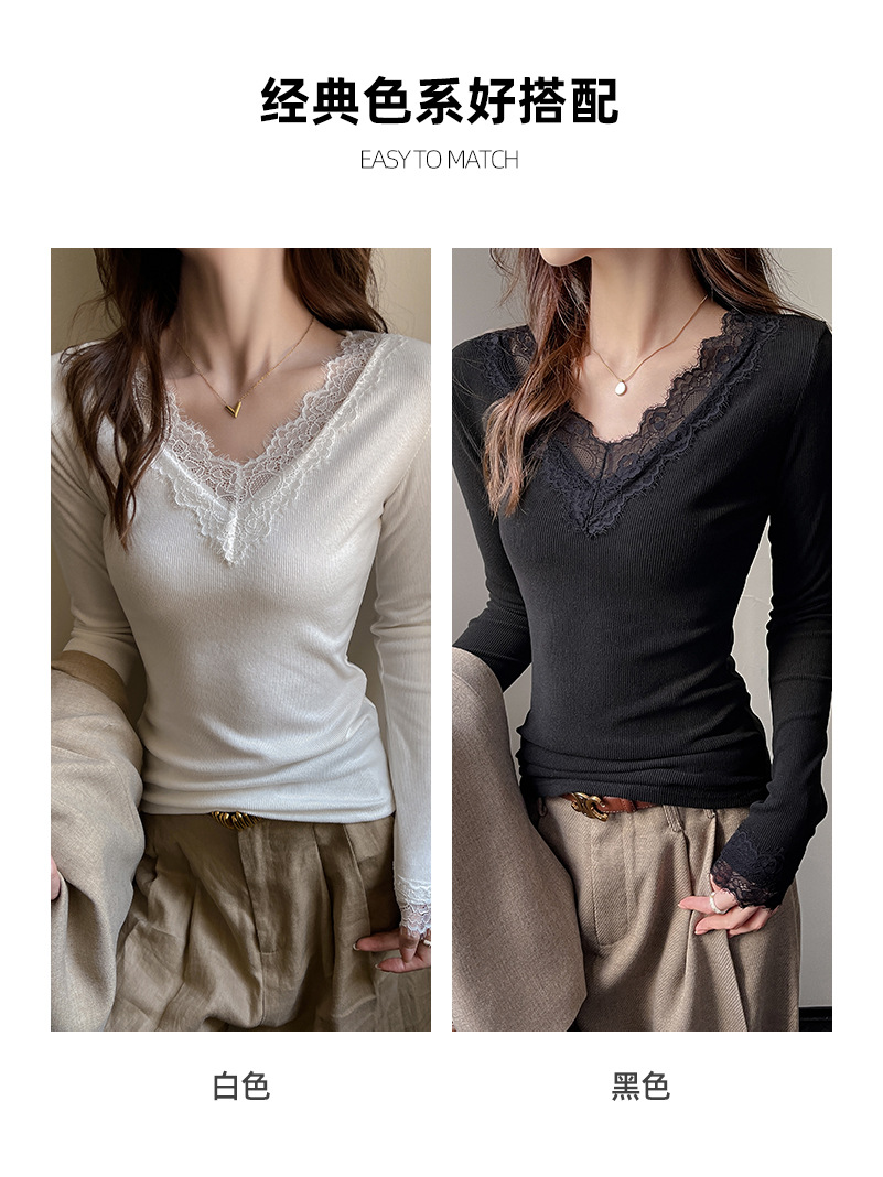 蕾丝花边V领长袖打底衫女士内搭秋冬季德绒磨毛修身设计感正肩t恤