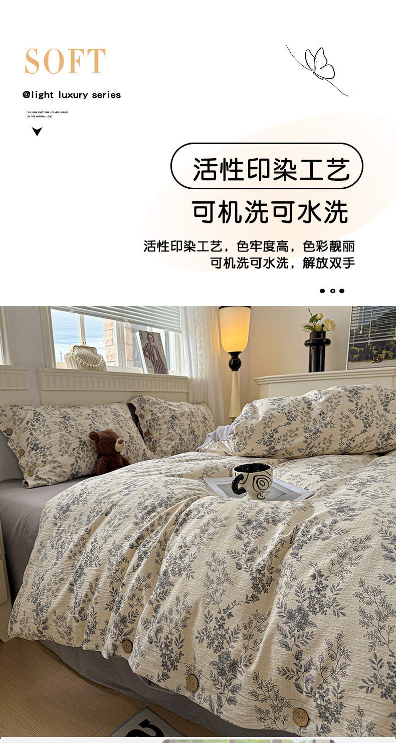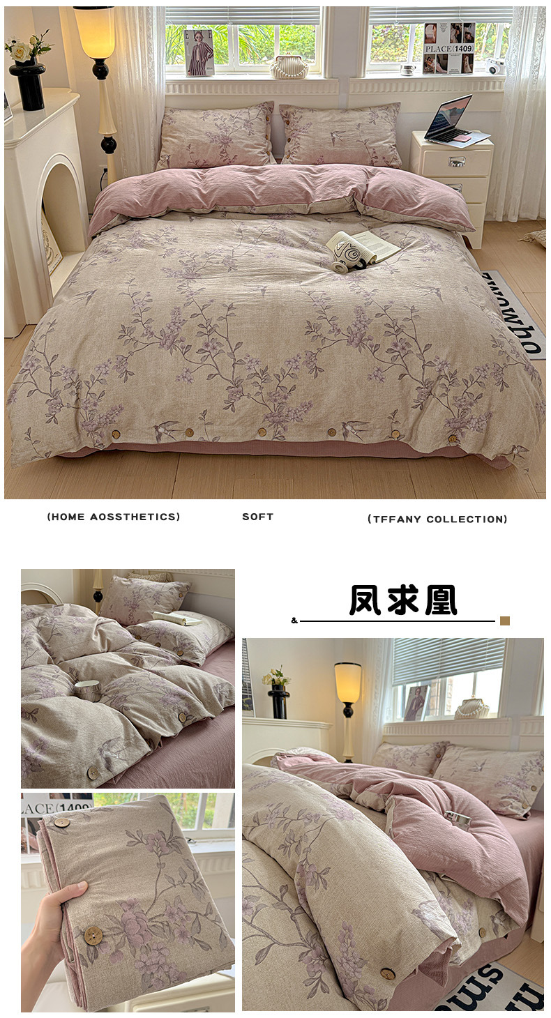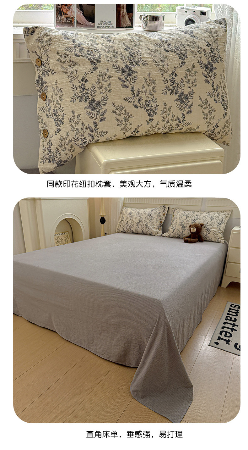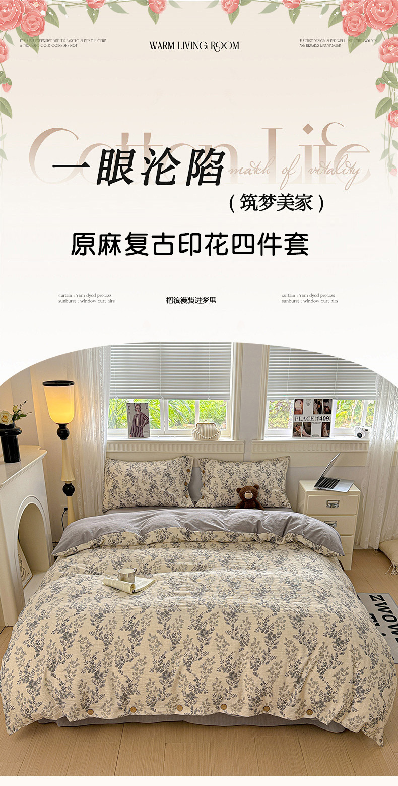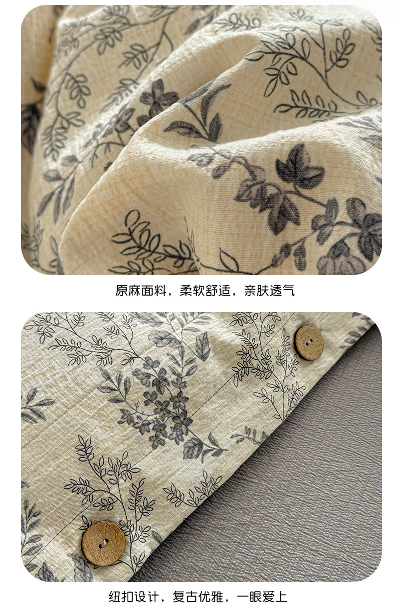 纯棉原麻四件套复古碎花纽扣款全棉床单笠被罩三件套a类床上用品