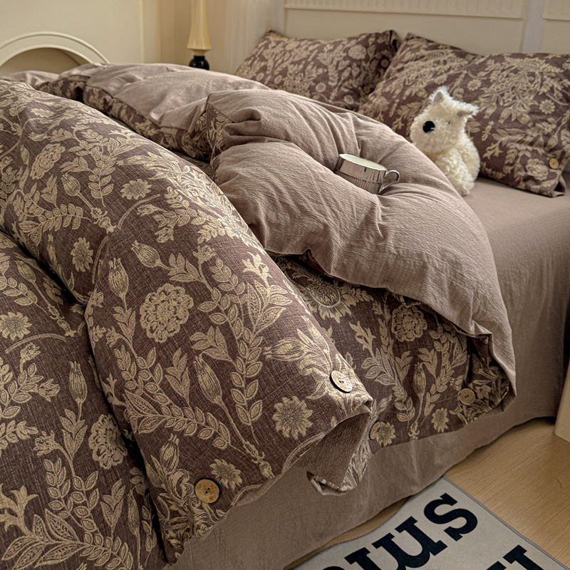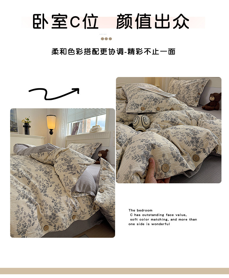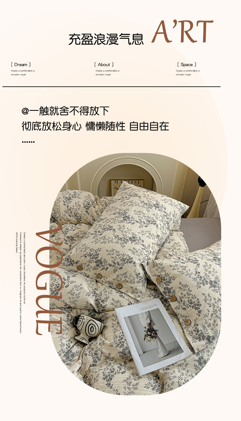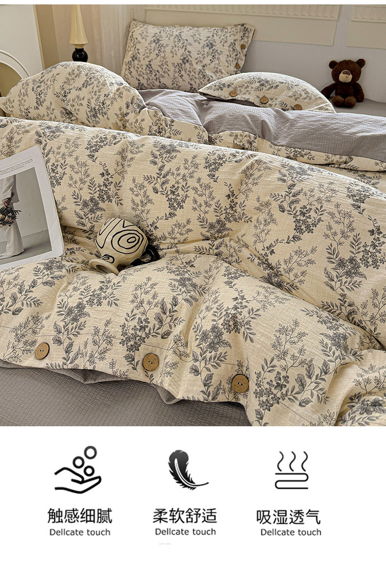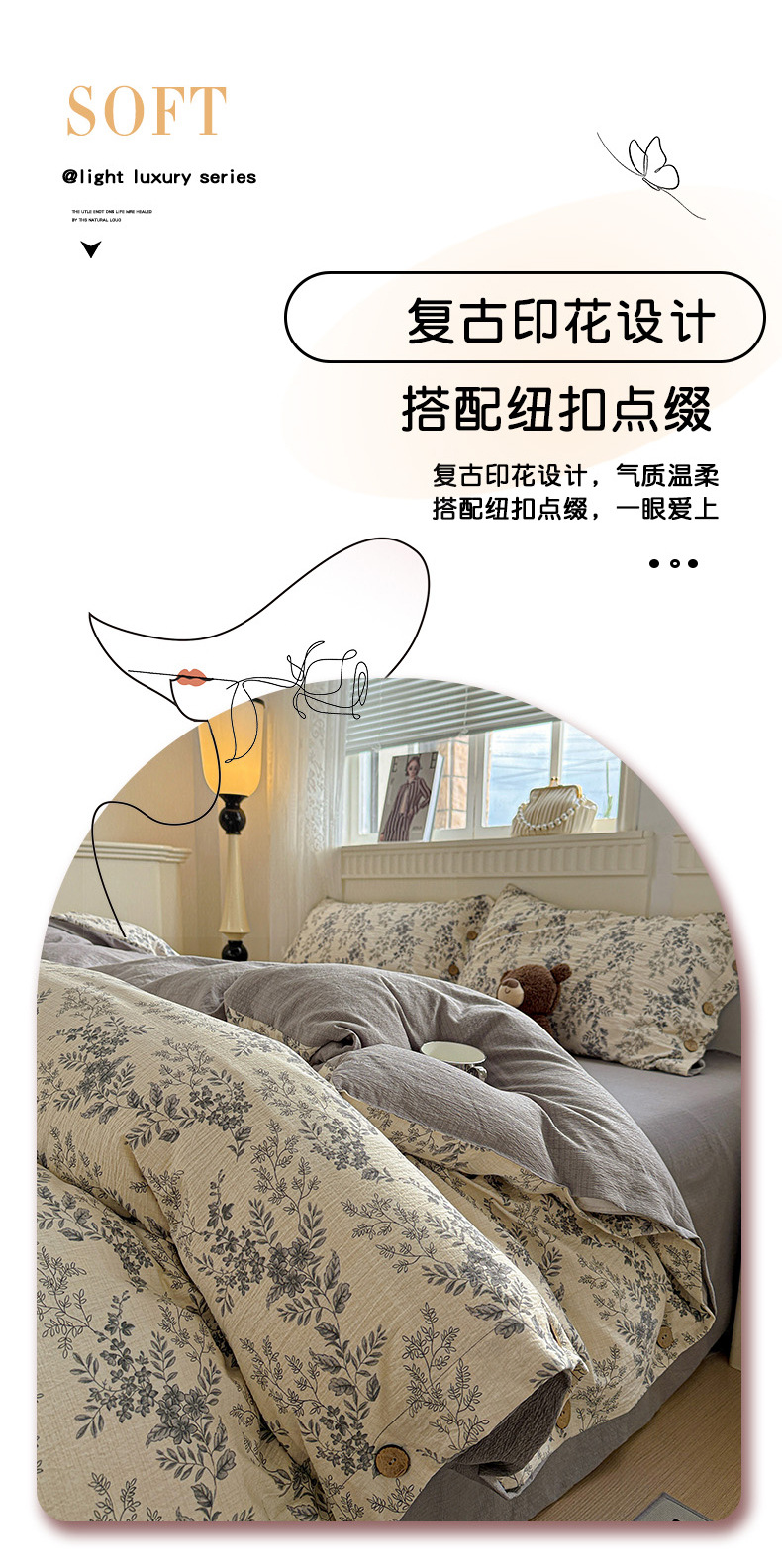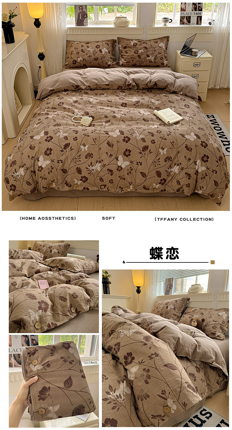 纯棉原麻四件套复古碎花纽扣款全棉床单笠被罩三件套a类床上用品