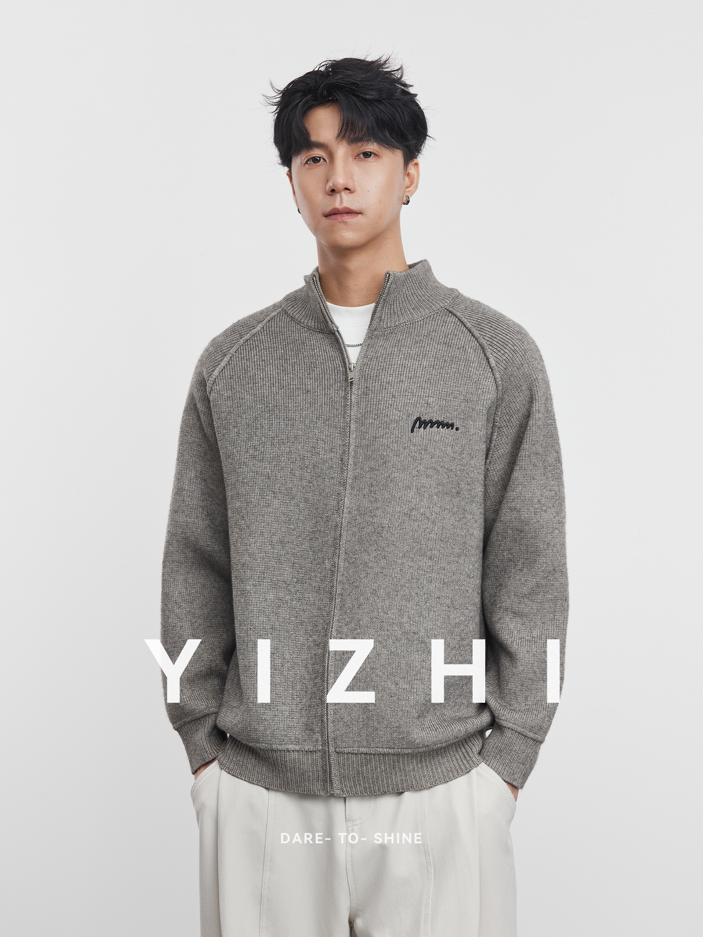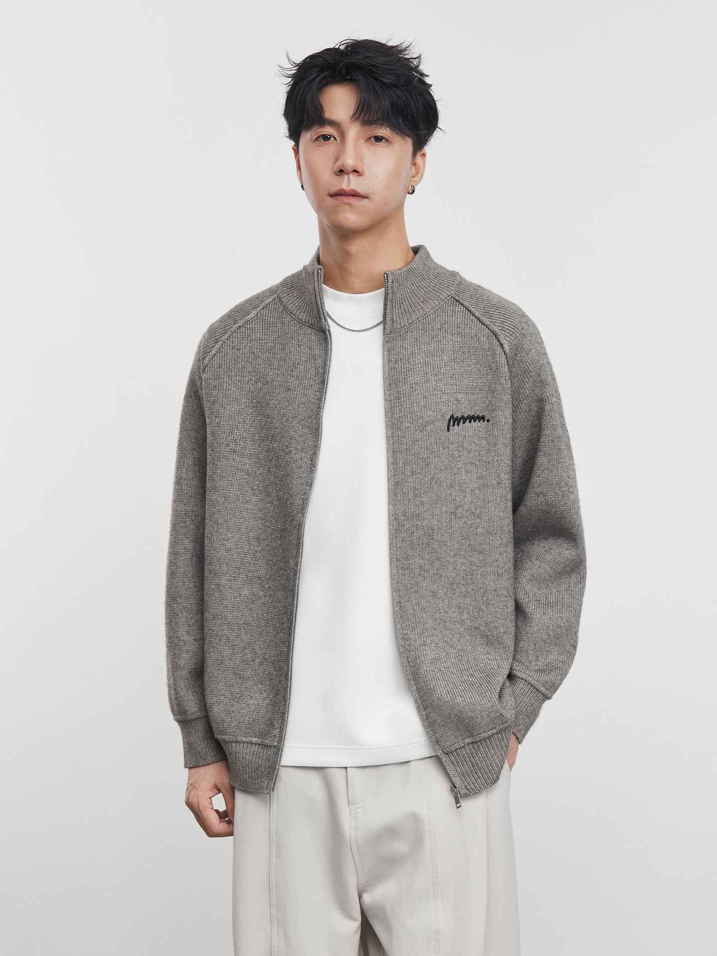 Мужской свободный вязаный кардиган на молнии с воротником-стойкой и вышивкой, модный свободный свитер-жакет