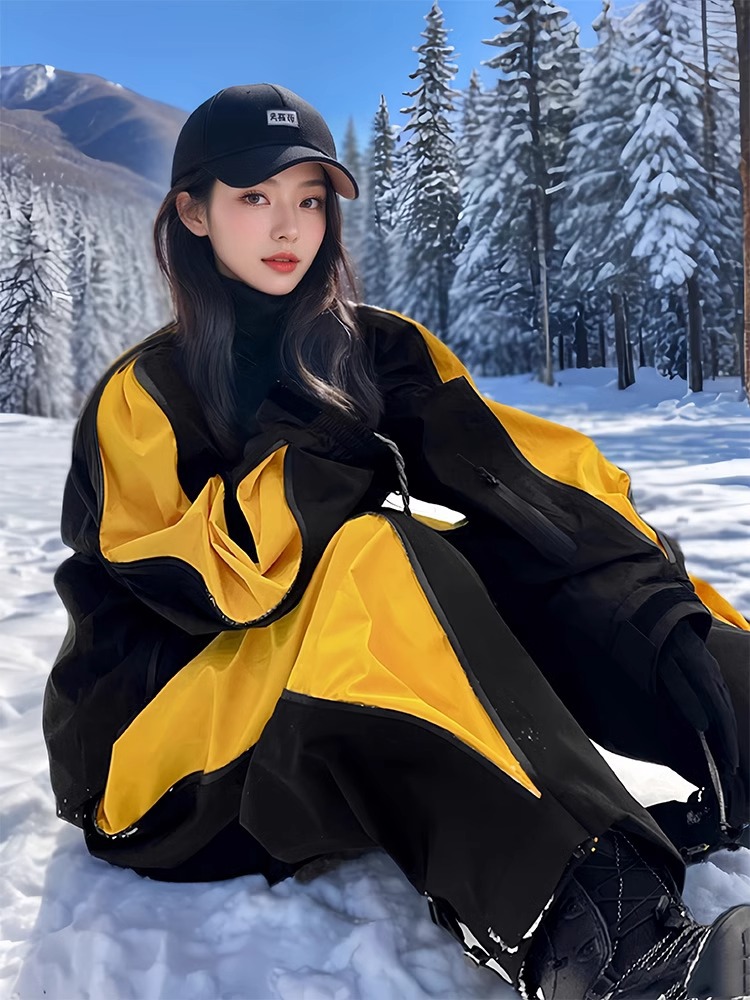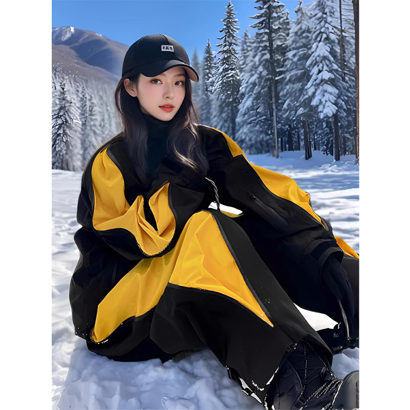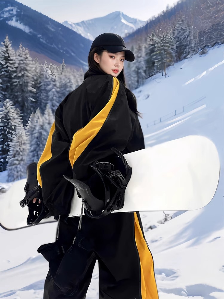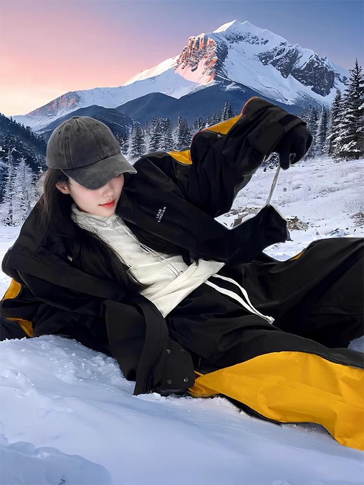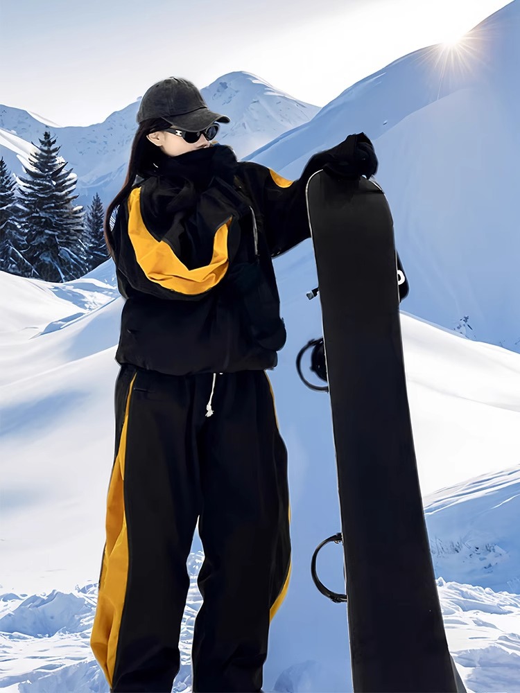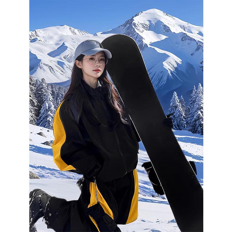芙沿黄黑拼色滑雪服套装外套女2025秋冬新款小众防风单板雪服男