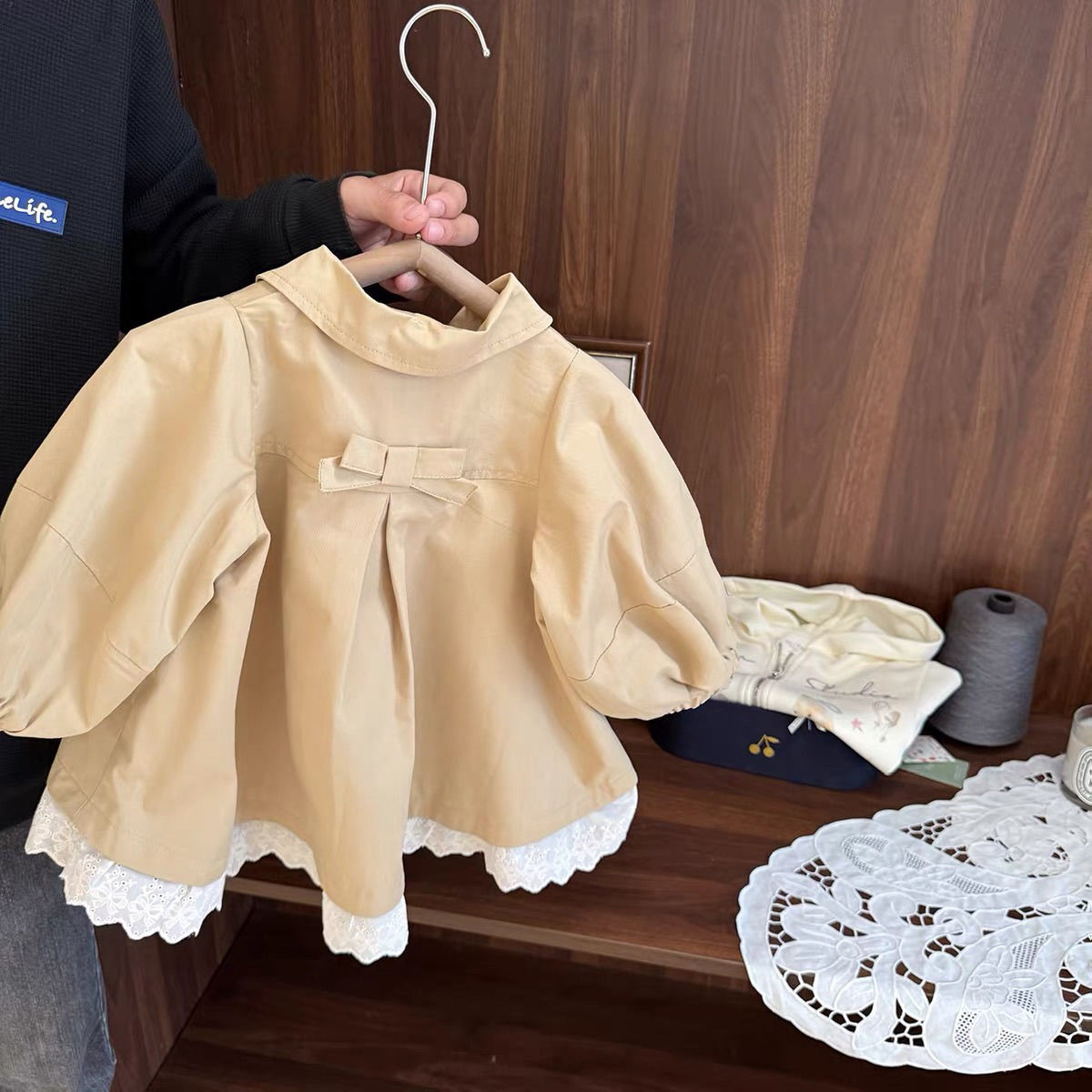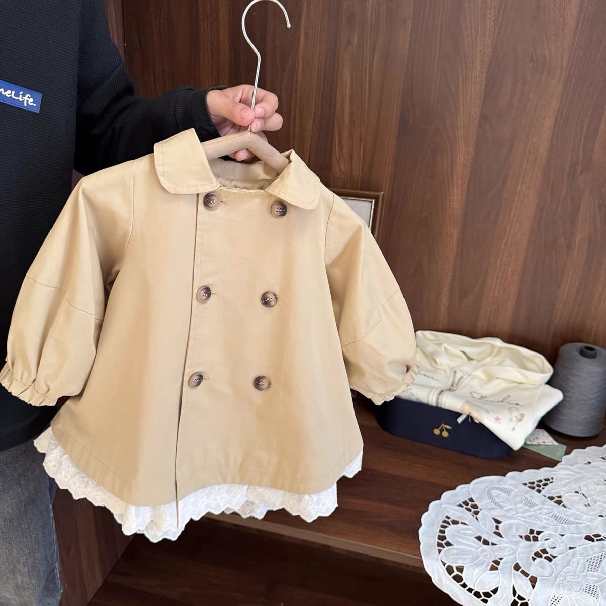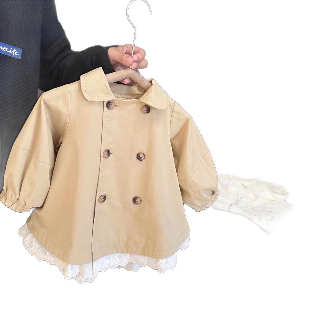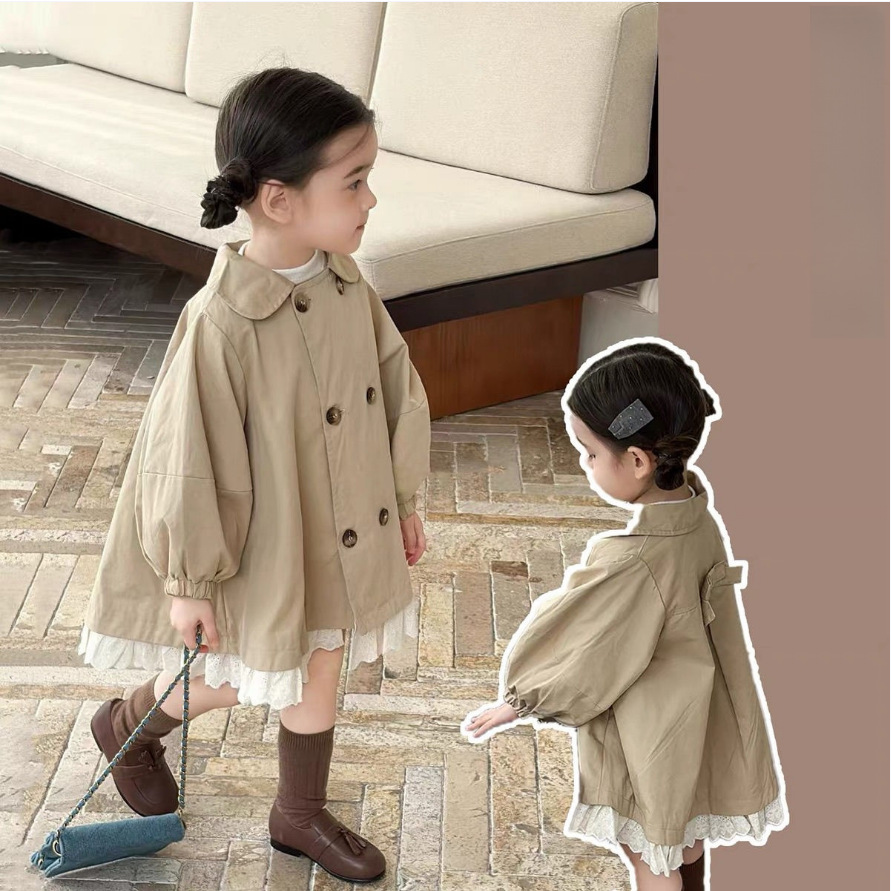 Детское двубортное пальто-тренч средней длины для девочек, новая модель 2026 года, весенне-осенний стиль, британский стиль с кружевной отделкой.