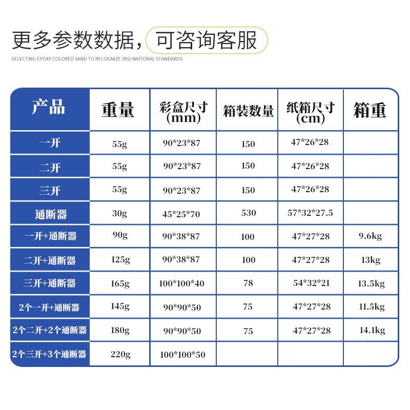 常规箱规:通断器一开+1个通断器,二开+2个通断器 47×27×28 ,一箱100套。(非常规箱规例如不足100套的,需另找纸箱包装)