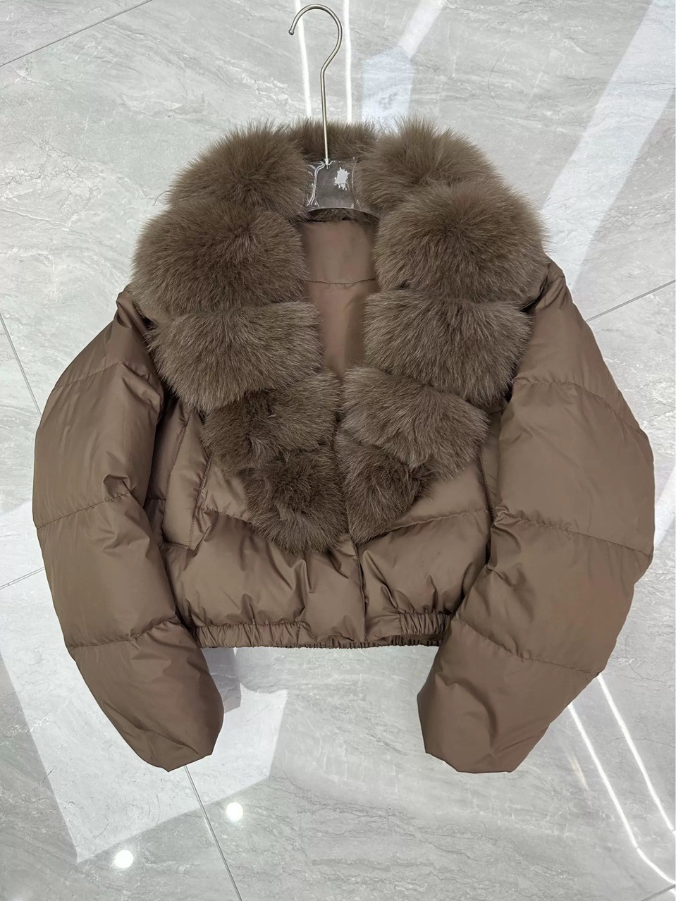 Зимняя женская короткая модная тёплая пуховая куртка с воротником из лисьего меха, больших размеров