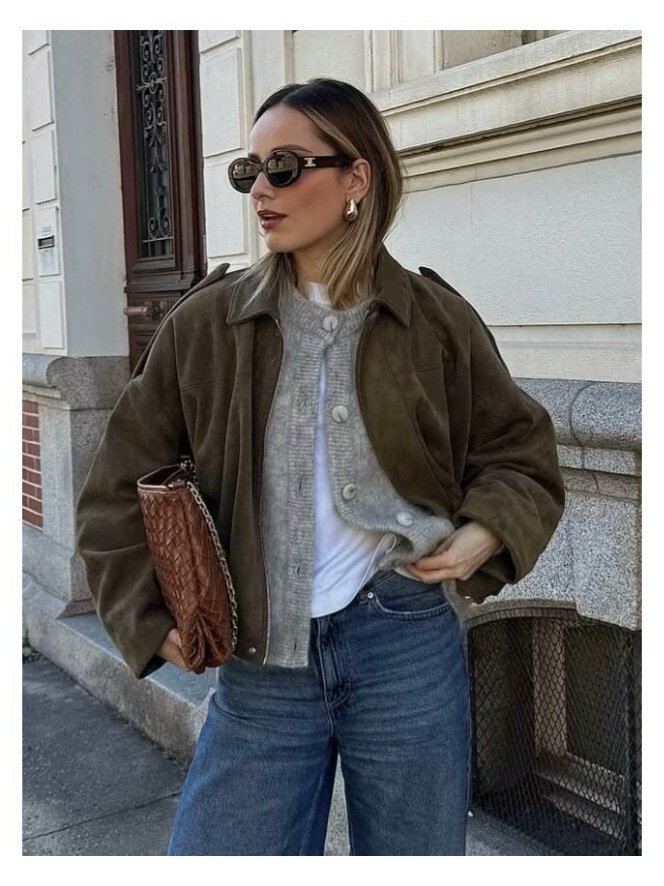 Европейская и американская женская одежда 2025 ранняя весна новая мода замшевая текстура эффект бомбер куртка топ