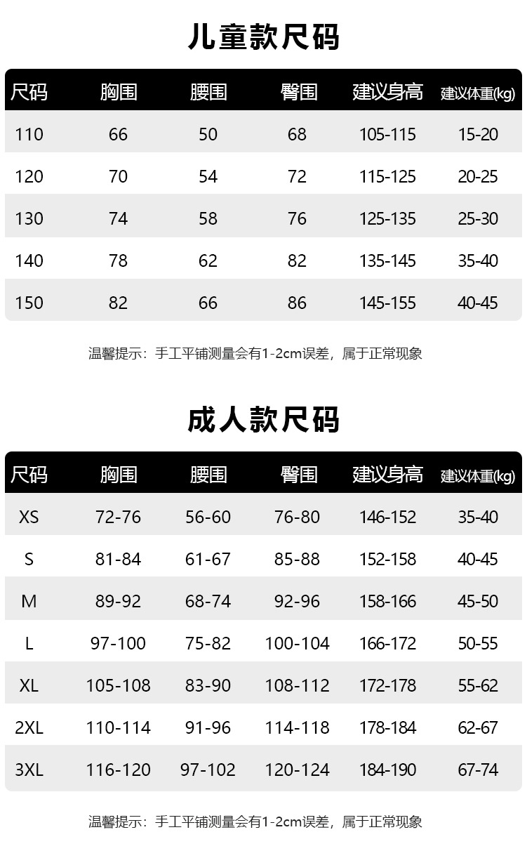 XS; S; M; L; XL; XXL; XXXL; 110; 120; 130; 140; 150; 均码
