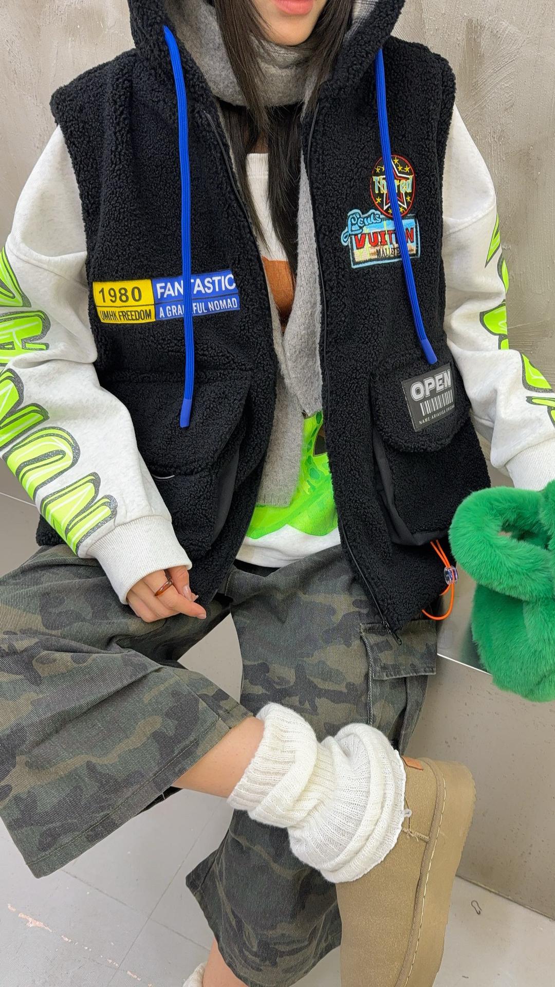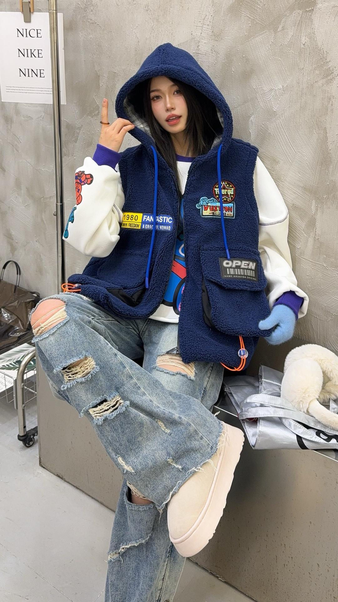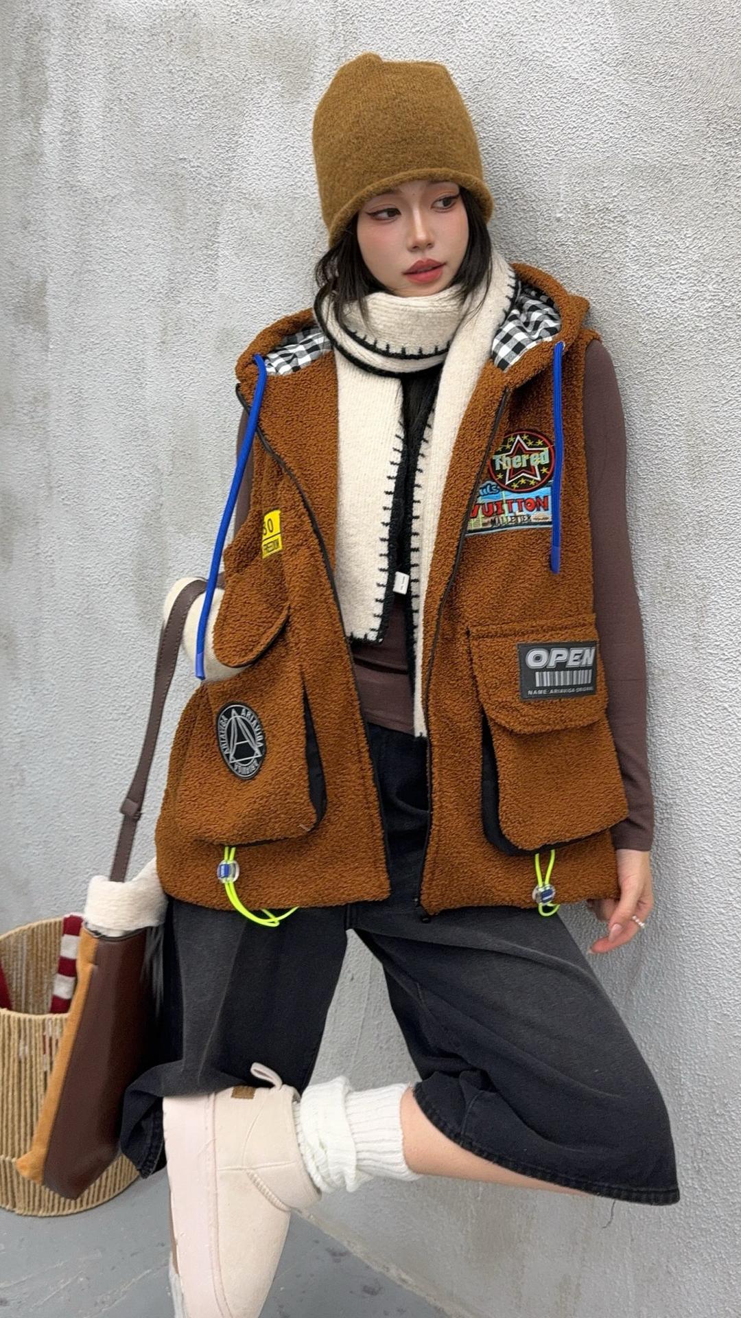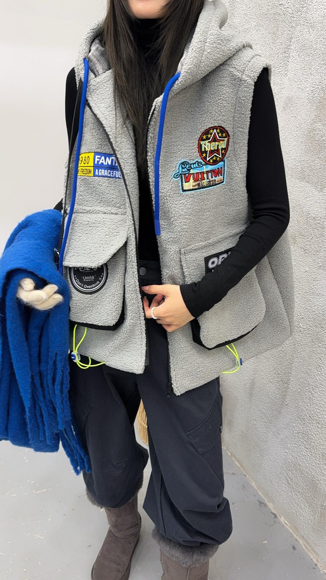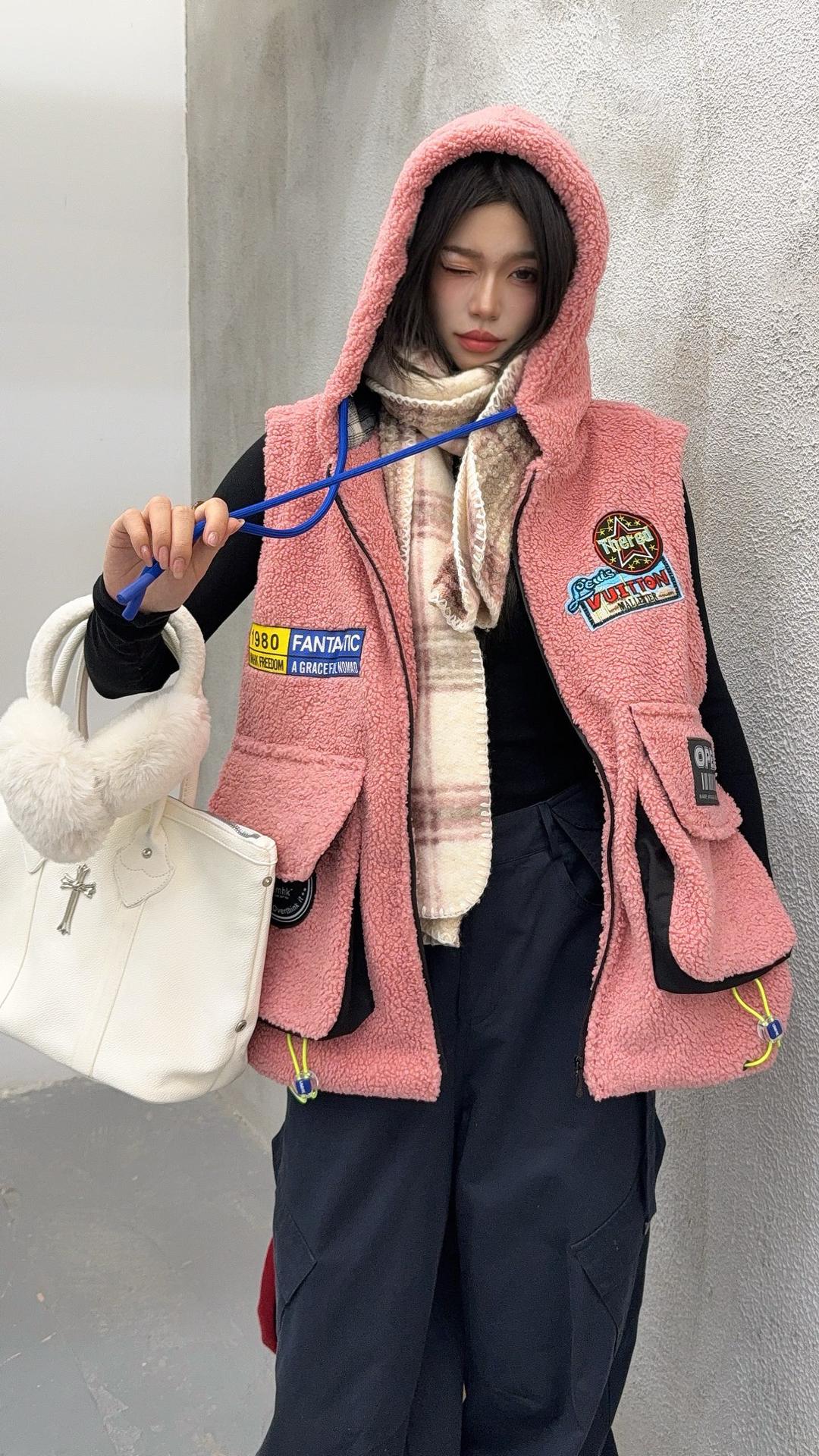 秋冬季新款羊羔绒马甲女士外套坎肩拼接潮流工装大兜抽绳连帽马夹