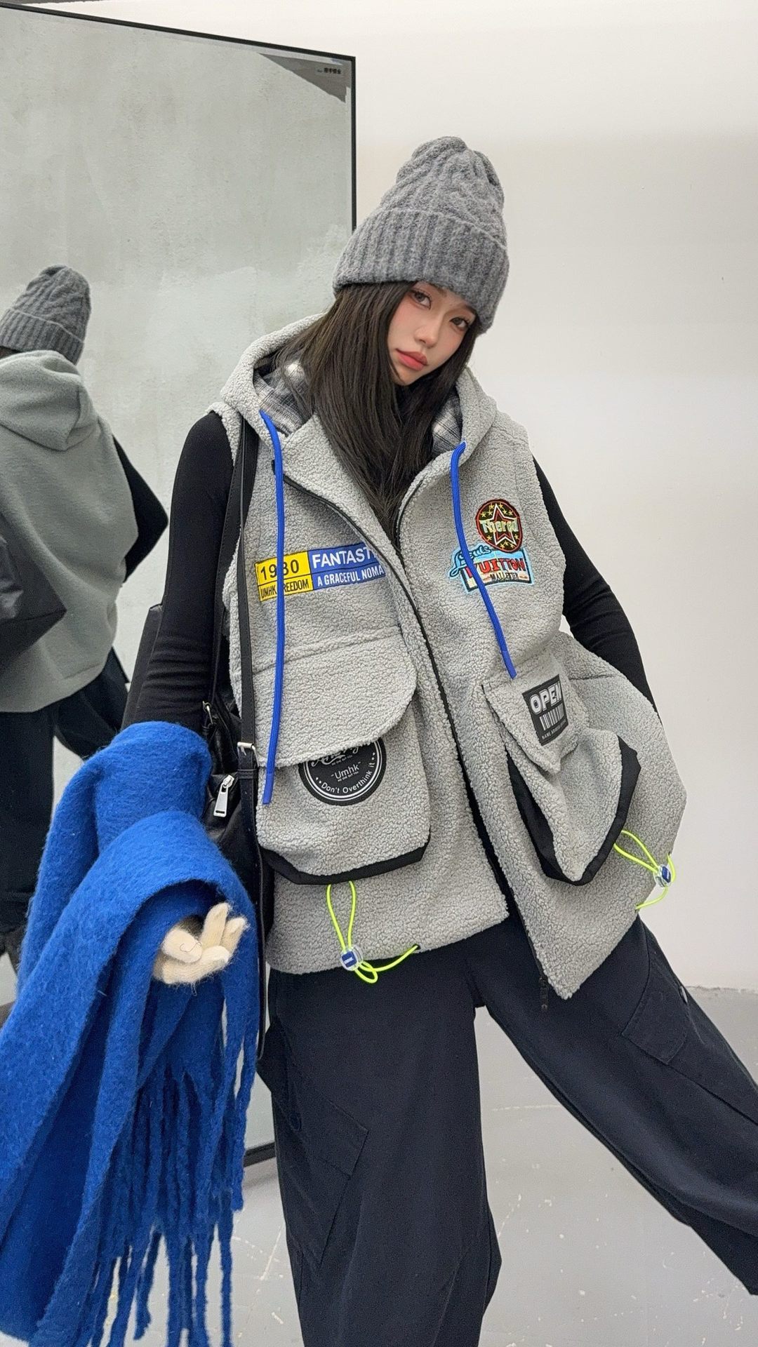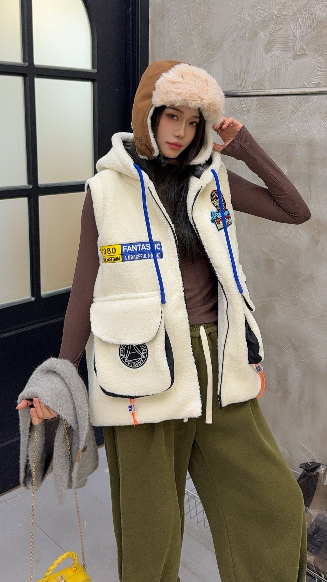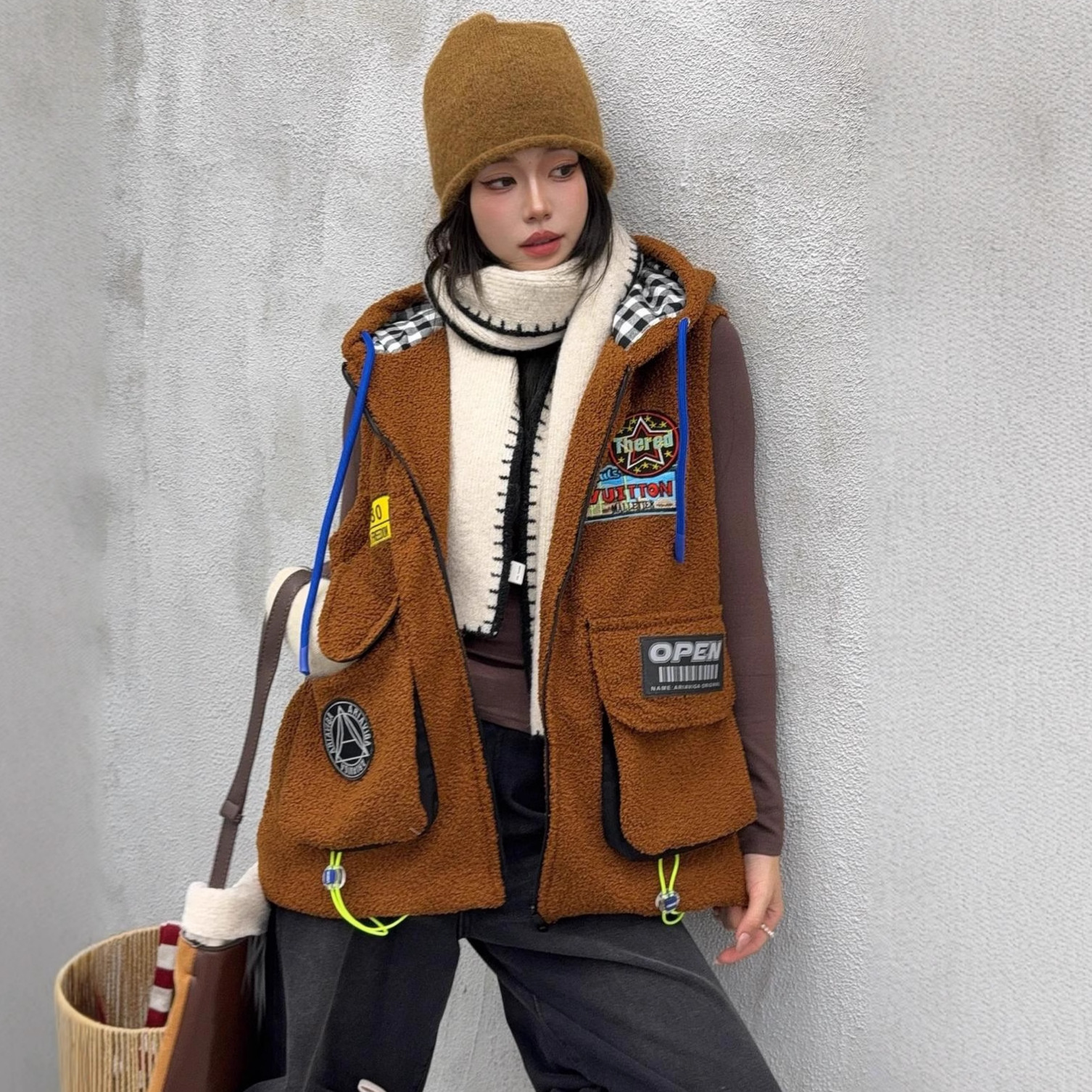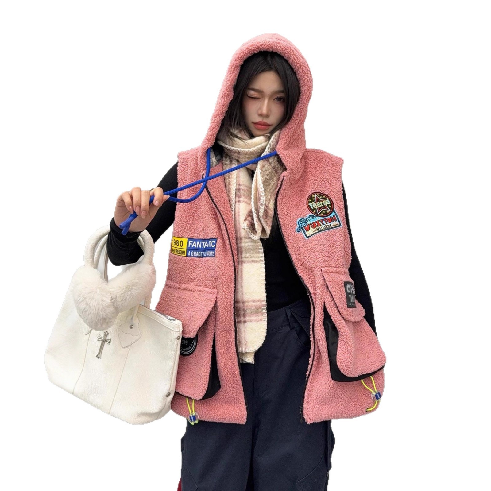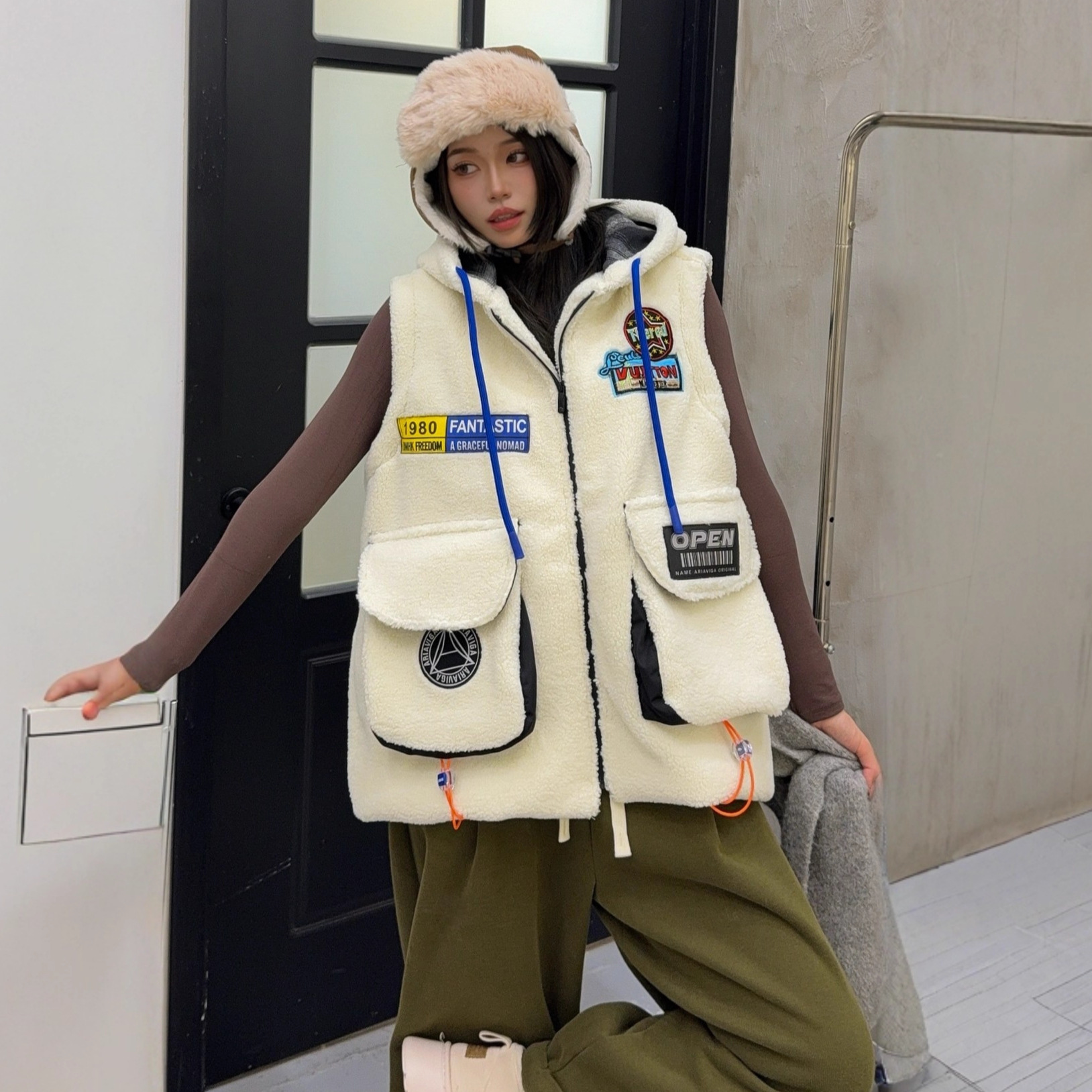 秋冬季新款羊羔绒马甲女士外套坎肩拼接潮流工装大兜抽绳连帽马夹