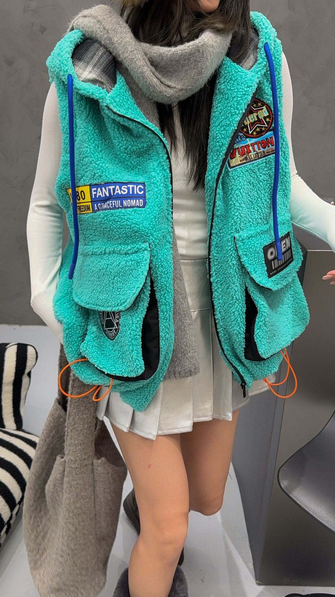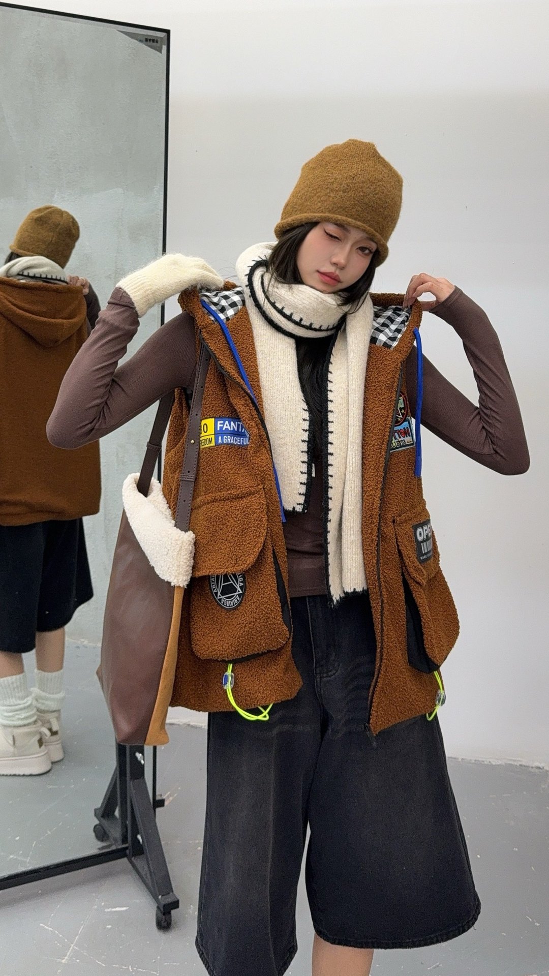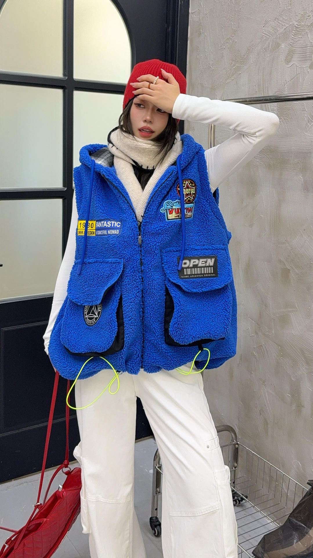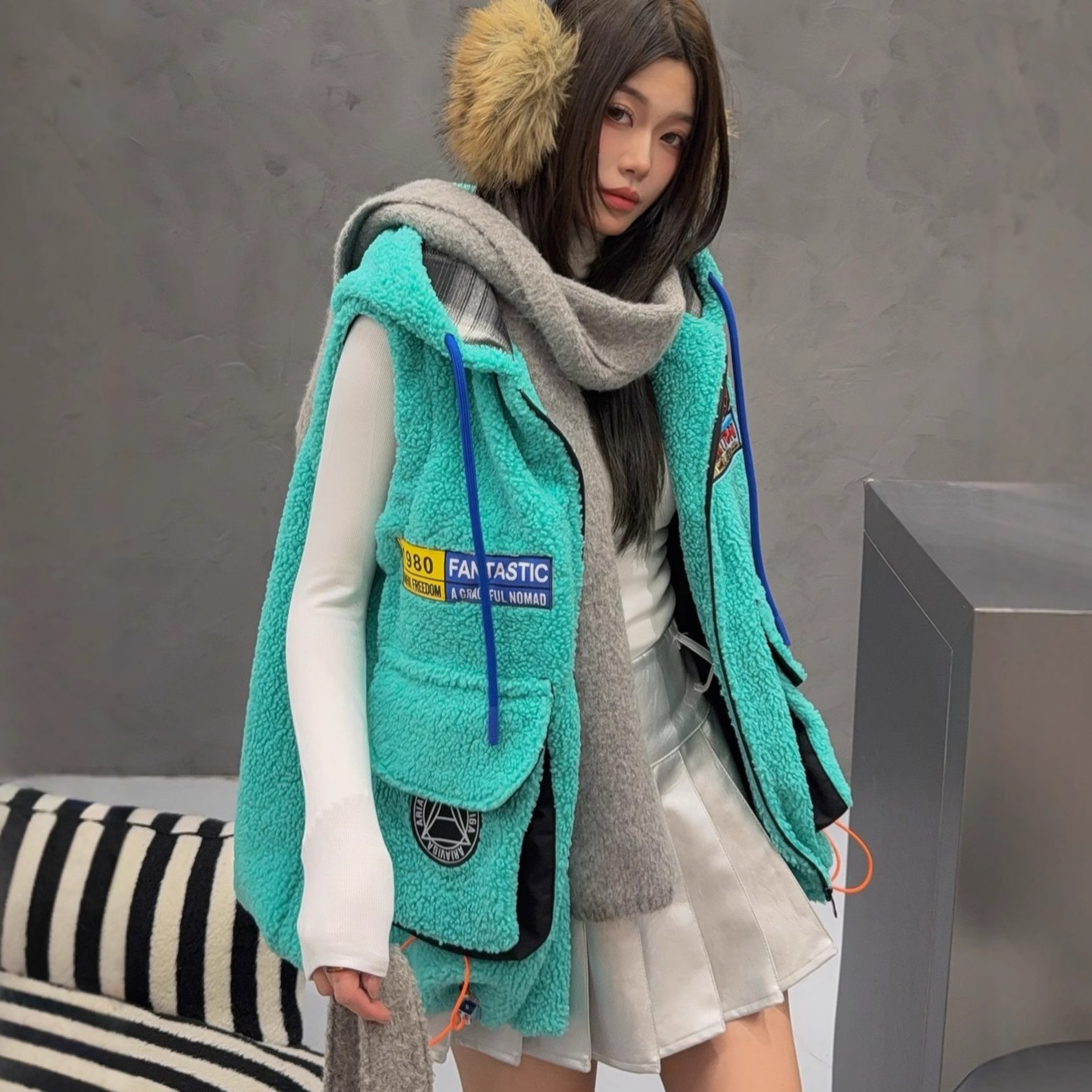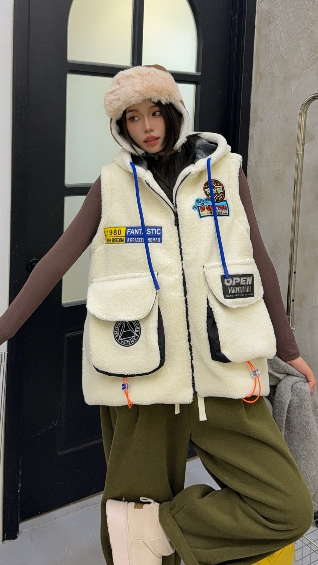 秋冬季新款羊羔绒马甲女士外套坎肩拼接潮流工装大兜抽绳连帽马夹