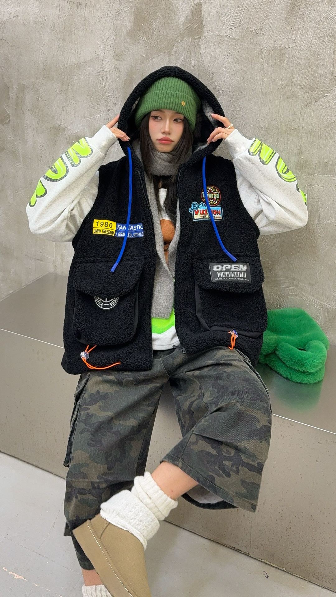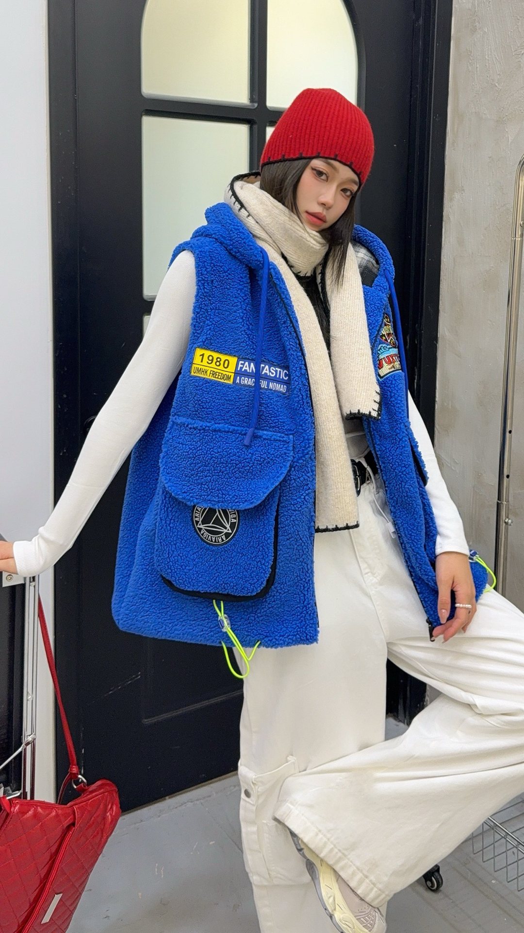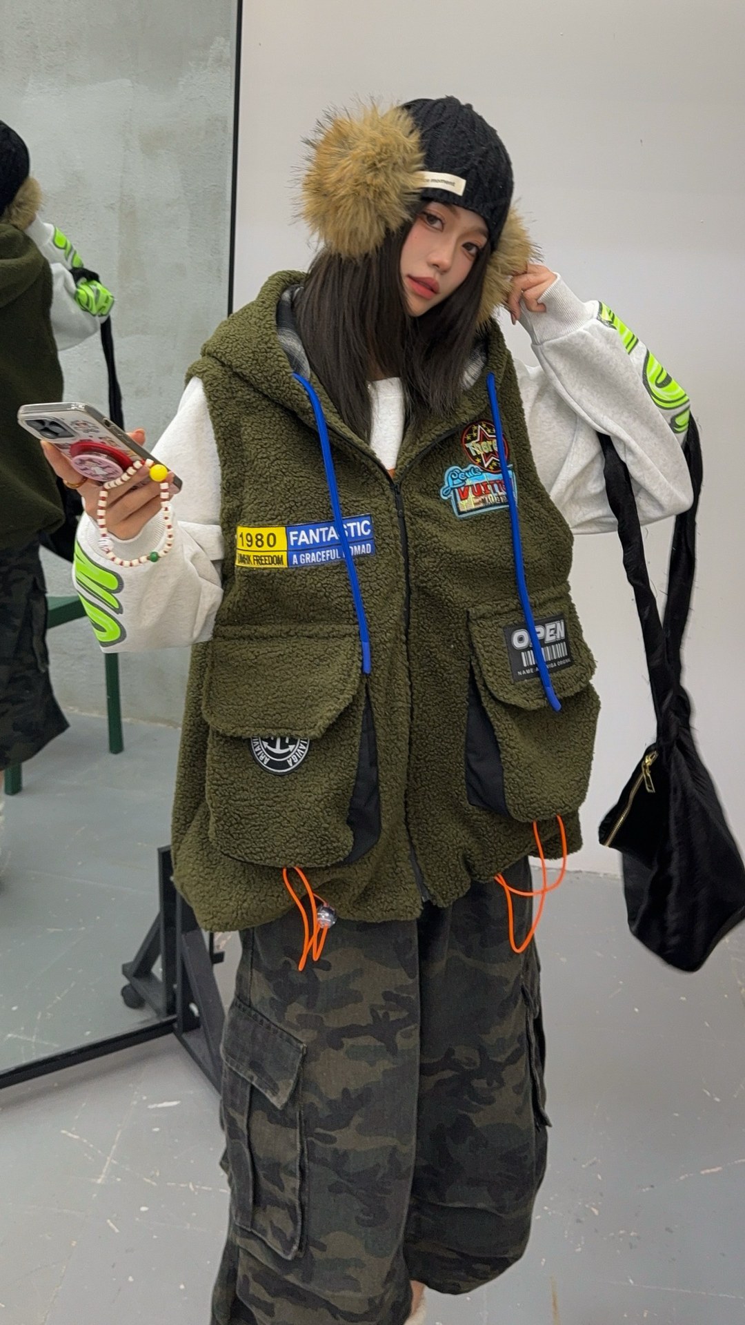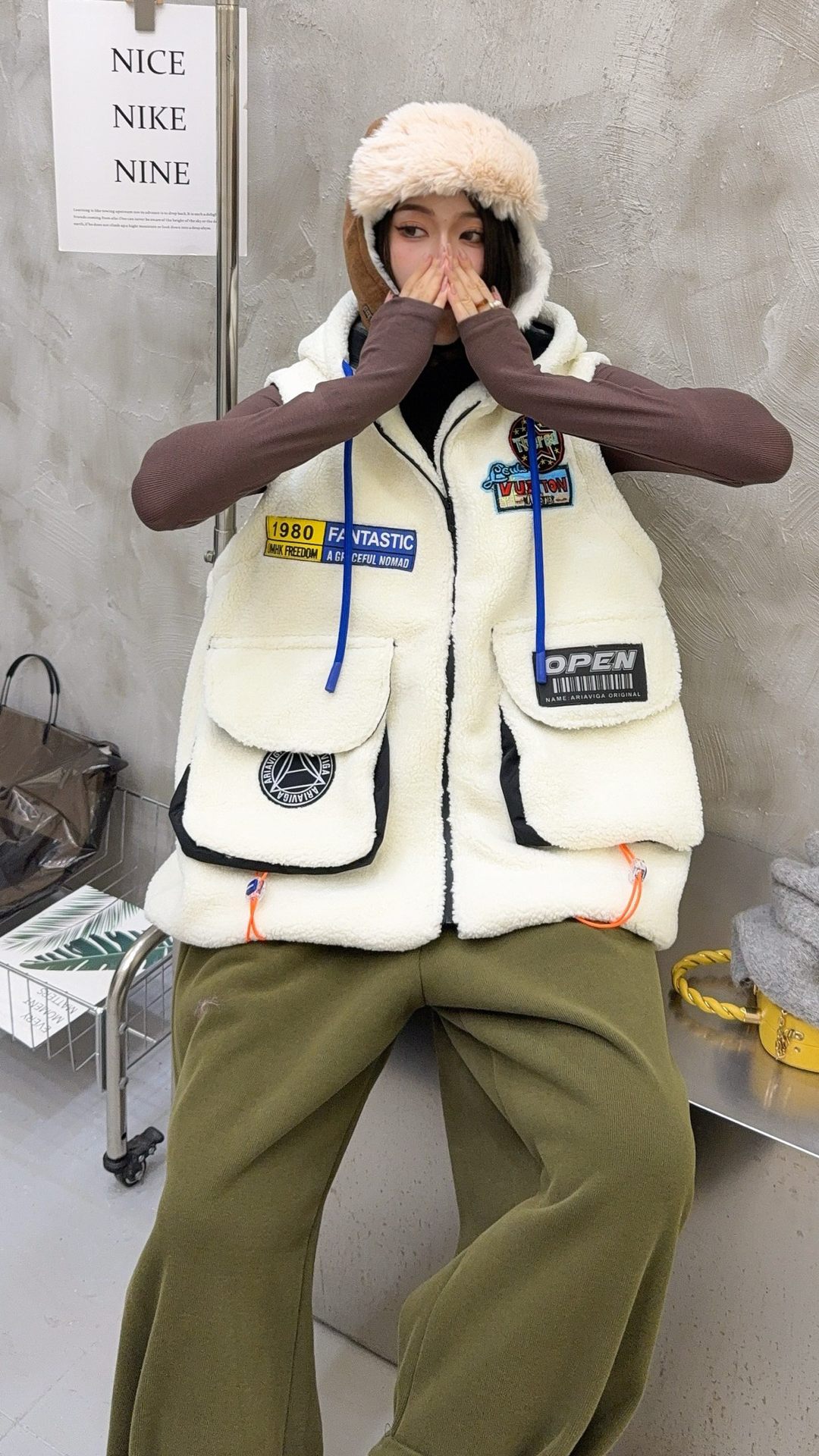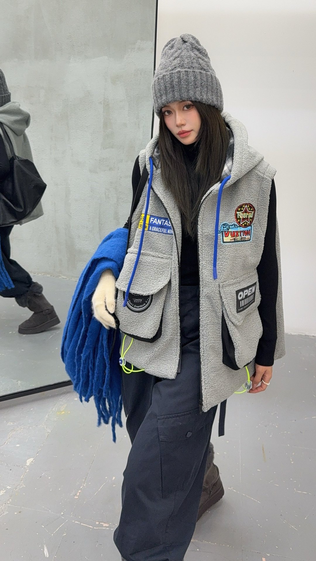秋冬季新款羊羔绒马甲女士外套坎肩拼接潮流工装大兜抽绳连帽马夹