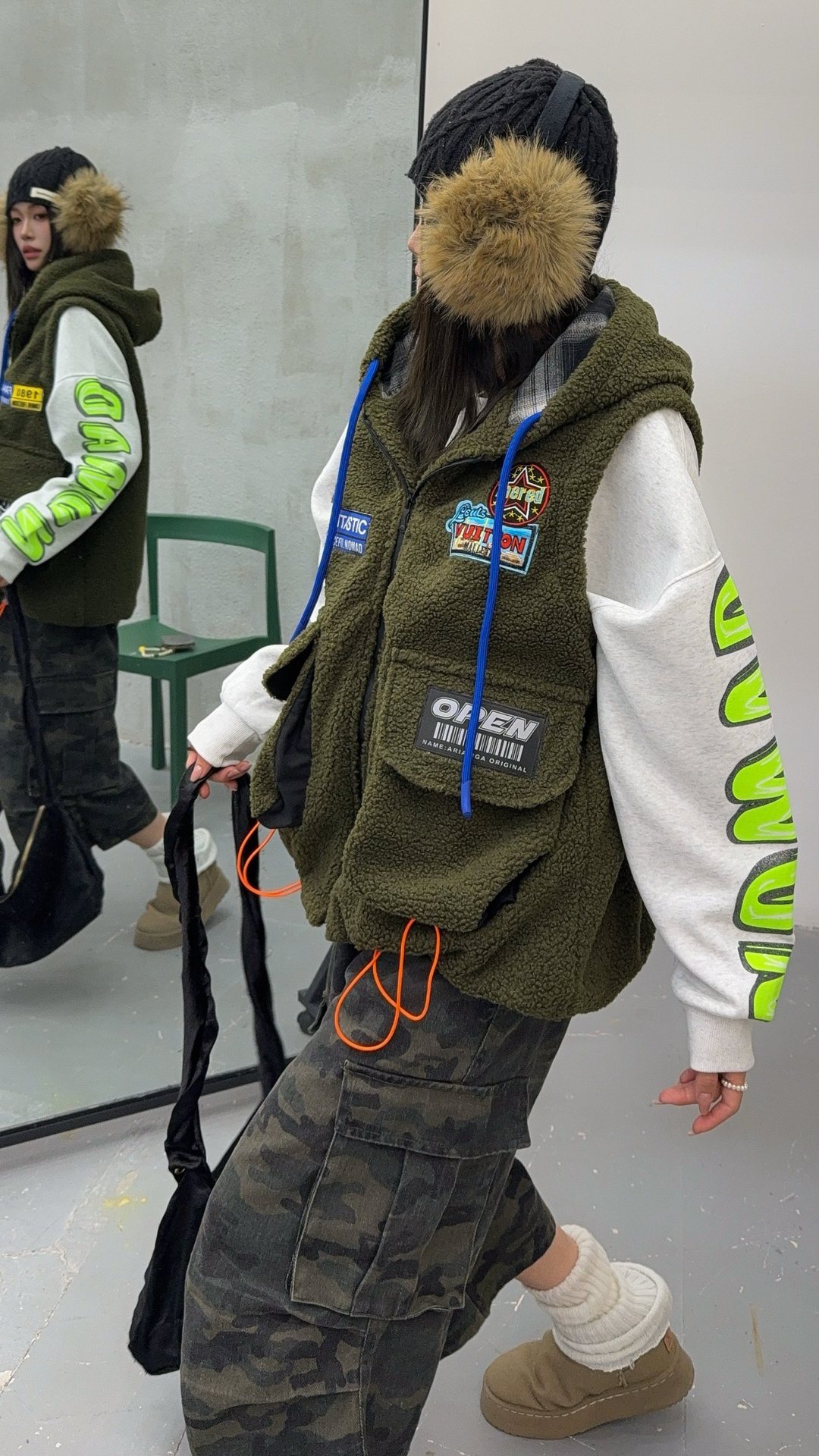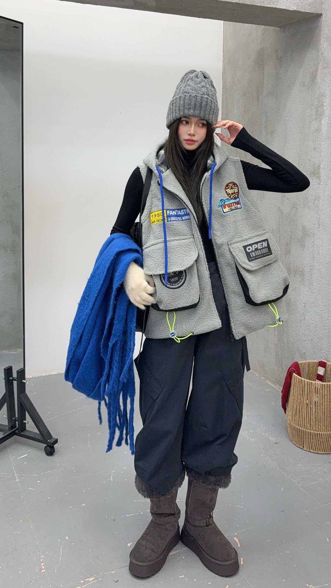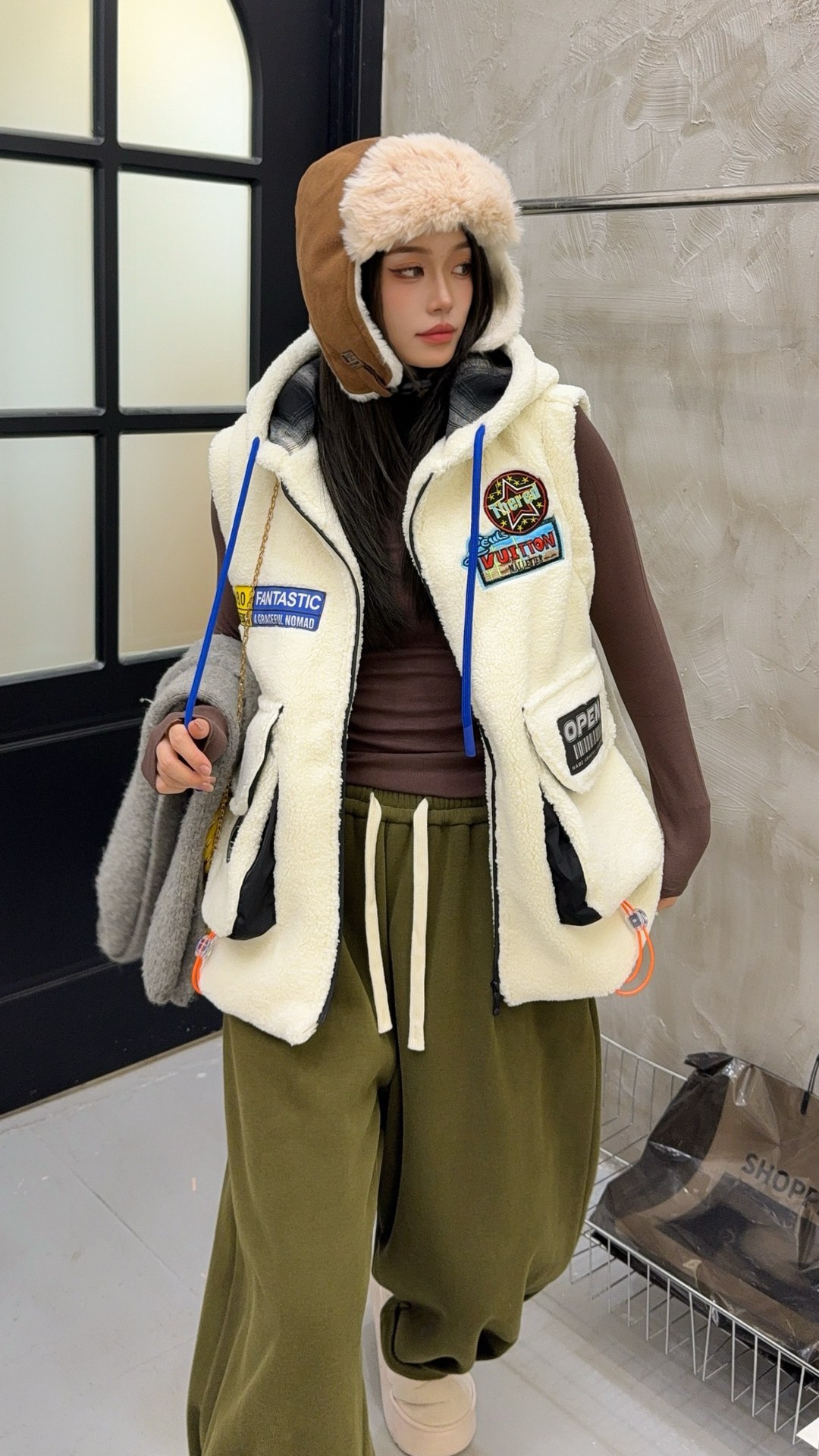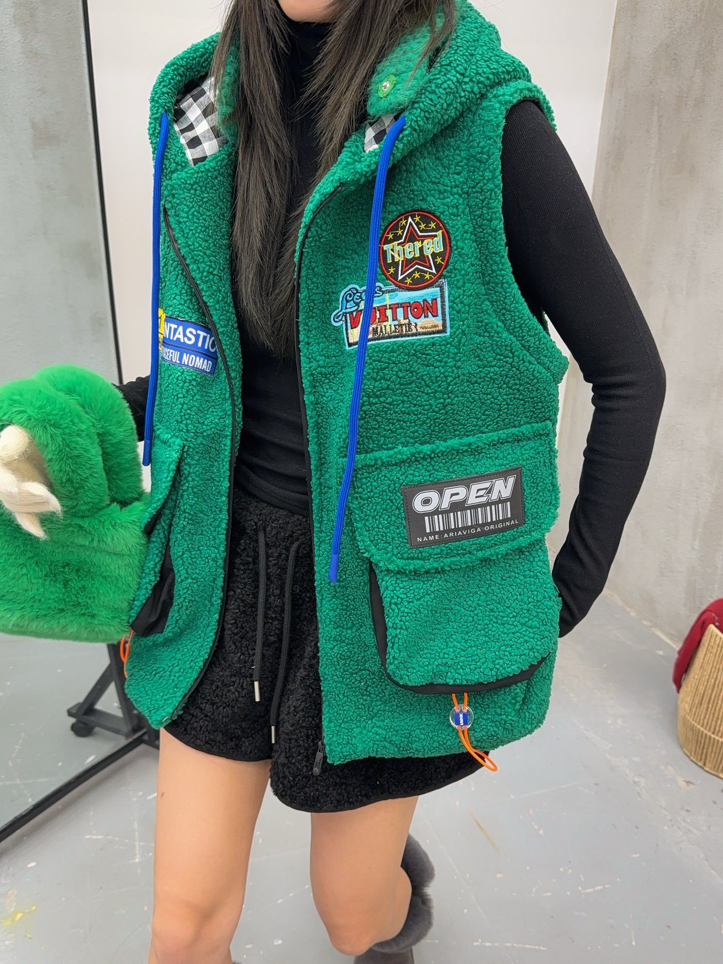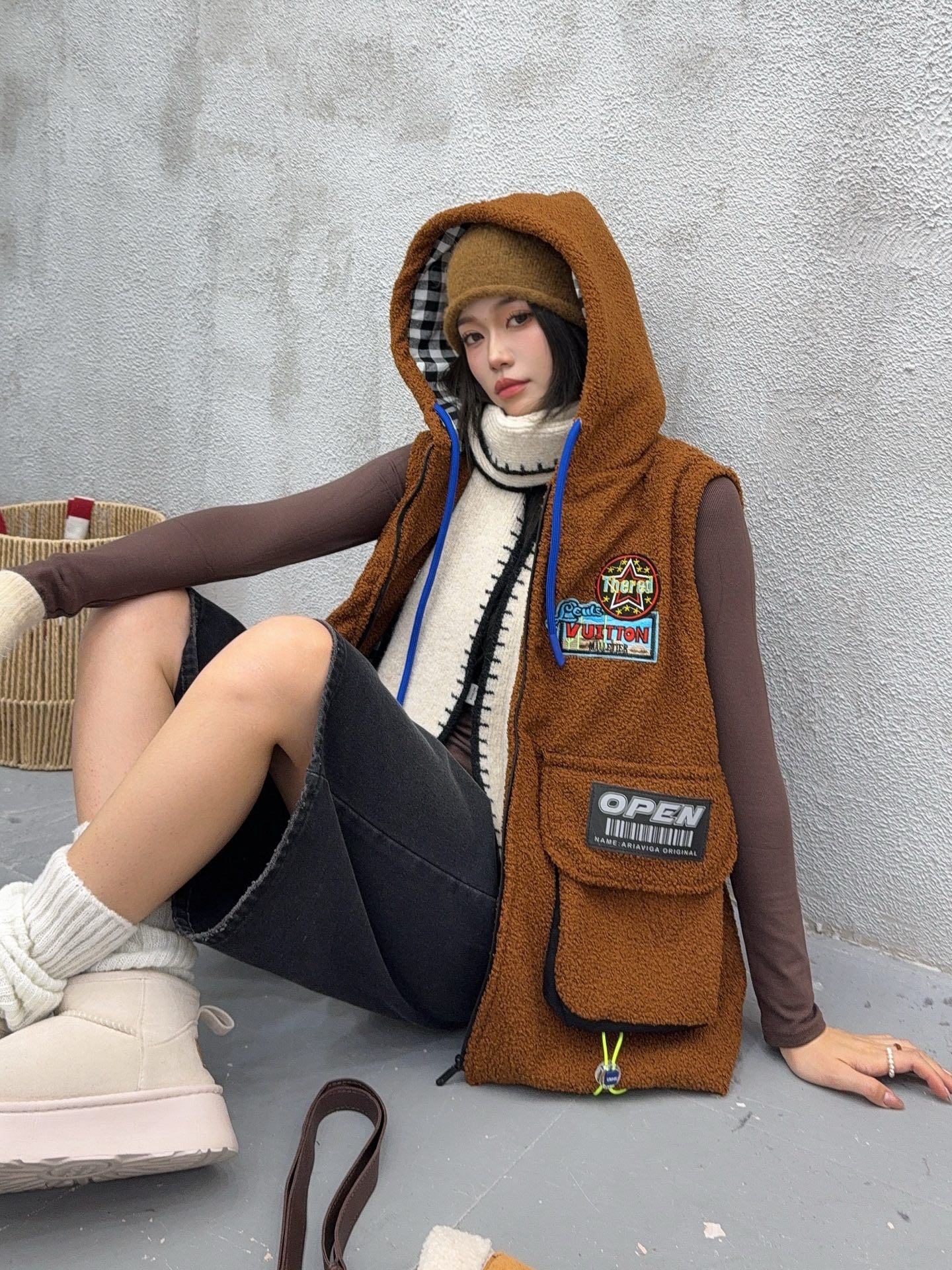 秋冬季新款羊羔绒马甲女士外套坎肩拼接潮流工装大兜抽绳连帽马夹