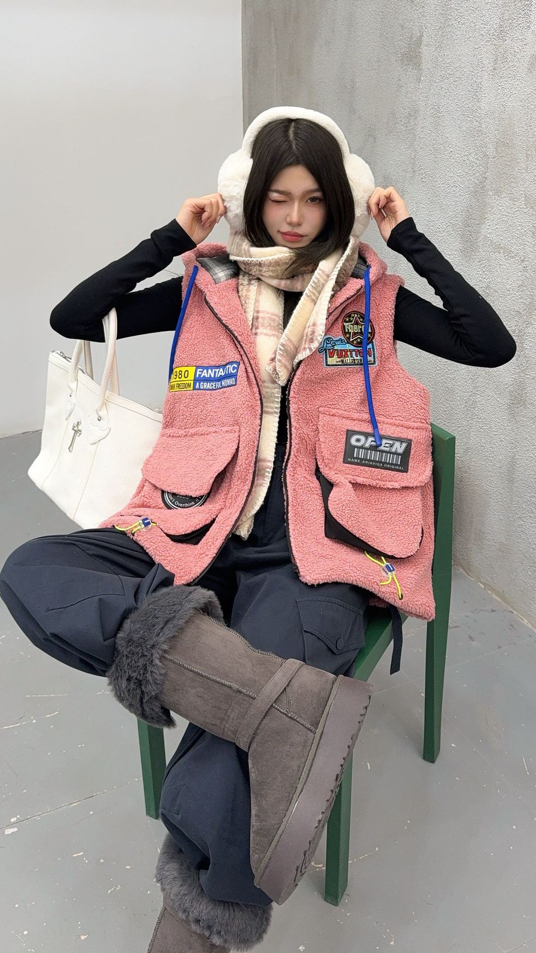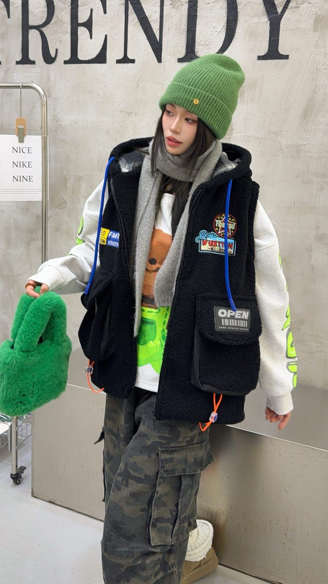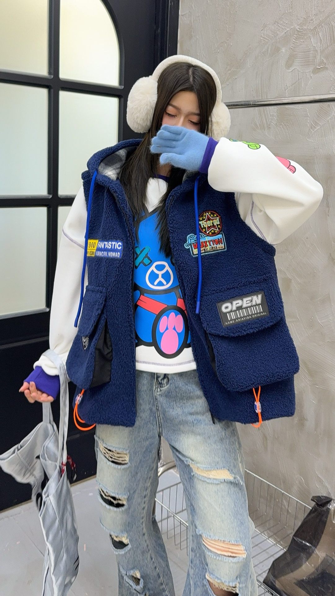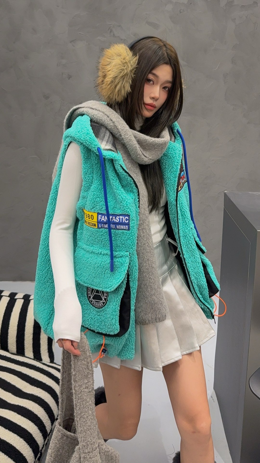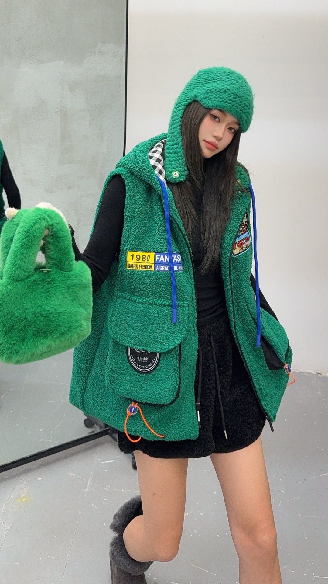 秋冬季新款羊羔绒马甲女士外套坎肩拼接潮流工装大兜抽绳连帽马夹